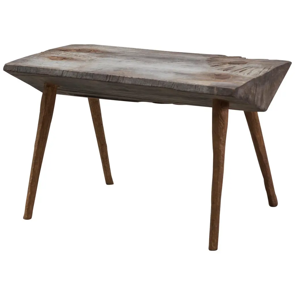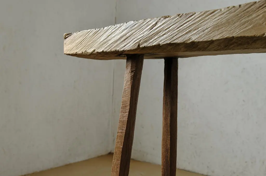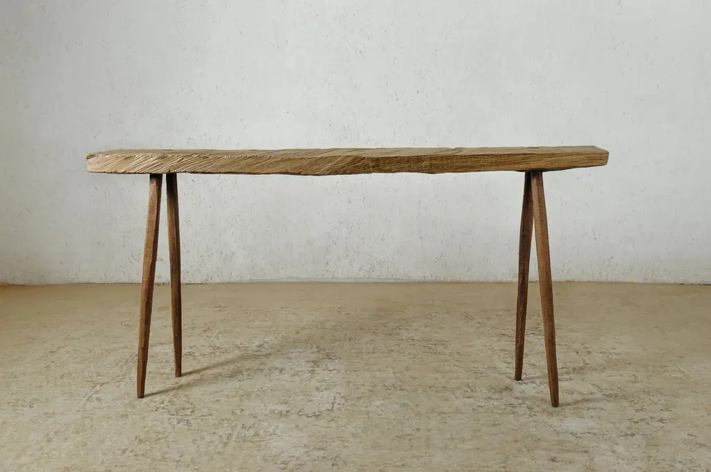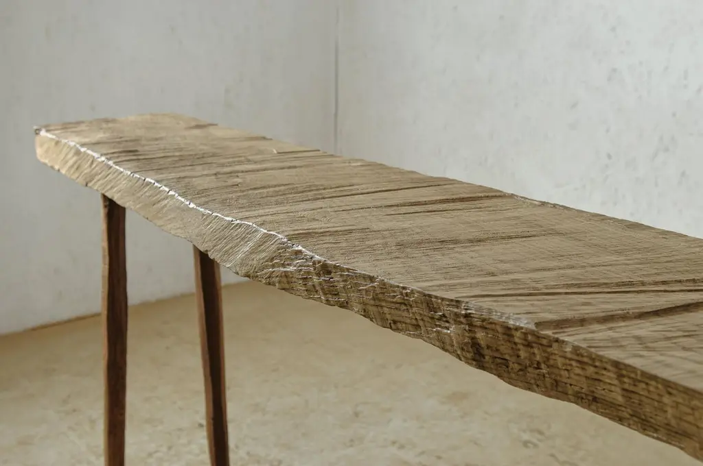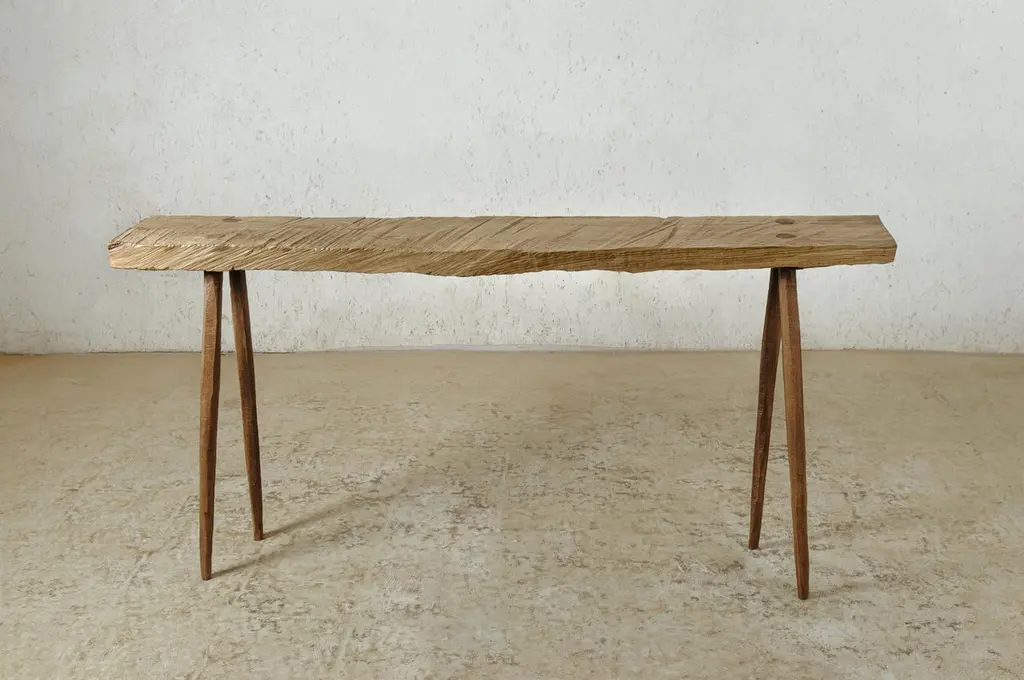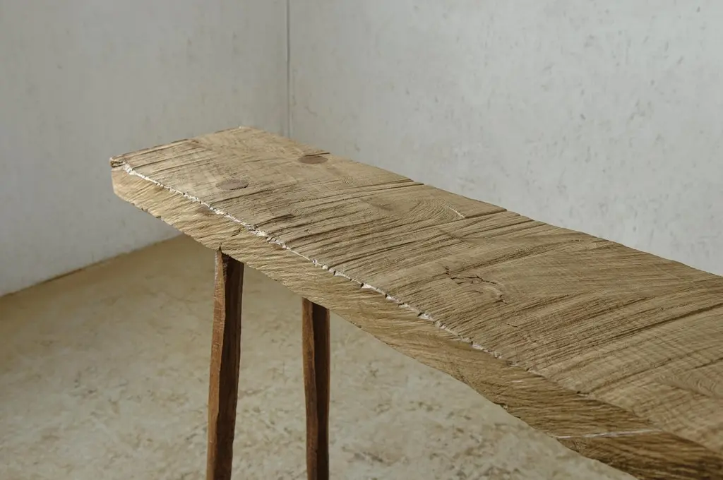 Bench or side table in solid oak (and linseed oil)(Outdoor use OK)Custom sizeSÓHA design studio conceives and produces furniture design and decorative objects in solid oak in an authentic style. Inspiration to create all these items comes from the Russian North aesthetics with its severe nature, log huts black from time and climate and scant patterns. Wood is masterfully hand processed with chainsaw or chisel, whereby producing beautiful surface patterns. The wood is soaked in boiling baths of linseed oil, creating this special patina and making each creation a very unique piece. Reacting with tanning substances under high temperature, oil gives the objects expressive and natural colours, from light brown to charcoal-black. SÓHA offers a vast array of neo-primitivist interior objects. Our kitchen utensil, wall panels, sculptures and furniture solutions are executed in one unique style and will organically fit into the interior of your home. Each piece is one-of-a-kind handmade product.Unique piece made to order.