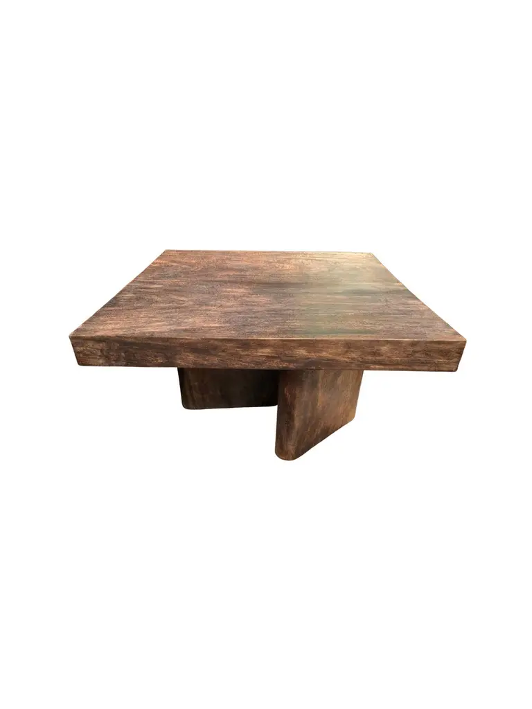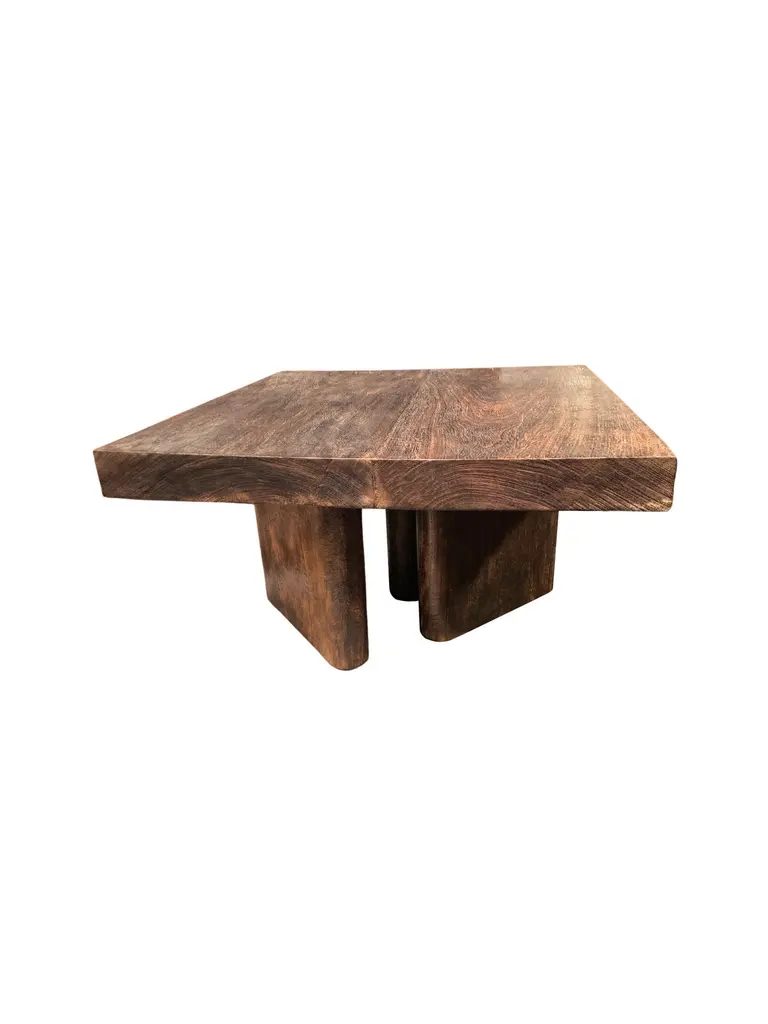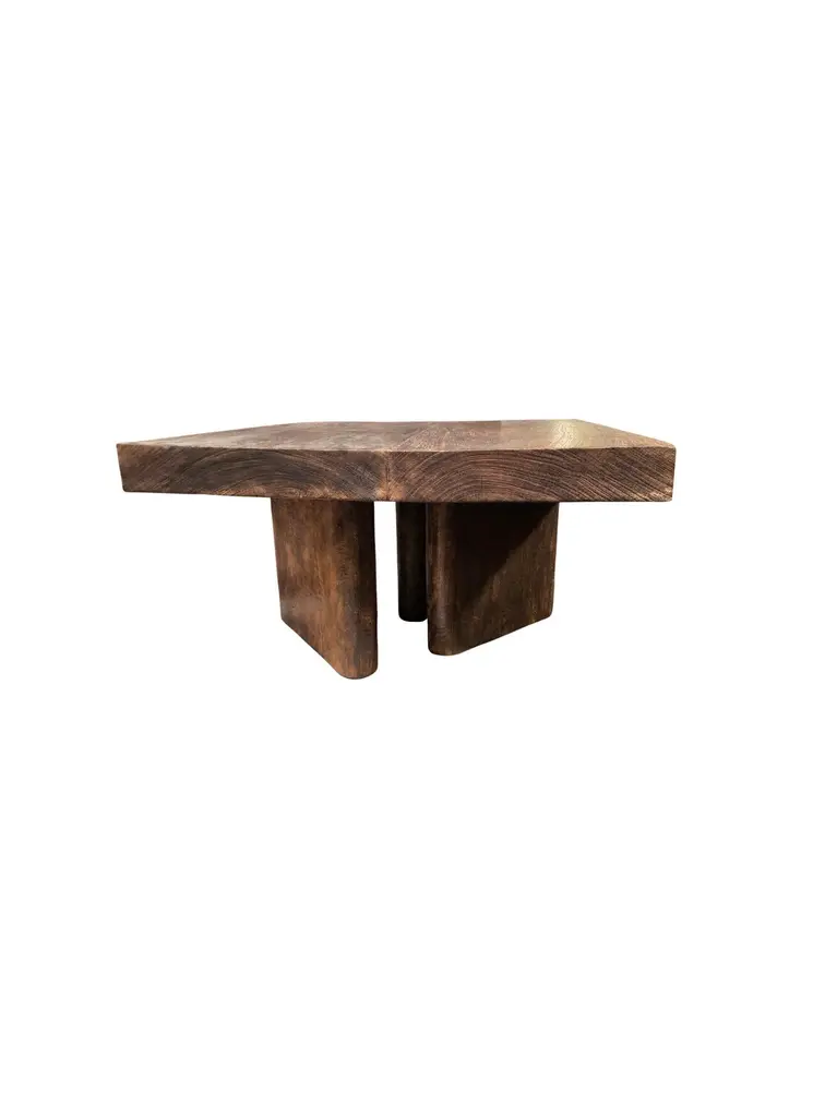 A sculptural mango wood bench with an espresso pigment. The mix of curved and straight lines and subtle wood texture make for a very elegant table. Unique to this bench are the 3 angular legs it sits on. These legs feature curved edges to provide contrast to the table top which comprises of straight edges. The legs are arranged in an angular formation which allows the table to take on a varied forms depending on which angle you view it from. A wonderful addition to any space.