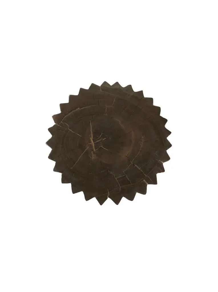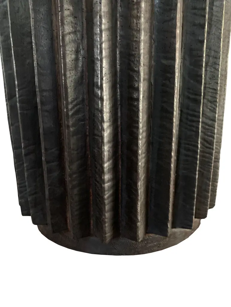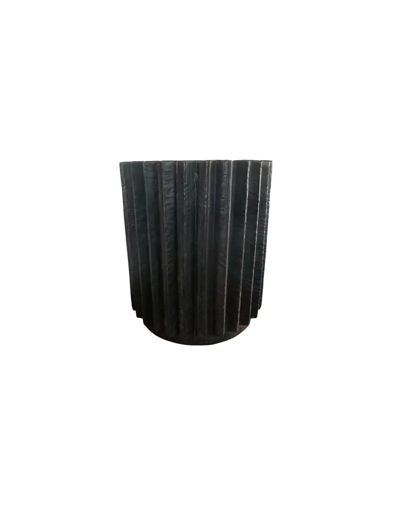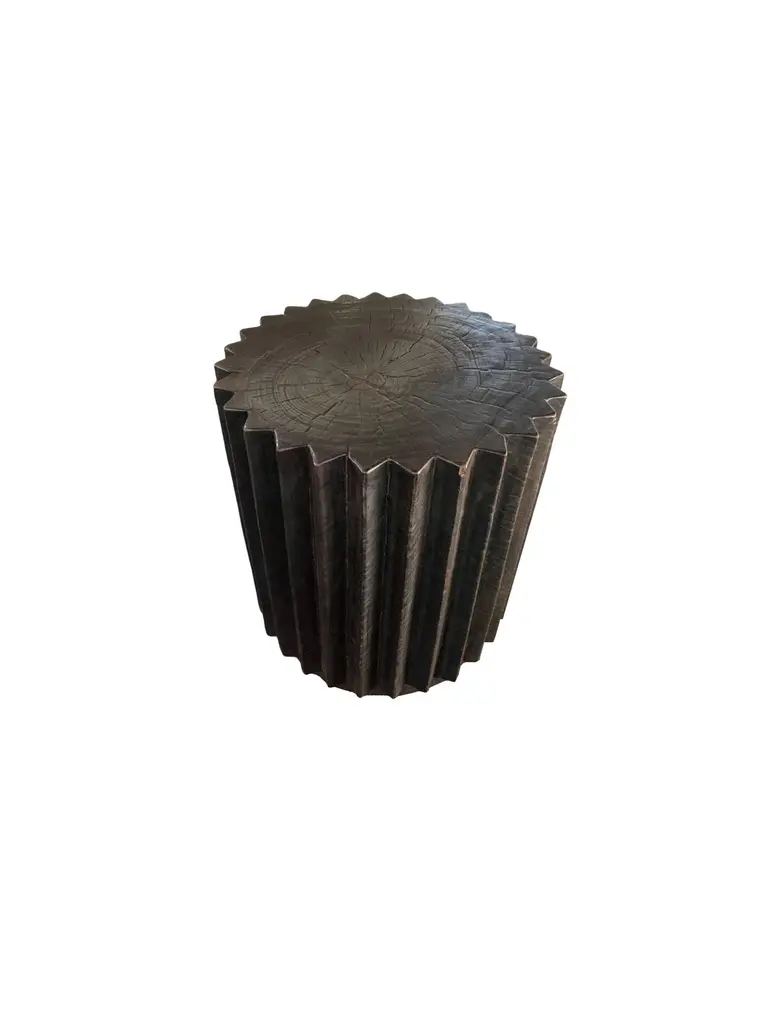 A wonderfully sculptural round side table with a hand-carved, ribbed design on its exterior. Its rich black pigment was achieved through burning the wood three times. Its neutral pigment and subtle wood texture makes it perfect for any space. A uniquely sculptural and versatile piece certain to invoke conversation. This table was crafted from a solid block of mango wood and has a smooth texture.