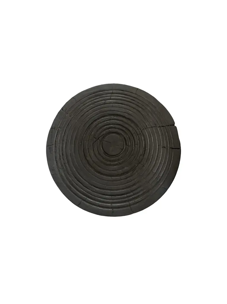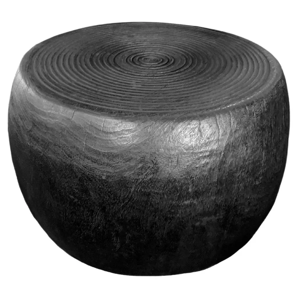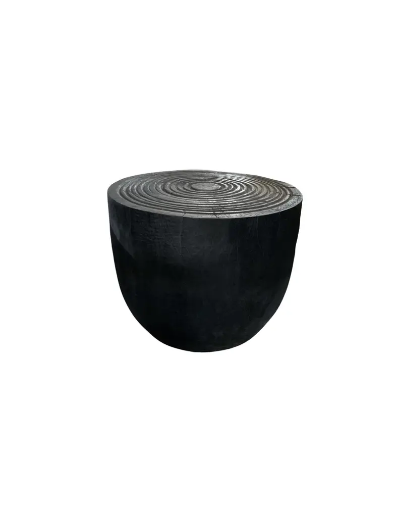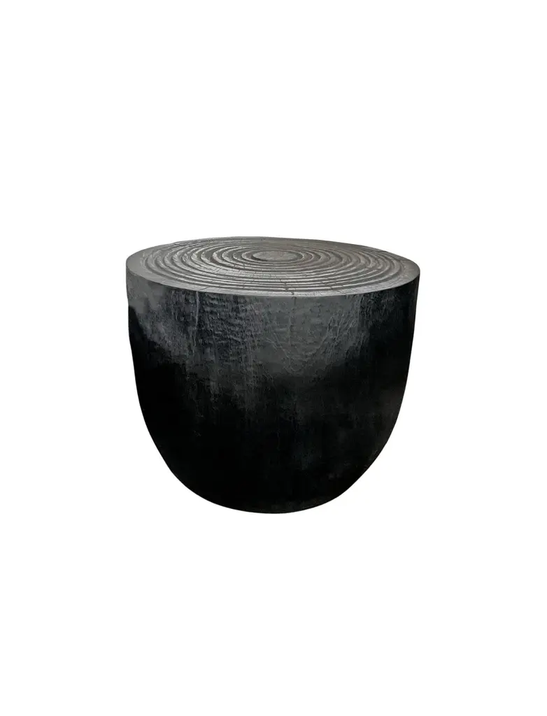 A wonderfully sculptural round side table with a hand-carved, ribbed design on its top side. Its rich black pigment was achieved through burning the wood three times. Its neutral pigment and subtle wood texture makes it perfect for any space. A uniquely sculptural and versatile piece certain to invoke conversation. This table was crafted from a solid block of mango wood and has a smooth texture.