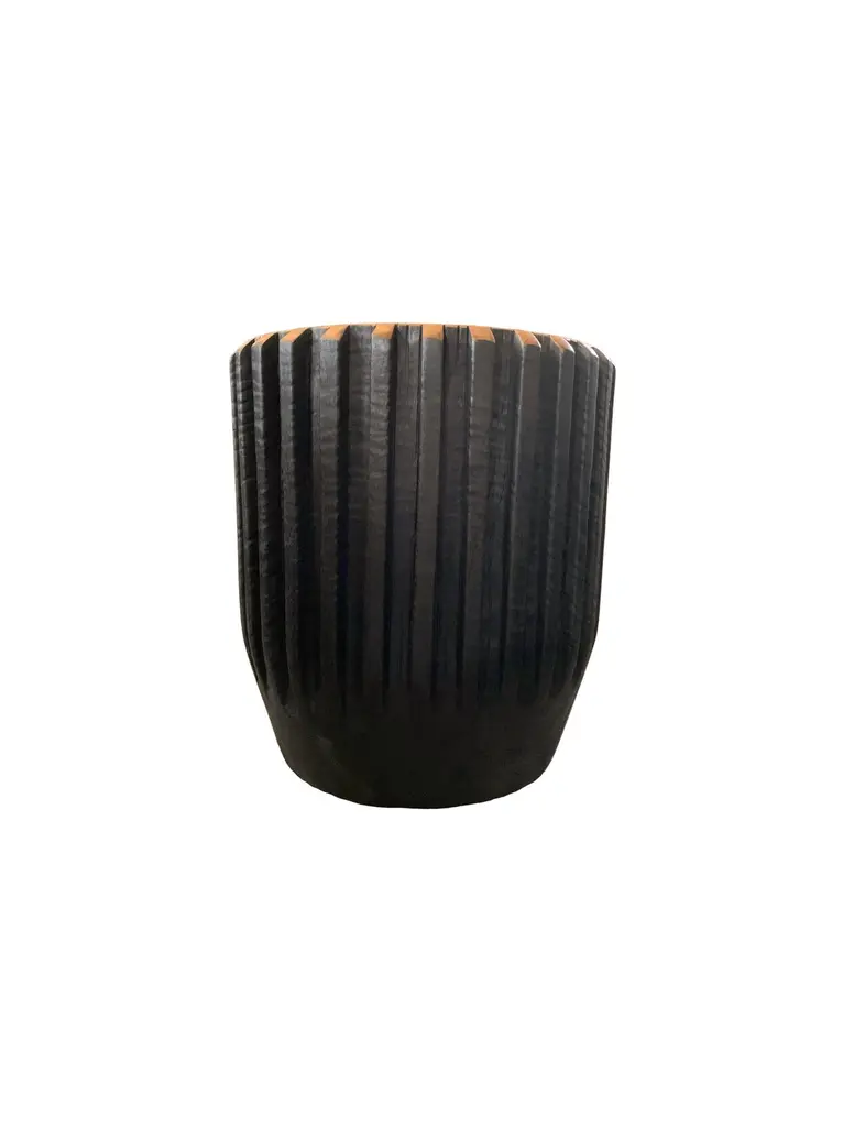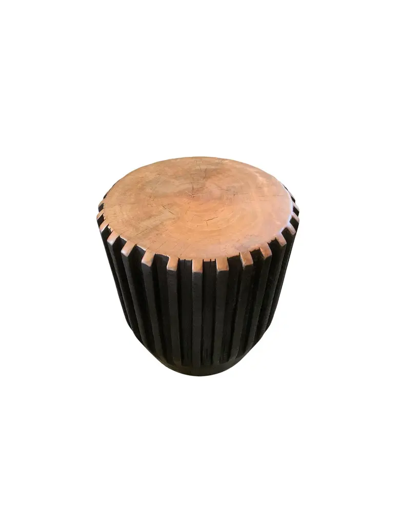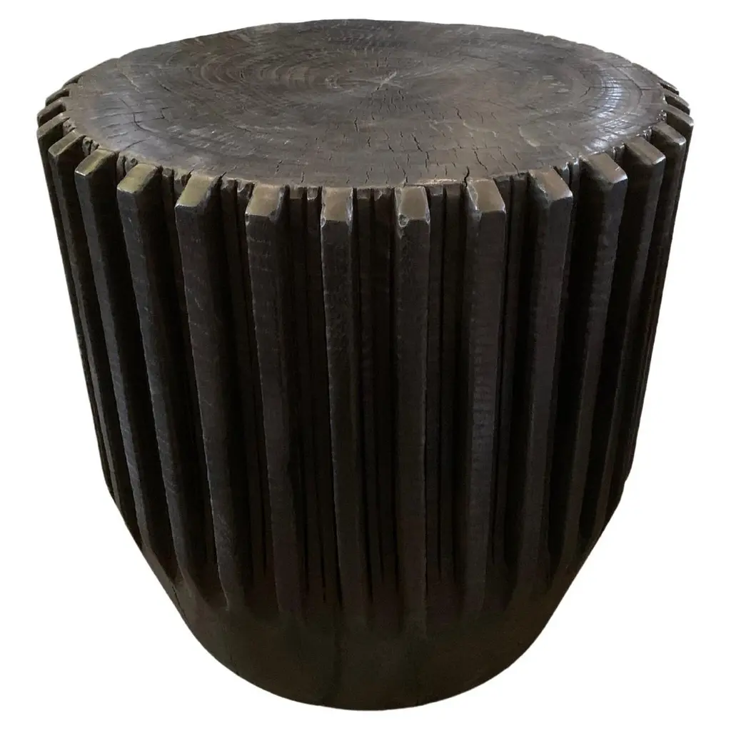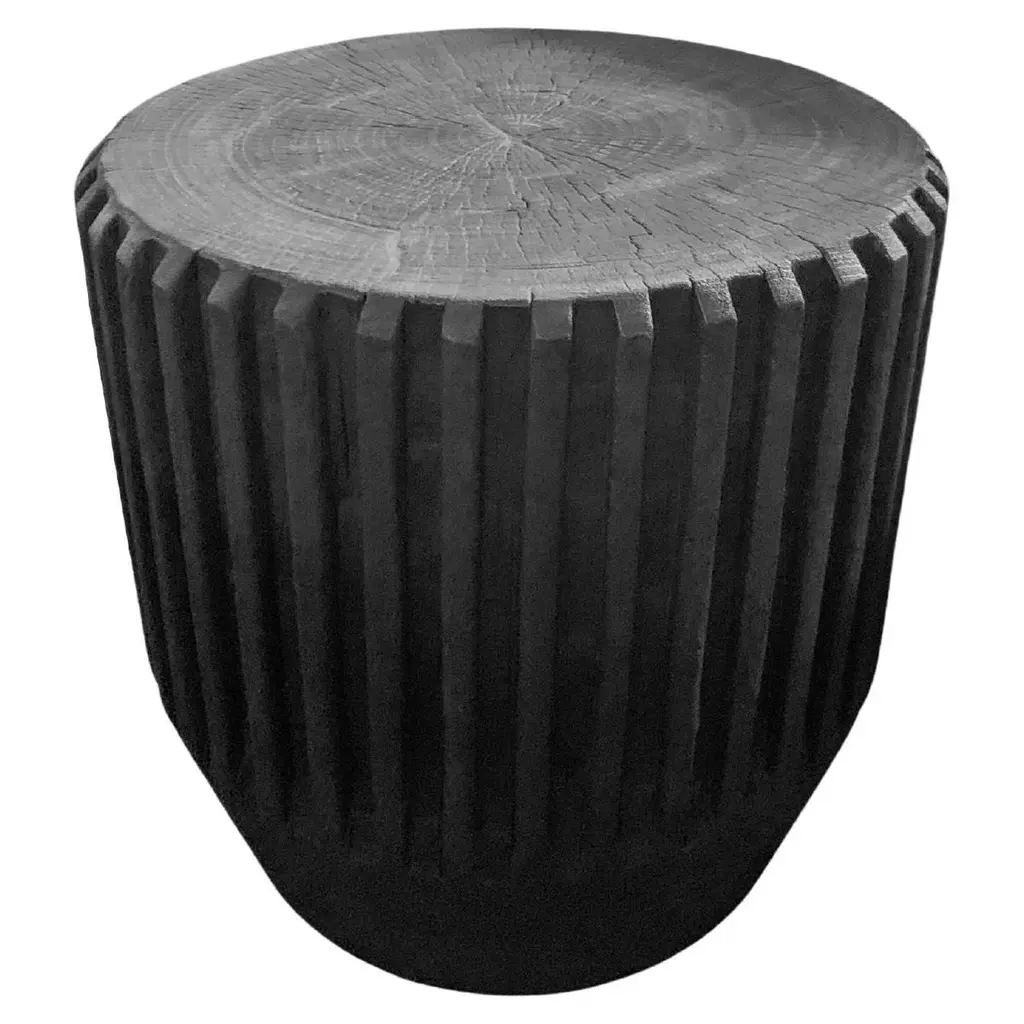 A wonderfully sculptural round side table with a hand-carved, ribbed design on its exterior. Its rich black pigment was achieved through burning the wood three times. Its top side does not possess a burnt finish but a natural polished finished providing a contrast is both textures and tones. The tables neutral pigment and subtle wood texture makes it perfect for any space. A uniquely sculptural and versatile piece certain to invoke conversation. This table was crafted from a solid block of mango wood and has a smooth texture.