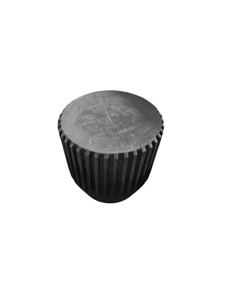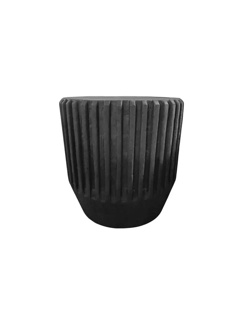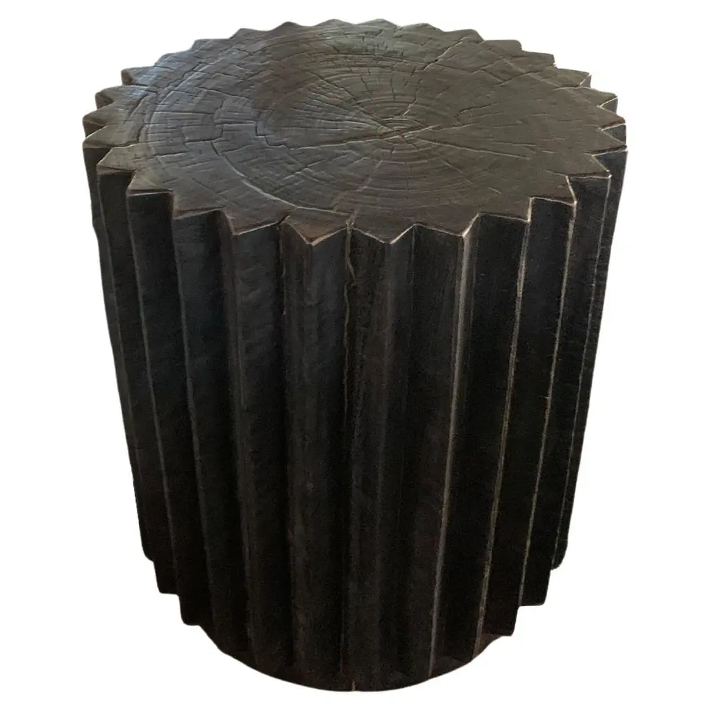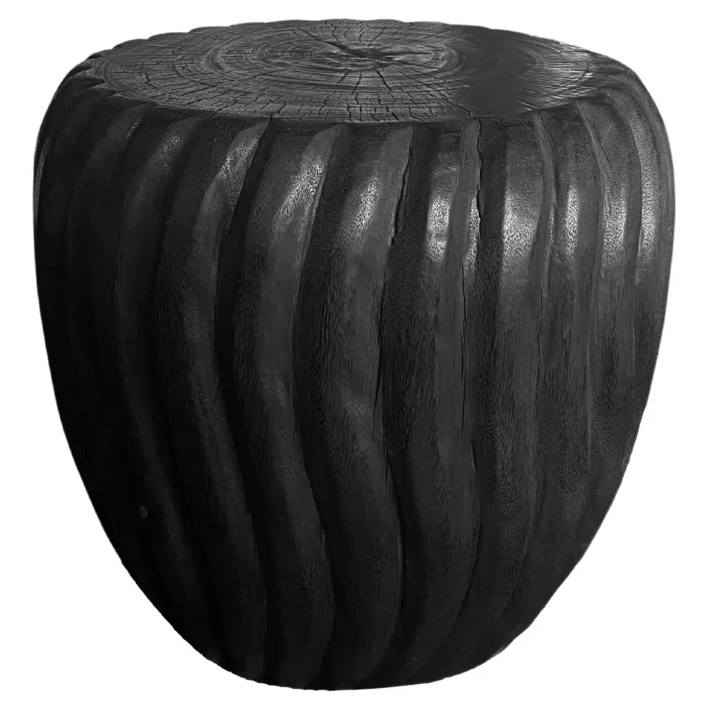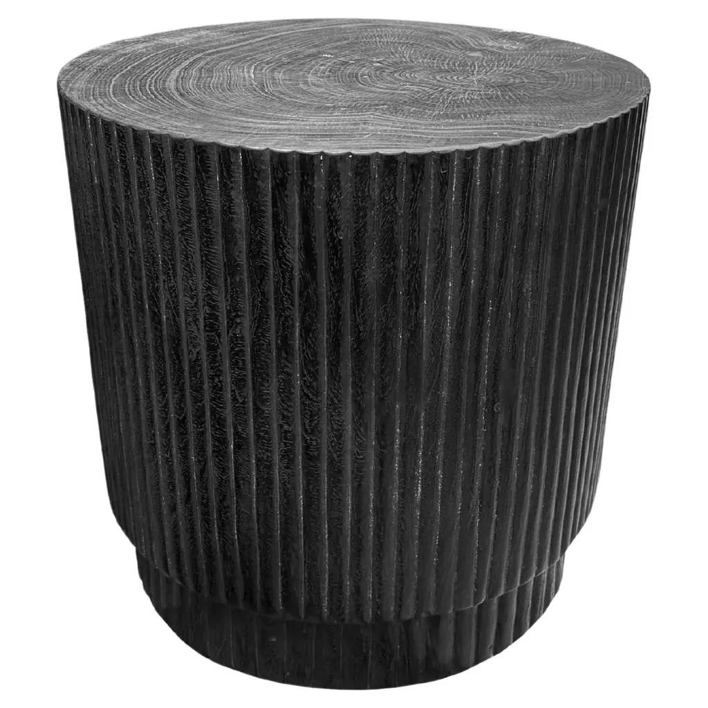 A wonderfully sculptural round side table with a hand-carved, ribbed design on its exterior. Its rich black pigment was achieved through burning the wood three times. Its neutral pigment and subtle wood texture makes it perfect for any space. A uniquely sculptural and versatile piece certain to invoke conversation. This table was crafted from a solid block of mango wood and has a smooth texture.