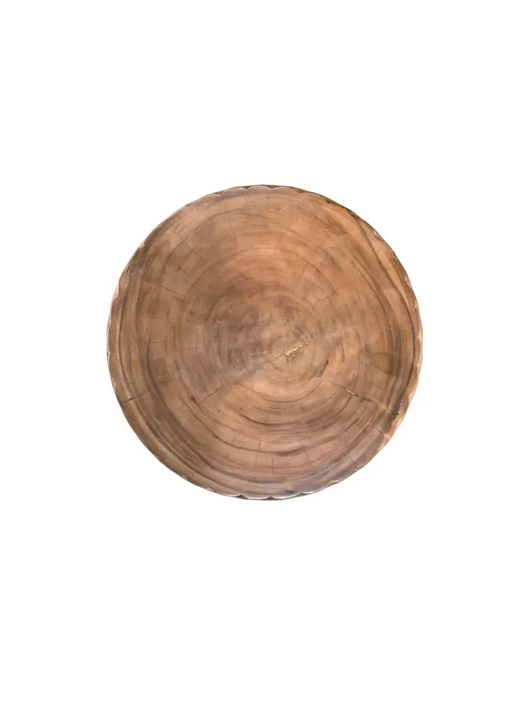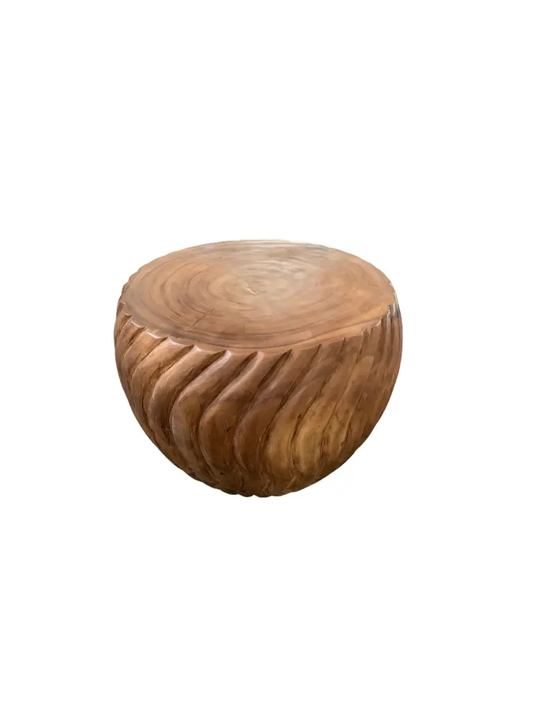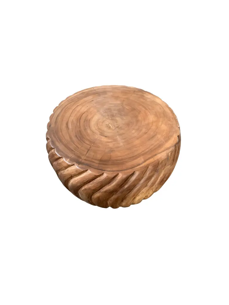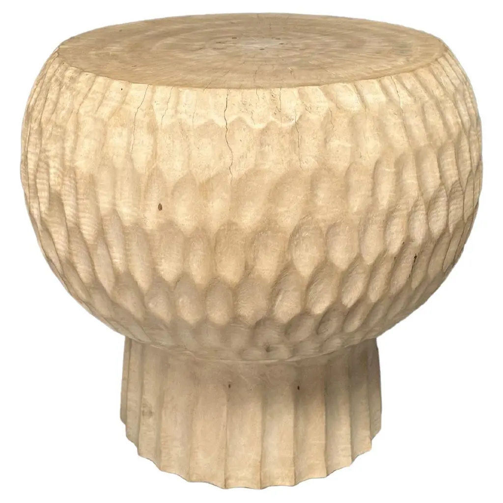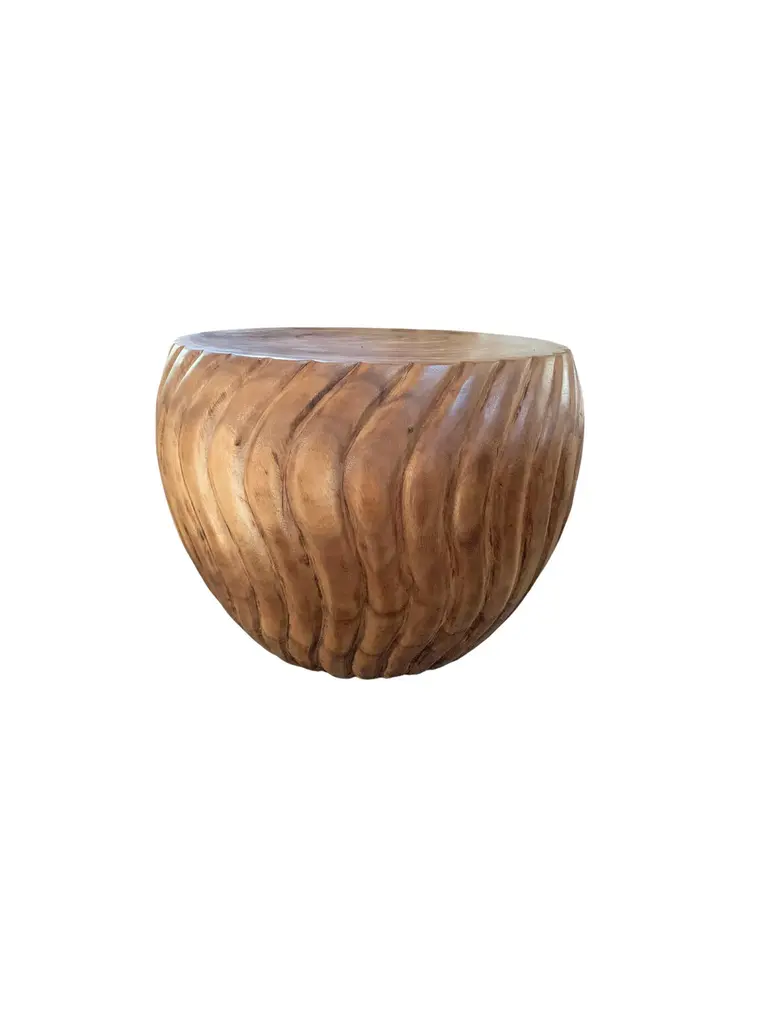 A wonderfully sculptural round side table with a hand-carved, ribbed design on its exterior. Its neutral pigment and subtle wood texture makes it perfect for any space. A uniquely sculptural and versatile piece certain to invoke conversation. This table was crafted from a solid block of mango wood and has a smooth texture.