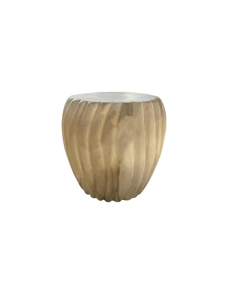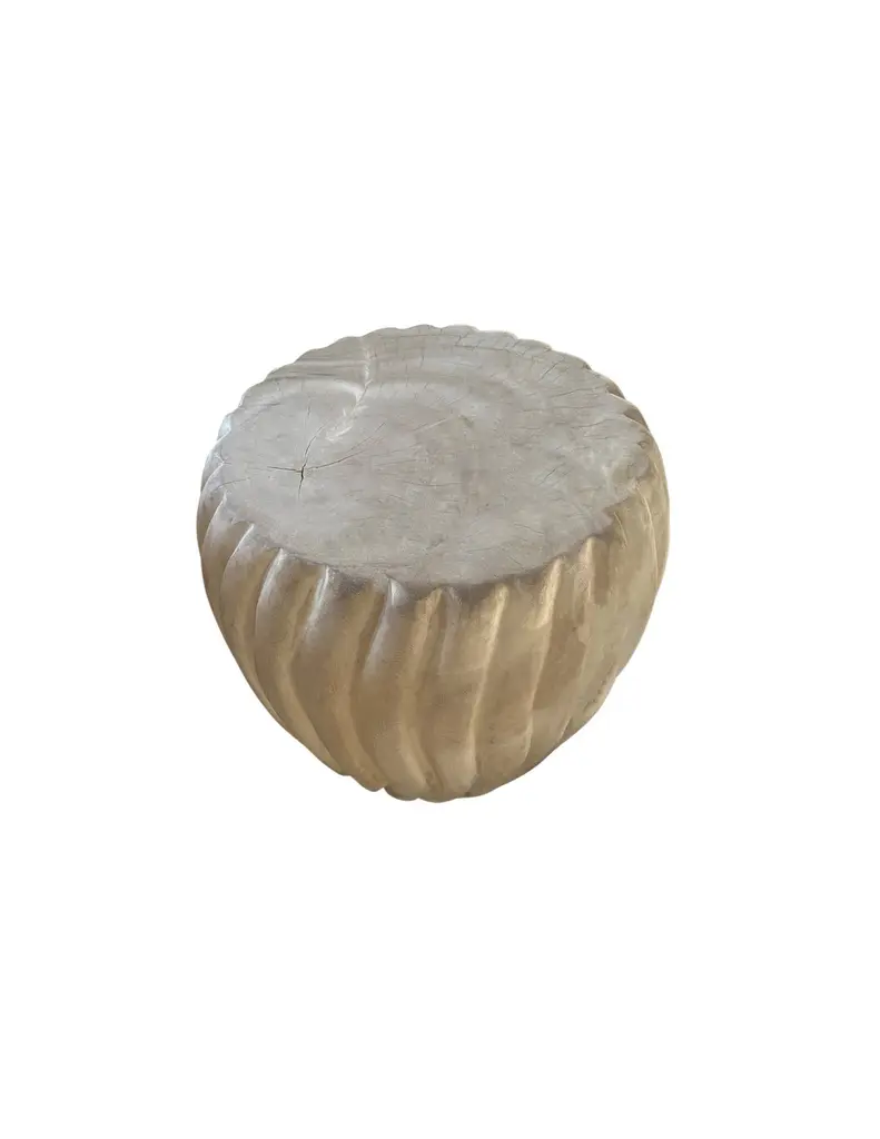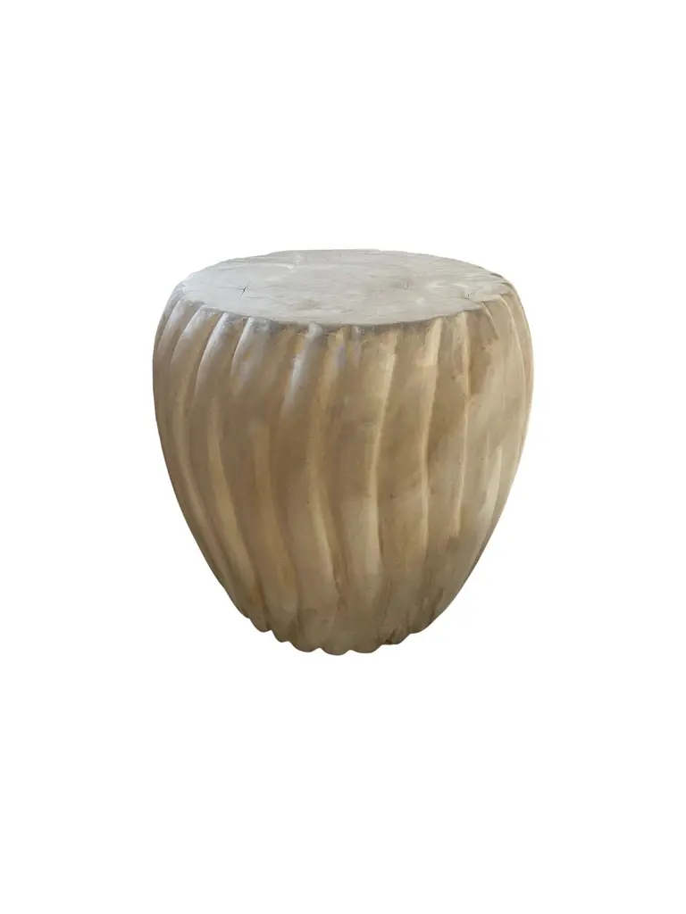 A wonderfully sculptural round side table with a hand-carved, ribbed design on its exterior. Its neutral pigment and subtle wood texture makes it perfect for any space. A uniquely sculptural and versatile piece certain to invoke conversation. This table was crafted from a solid block of mango wood and has a smooth texture. To achieve its pigment the wood was bleached numerous times.