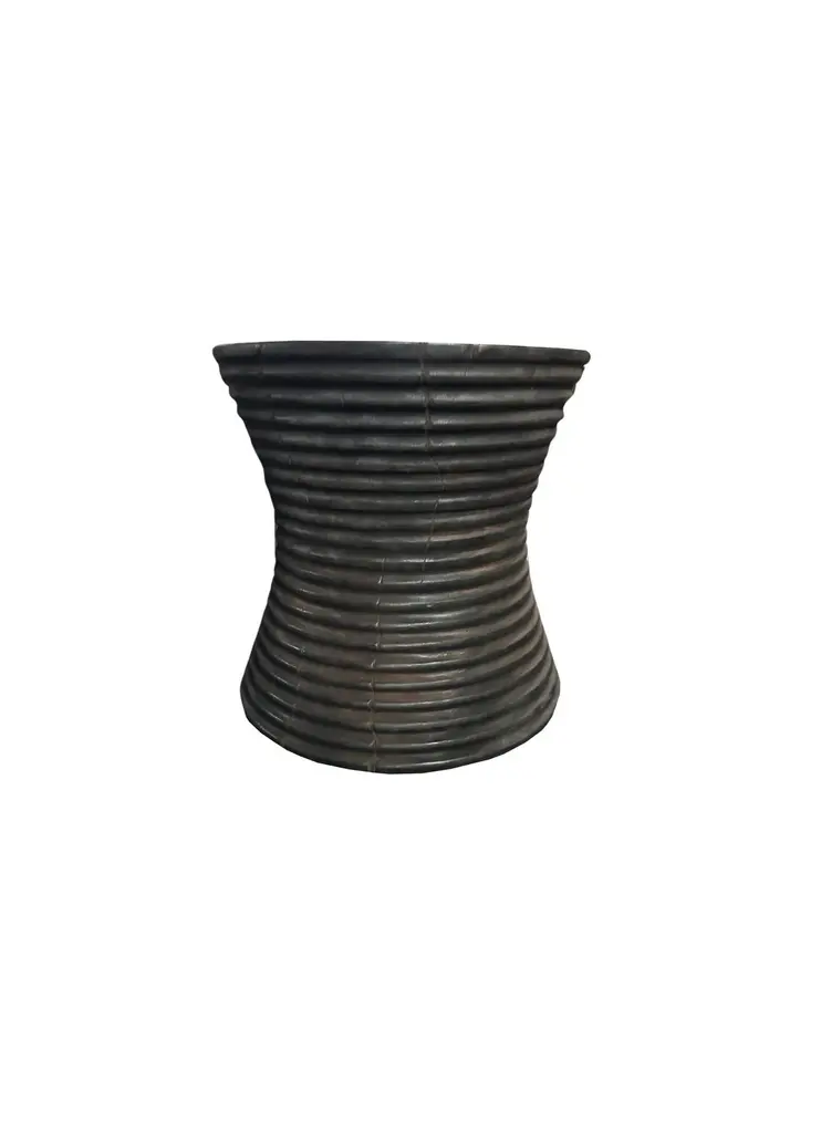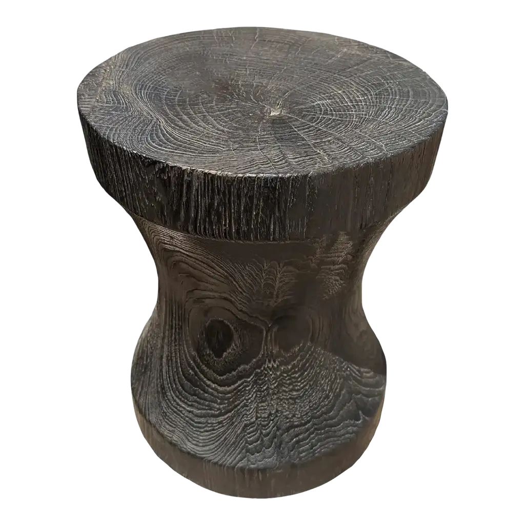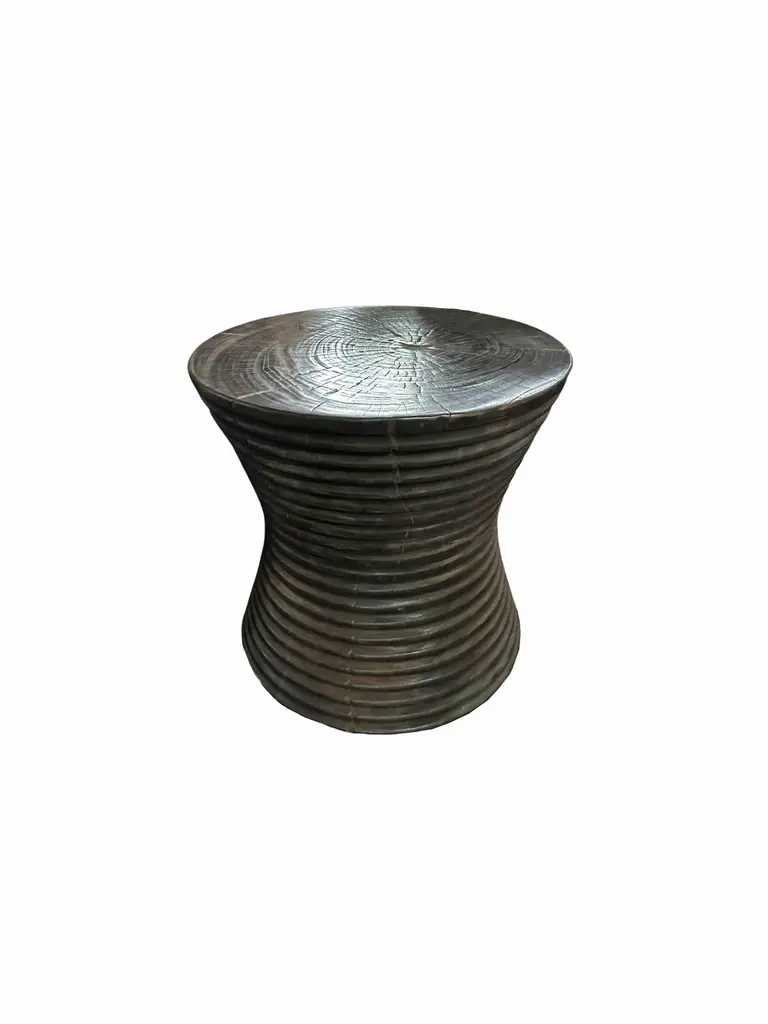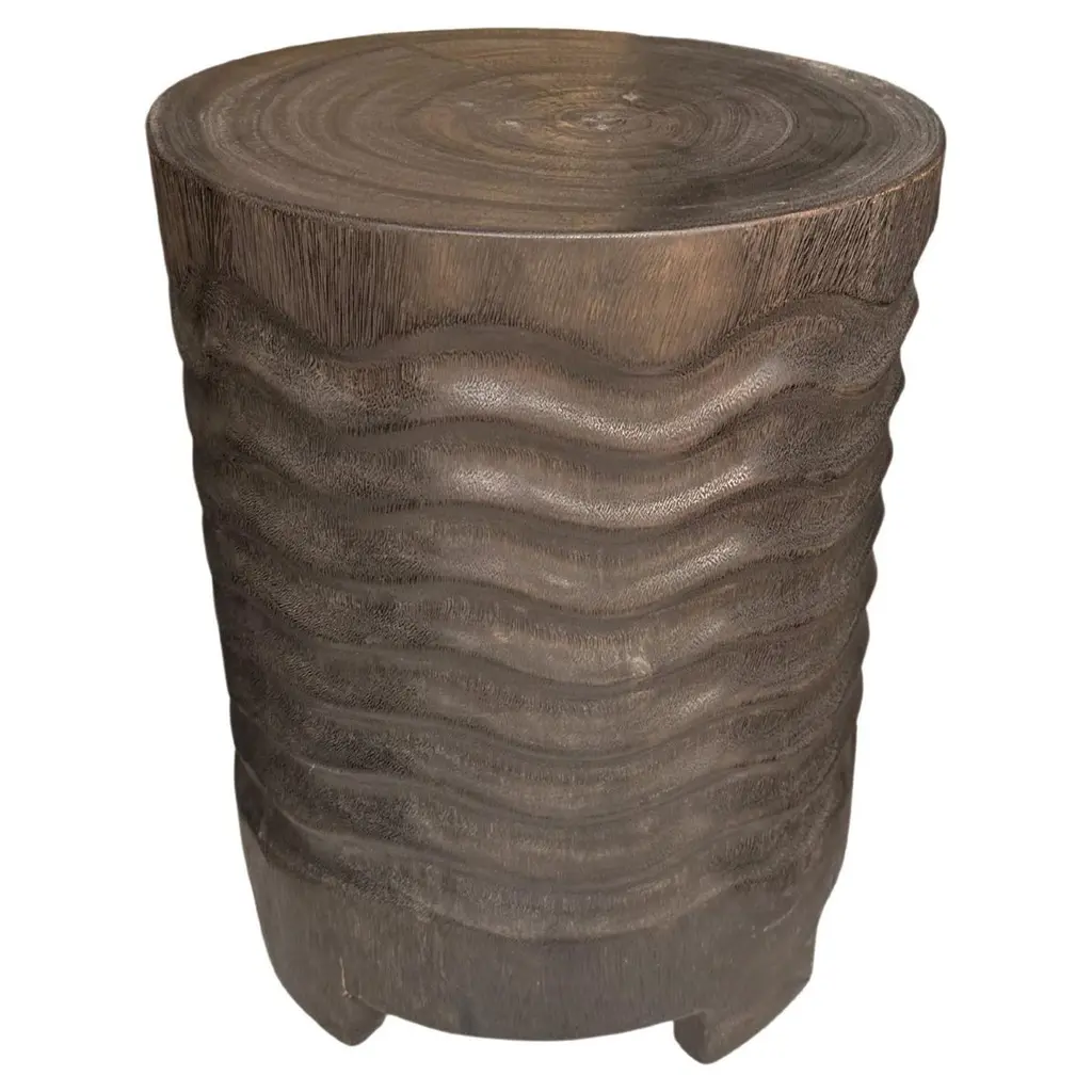 A wonderfully sculptural round side table. Its pigment and texture was achieved through meticulously sanding down the table, burning the wood several time and then finishing with a clear coat. A uniquely sculptural and versatile piece. Unique to this table are the ribbed carved detailing on all sides. It was crafted from a solid block of mango wood.