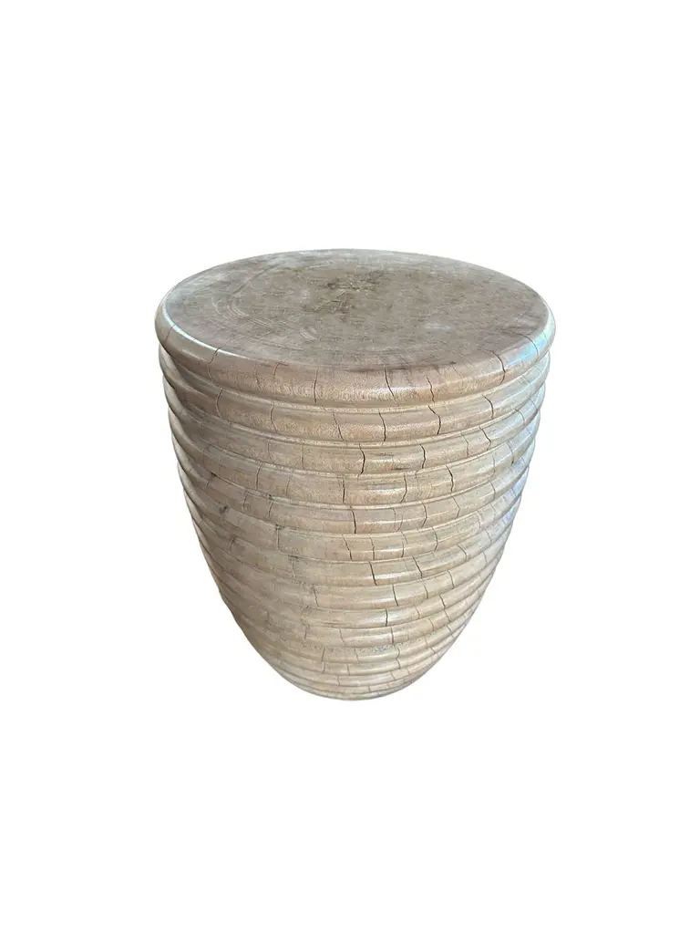 A wonderfully sculptural round side table. Its pigment and texture was achieved through meticulously sanding down the table and then finishing it with a clear coat. A uniquely sculptural and versatile piece. Unique to this table are the ribbed carved detailing on all sides. It was crafted from a solid block of mango wood.