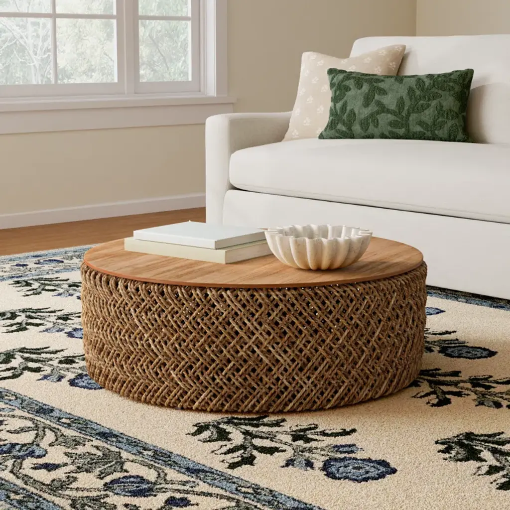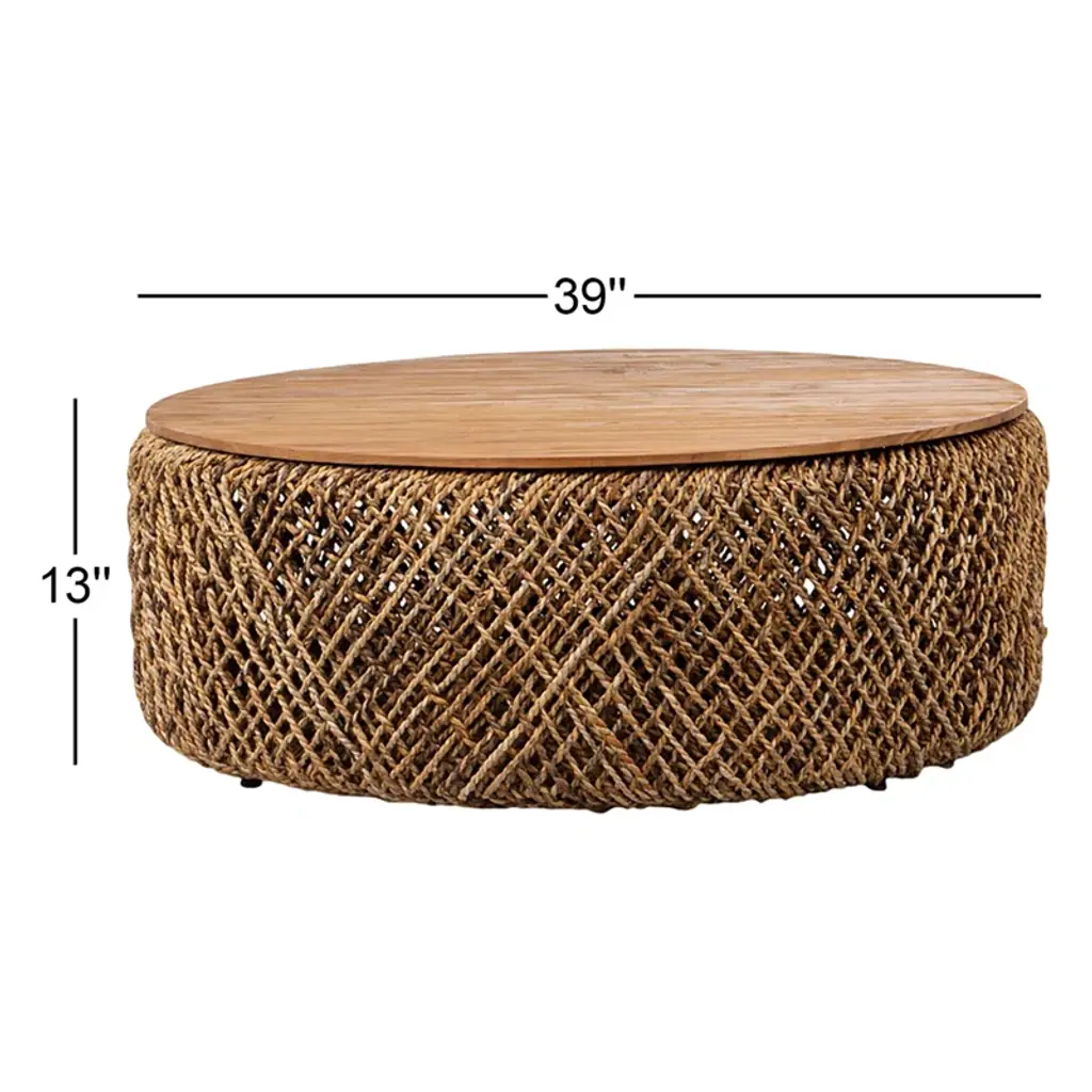 This round coffee table brings a touch of natural elegance to your living room with its solid teak wood top and abaca fiber base. The brown palette complements various decor styles, while the hidden storage compartment provides a convenient spot to stash away remotes, magazines, or other essentials. With a weight capacity of 20 lbs., this table is perfect for displaying a decorative centerpiece or serving up your favorite beverages. The unique combination of materials adds an organic vibe to your space, making it a great conversation starter.