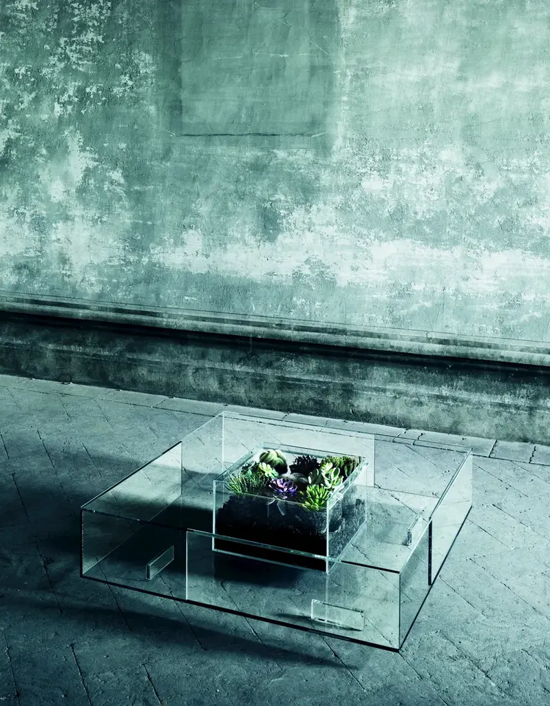 Low table realized completely in tempered and glued transparent extralight glass.A retaining basin is placed in the centre.The double top allows various objects to be placed inside the low table, whilst the basin which is watertight through a special gluing, can be used as vase, flower box or aquarium.A version with a burner in steel inox fuelled by bioethanol is also available.