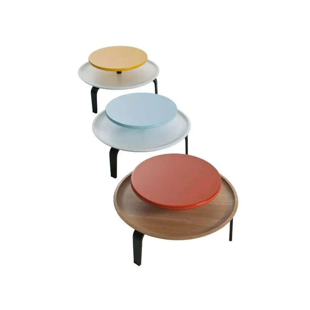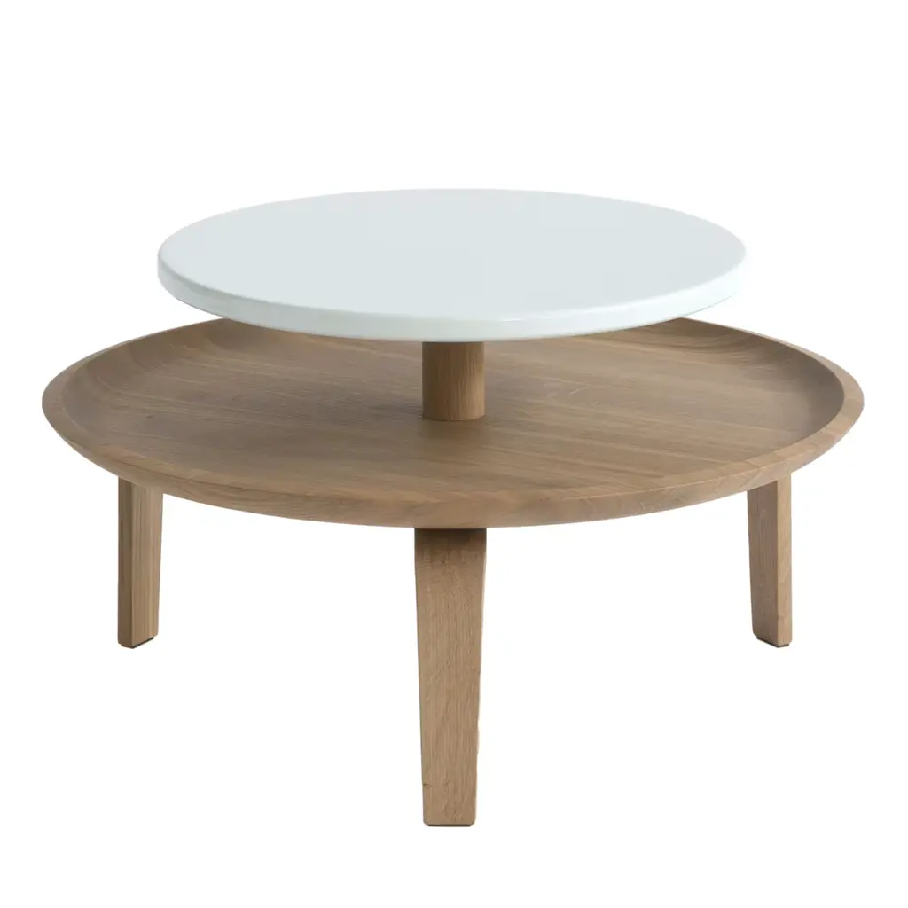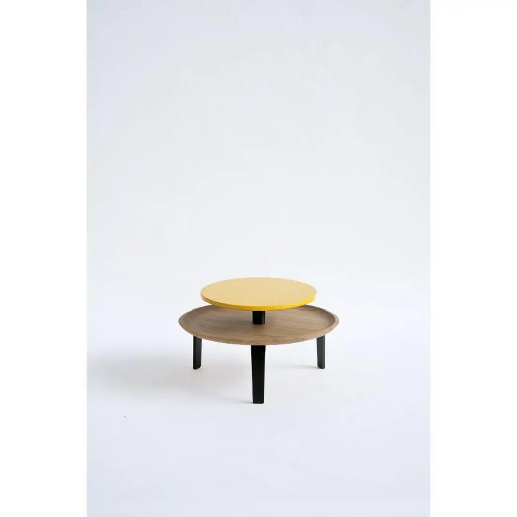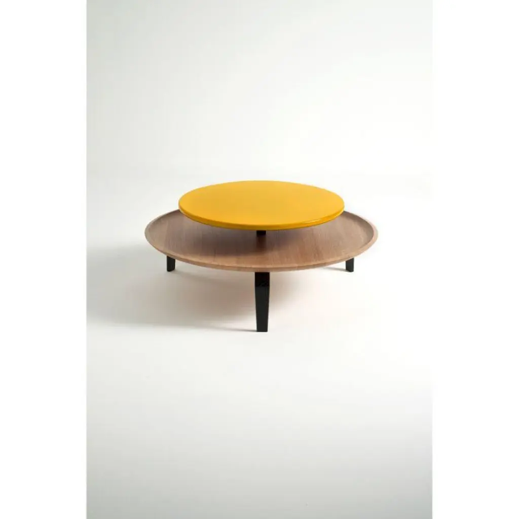 Secreto 85 coffee table, Yellow “Mitzouko” by Colé ItaliaDimensions: H.32; base plate ø 85, top ø 60 cmMaterials: Coach table with 2 rounded plates; 3 legs and base plate in natural solid oak;top matt lacquered in 5 colors.Also Available: Different colors, Secreto 80, & Lacquered legs (custom color)It comes from the idea of transforming the traditional coffee table, usually overflowing with books, magazines and newspapers, in a ‘coffee table / book table’, where there is really space both for books and for the cups! The upper shelf is enriched with evocative colours taken from fine perfume’s labels of the 20s and 30s. Three legs in solid oak wood, natural or black stained. Lower plate in solid oak, Top lacquered in off- white, off- black, ochre yellow, spicy orange and sky blue.Colé is a young Italian design brand, with a high-end production 100% made in Italy. Born from the experience of Matteo De Ponti, architect, who grew up in one of the most outstanding Milanese design families, and the artistic sensibility of Laura Macagno, degree in Economics and passionate of art and design. Our Mission is to create design icons, beautiful and comfortable pieces that can Stand the test of time, furnishing houses of international and sophisticated clients, and realized with craftsmanship, thus unique. “We love objects which own deep roots, excellent quality, and a strong evocative power. Archetypal forms dressed with new beauty without losing their classical composure”.Our expressive research is inspired by the utopian force of Italian eminences grises architects and designers of the ’50s, the Scandinavian design, the Bauhaus, ethnic handcraft and houses of famous writers of the XX century, all different as a style but united by the intense soul of those who worked and lived there.