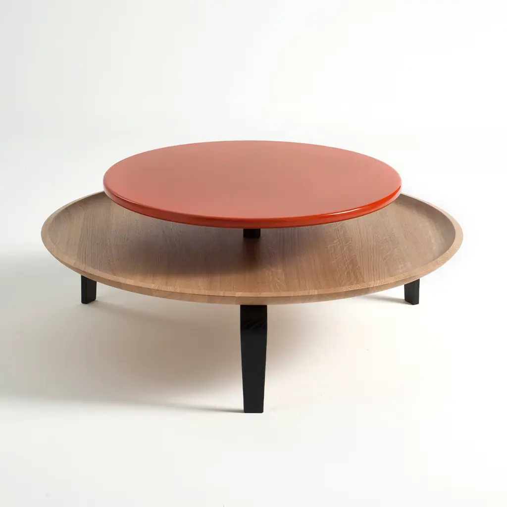 Designed by Lorenz+Kaz, this coffee table features three legs in solid oak wood black painted and a lower plate in solid oak, milled to obtain a plate with raised edge. The finishing is in natural oak and the top is matt lacquered orange. It is inspired by the idea of transforming the traditional coffee table, usually overflowing with books, into a "coffee table/book table", where there is enough space both for books and for the cups.