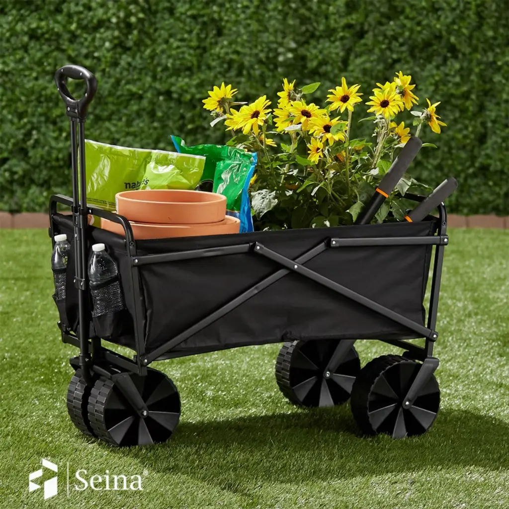 Seina Heavy Duty Steel Frame Collapsible Folding Outdoor Portable Utility Cart Wagon With All Terrain Plastic Wheels And 150 Pound Capacity, Black