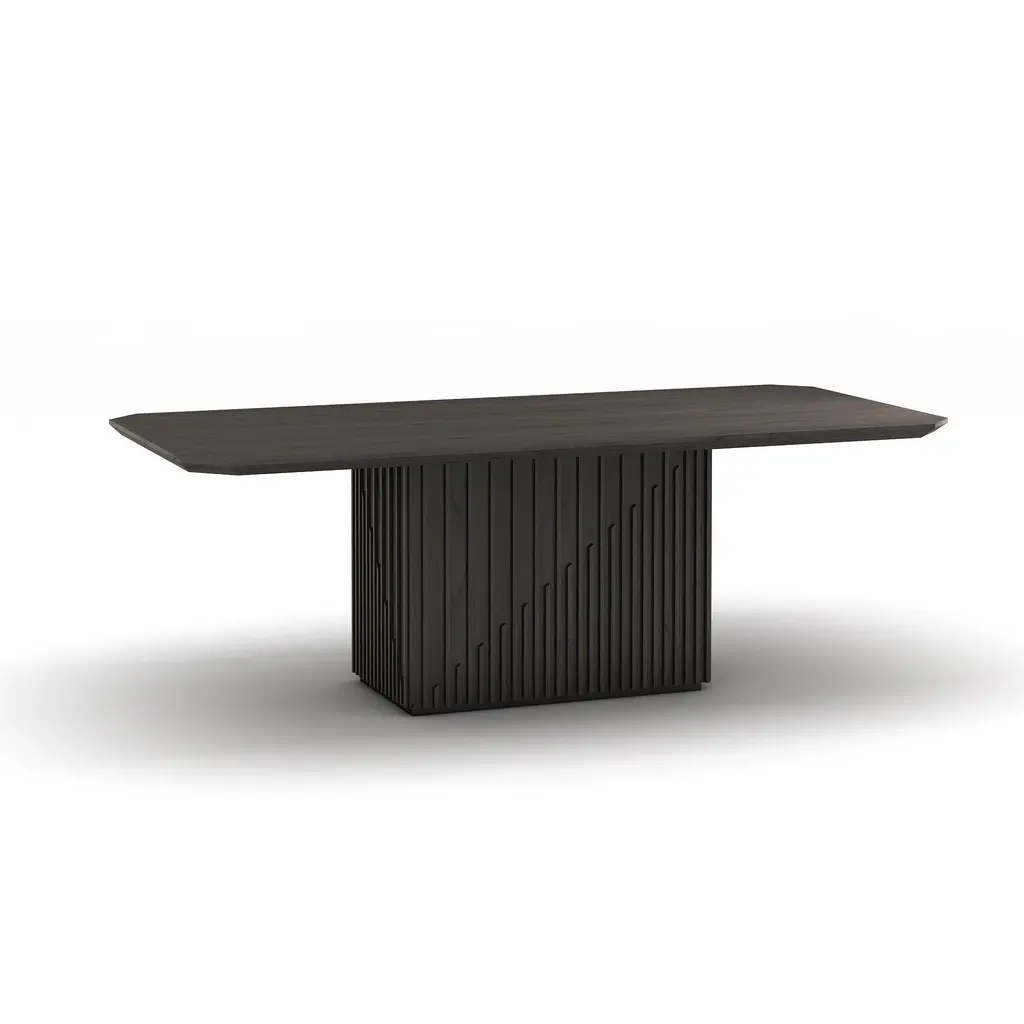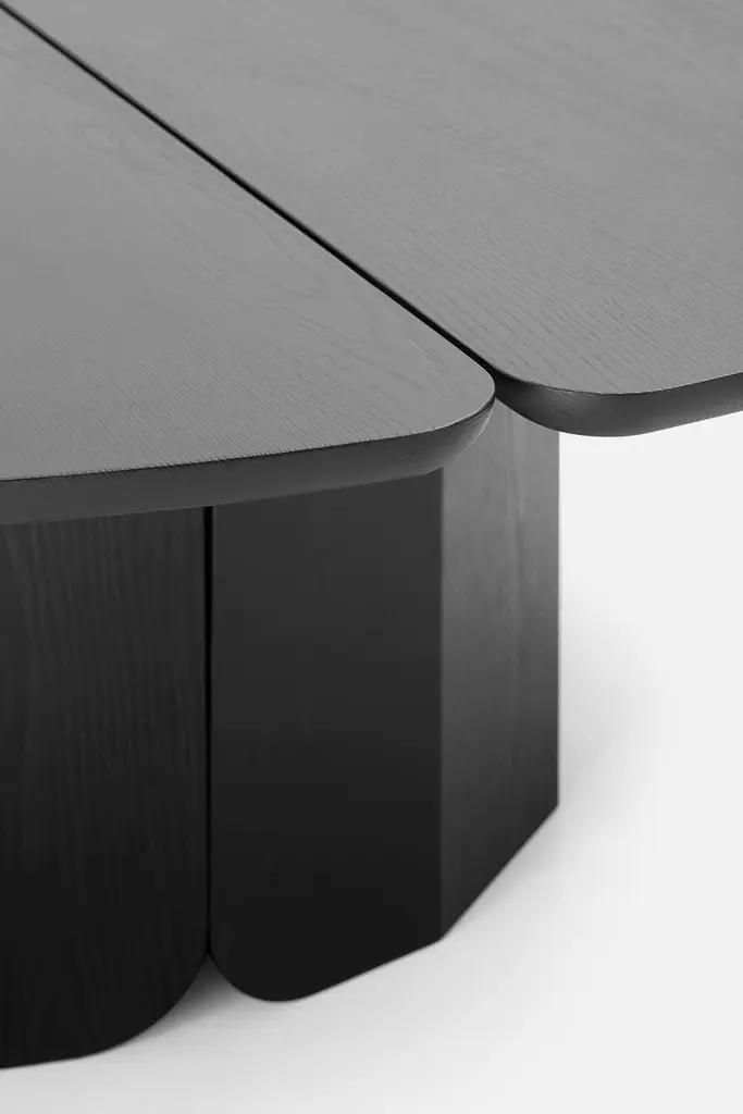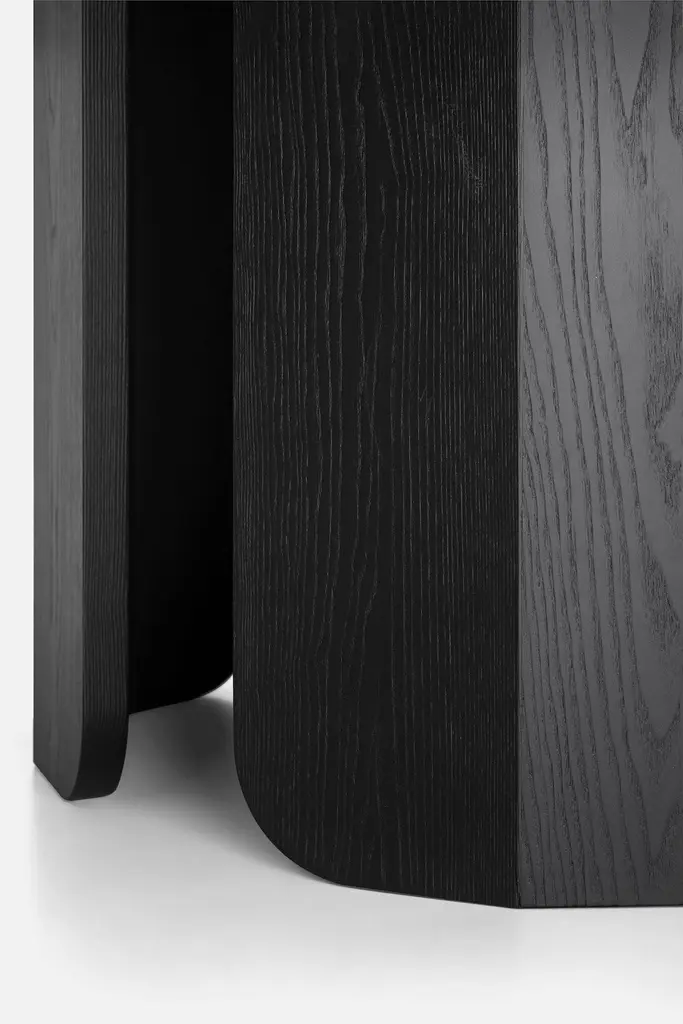 The table has a circular top in black-stained brushed ash, that can have a matt or glossy finish. It is composed of two semi-circles the form a central slit: the edge is rounded and curves inwards towards the center, highlighting the juxtaposition of these two parts. The leg is the result of a craftsmanship that has evolved over time with the support of contemporary manufacturing technology. It is composed of solid wood planks that create facets and an opening alongside the curve, concentric to the top. The parts are never joined but always separated by a line of shadow that lets one discern the simple shapes of which the final product is composed.Available also in different sizes:W Ø160 x H 72 cm W Ø63” x H 28,3”W Ø180 x H 72 cm W Ø70,9” x H 28,3”W Ø210 x H 72 cm W Ø82,7” x H 28,3”