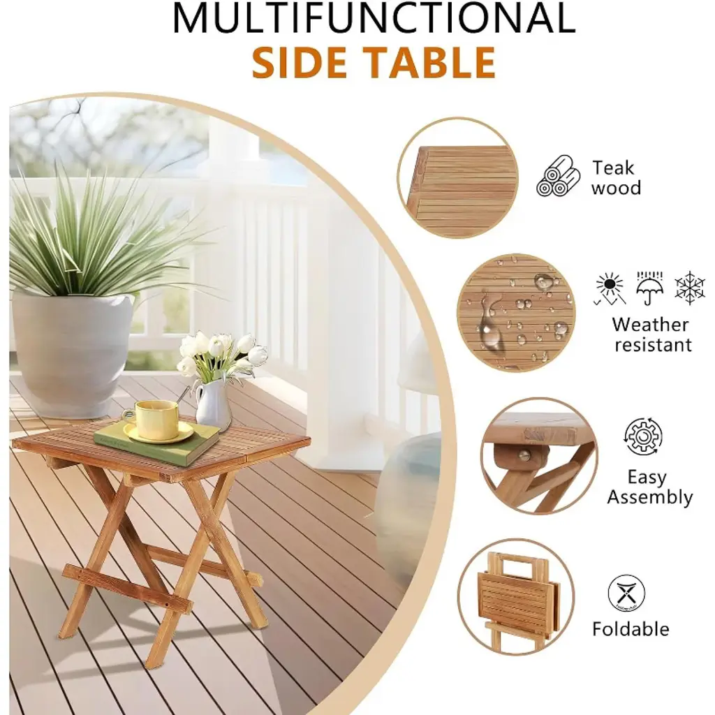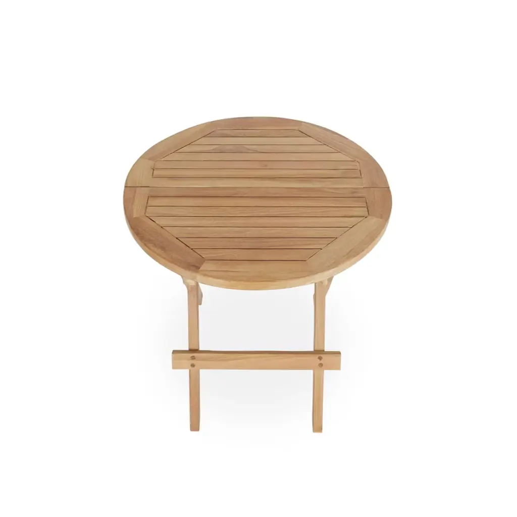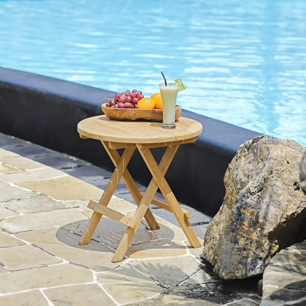 Foldable round side table crafted from premium Cambodian teak. Features natural wood grain, cross-braced X-leg support, and built-in carry handle for portability. Measures 19.68"W x 19.68"H. Foldable design saves space. Ideal for patios, balconies, or as poolside drink table. Weather-resistant natural finish.
