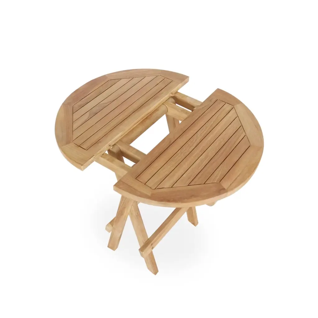 Foldable round side table crafted from premium Cambodian teak. Features natural wood grain, cross-braced X-leg support, and built-in carry handle for portability. Measures 19.68"W x 19.68"H. Foldable design saves space. Ideal for patios, balconies, or as poolside drink table. Weather-resistant natural finish.