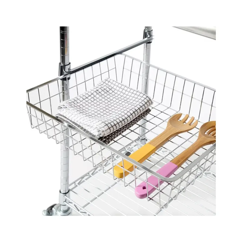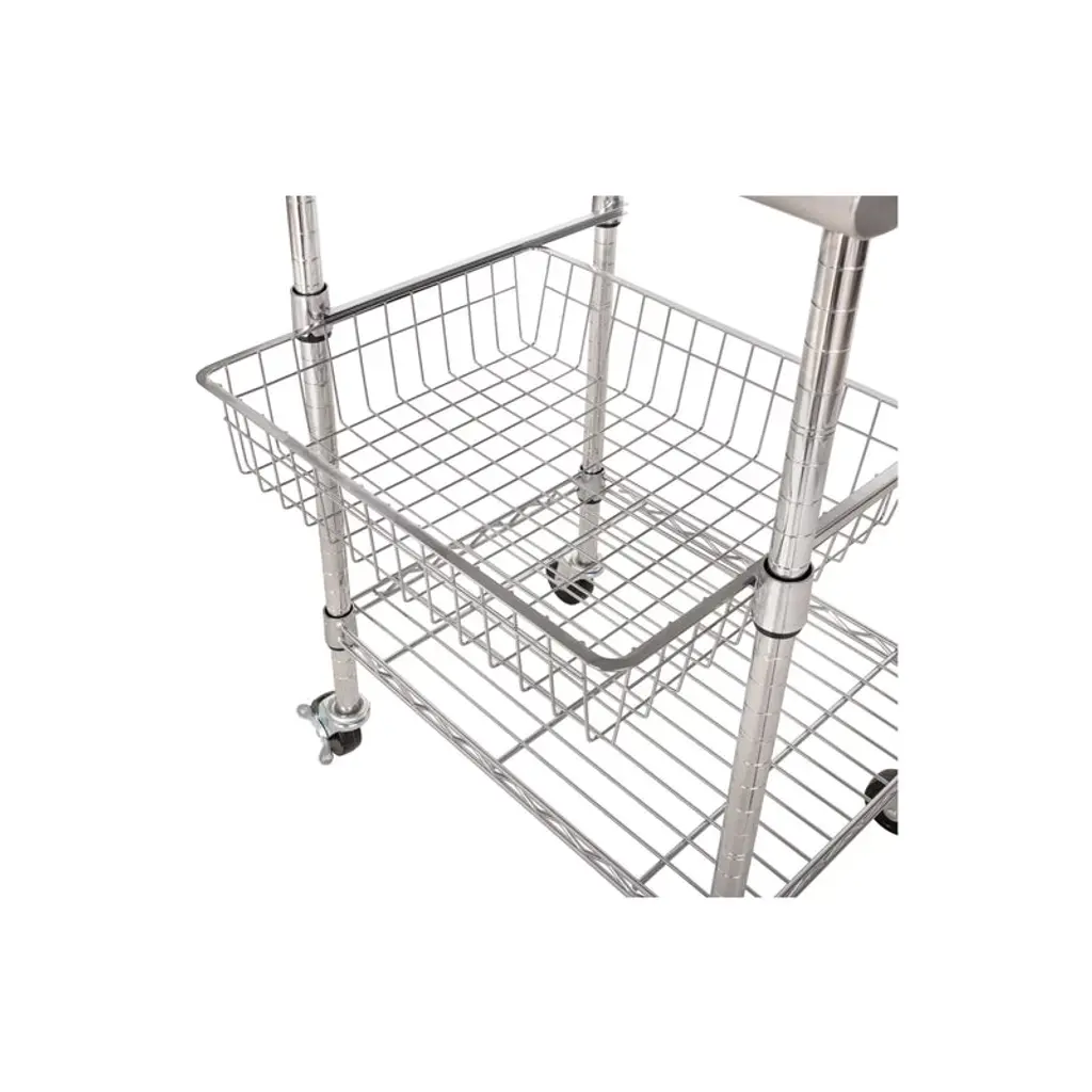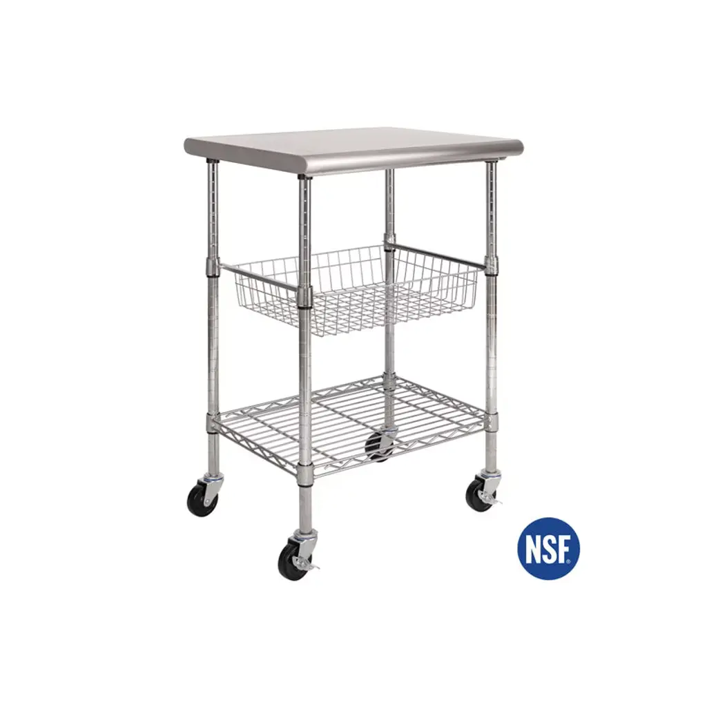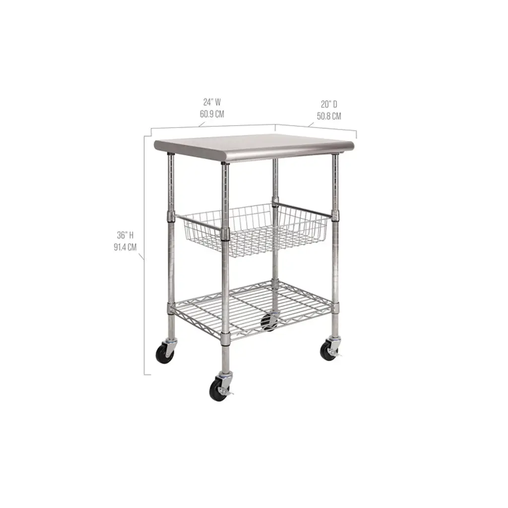Add additional counter space to your kitchen with this kitchen cart cutting table. This table is certified by the NSF to NSF/ANSI Standard 2 - Food Equipment, kitchen workstation features a durable chrome-plated steel frame on commercial locking safety wheels, topped with a sleek stainless steel top. Included is a height adjustable wire basket and shelf to help keep kitchen gadgets and tools within reach. The dimensions are 24" long by 20" wide by 36" tall.