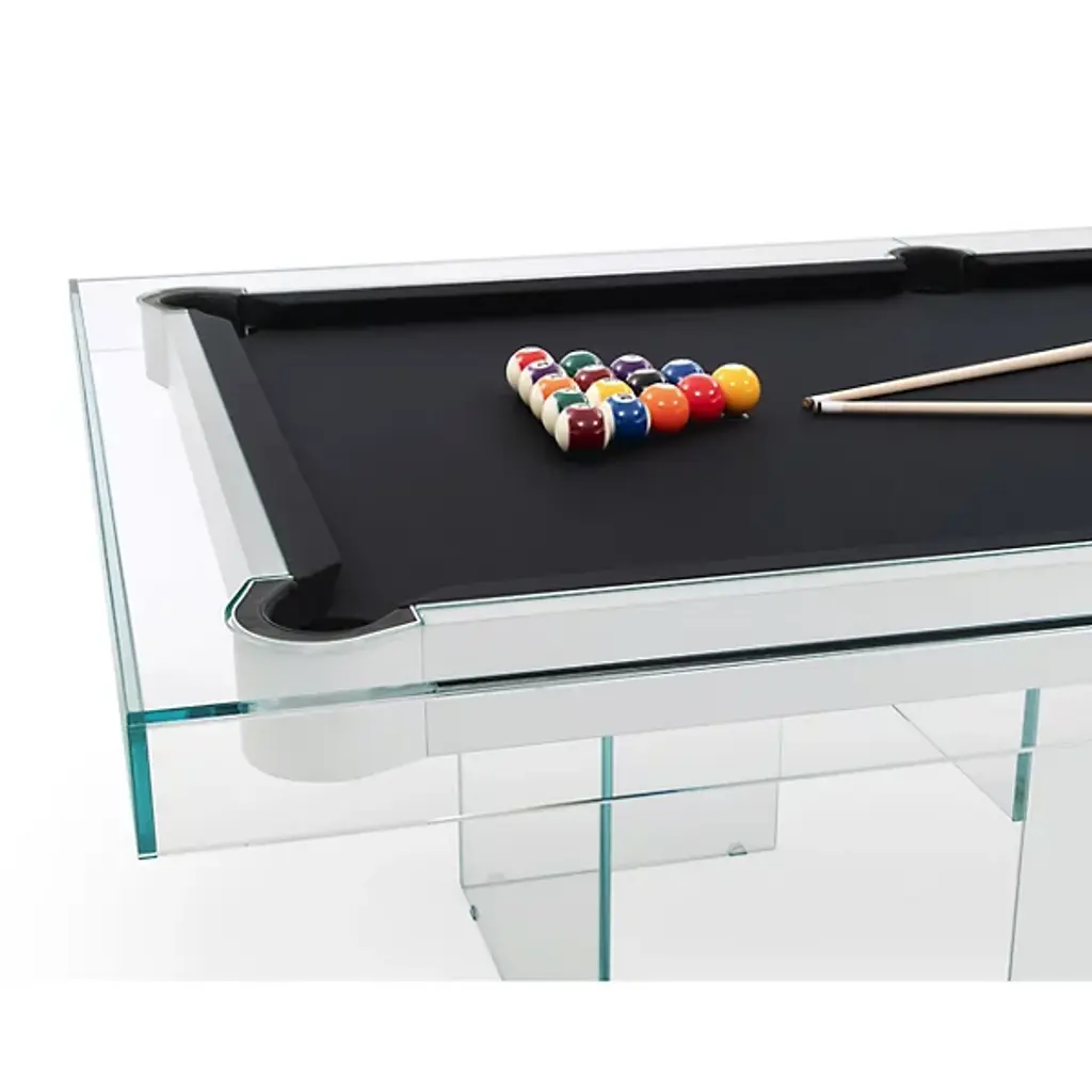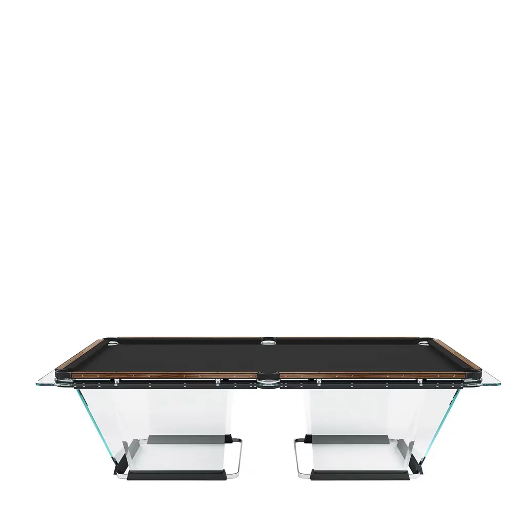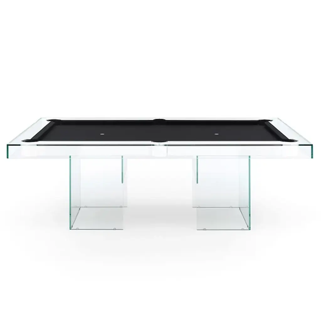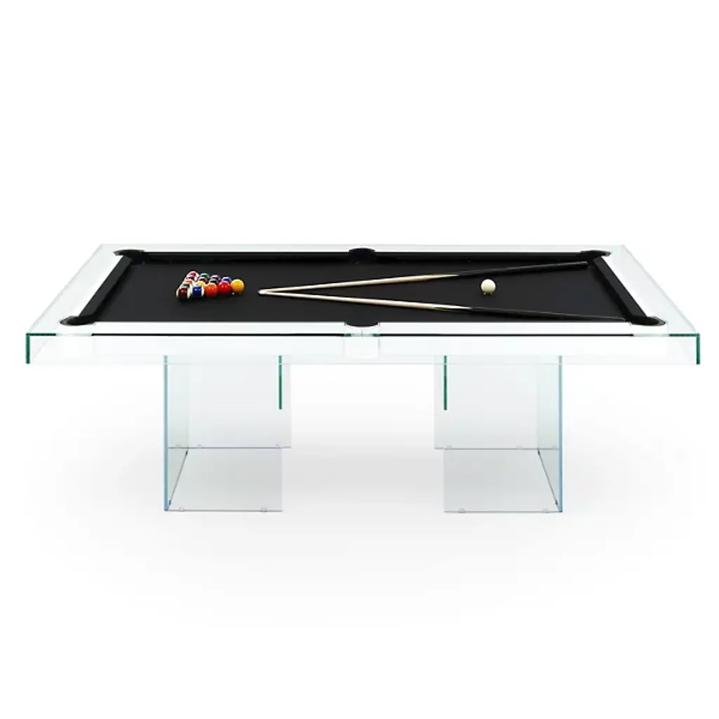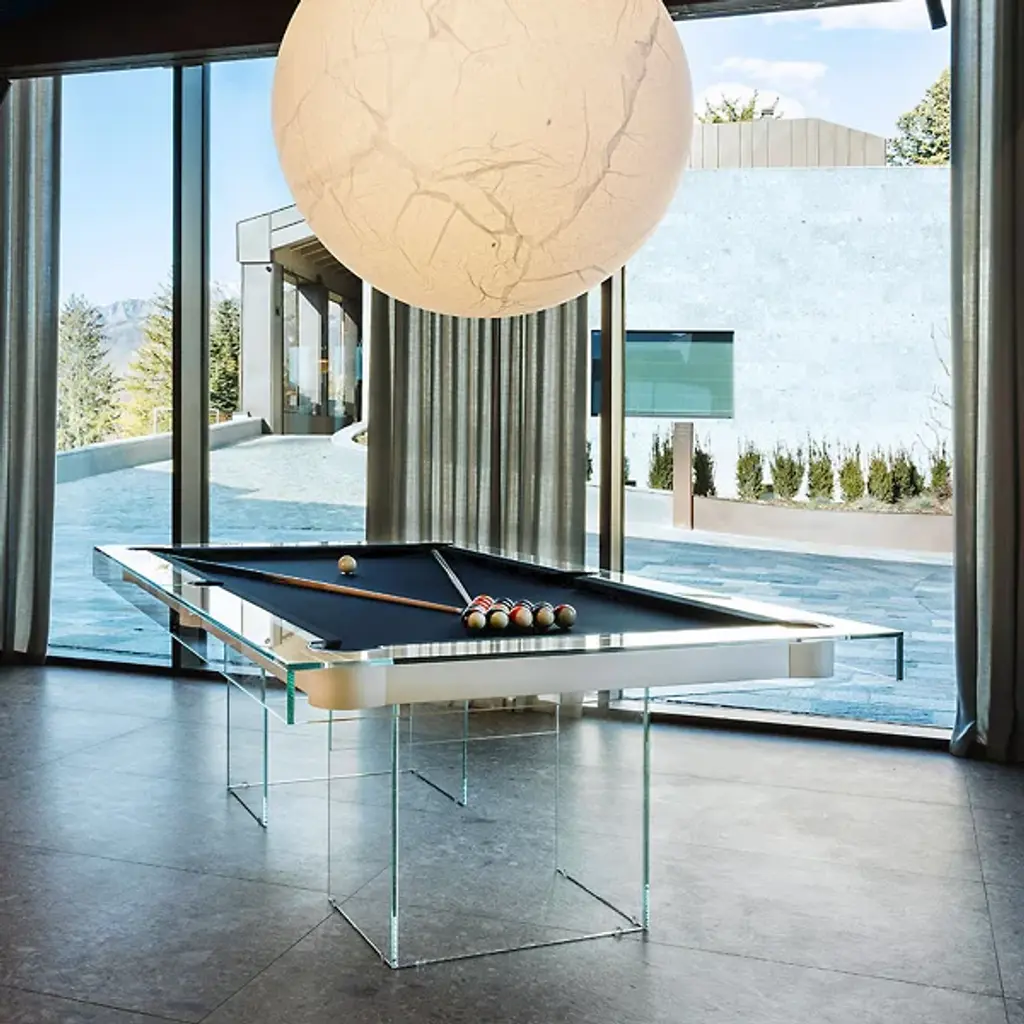 The Shadow Pool Table from Fas Pendezza provides an airy yet luxurious presence to any environment in which it is placed. This gorgeous Italian-made table is designed by Basaglia + Rota Nodari and uses a sharp-cornered base and frame to elevate a traditional pool table above. The glass and wood contrast well with each other, supporting a slate playing area surfaced in soft cloth that keeps the noise of play to a moderated minimum. The crystal glitters and gleams with ambient light, while the table arrives with cues, chalk, balls, and a triangle, everything you’d need to play a game of pool at any time.