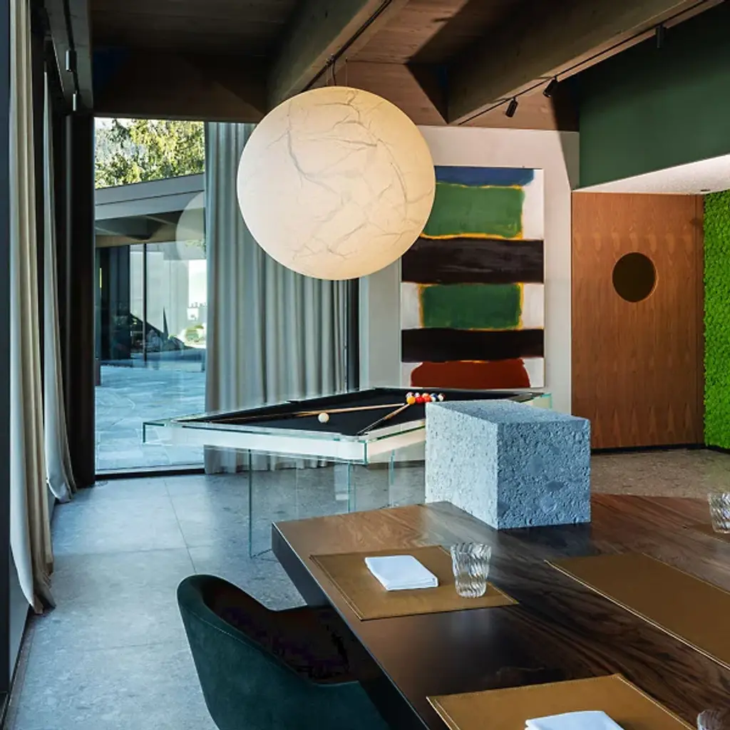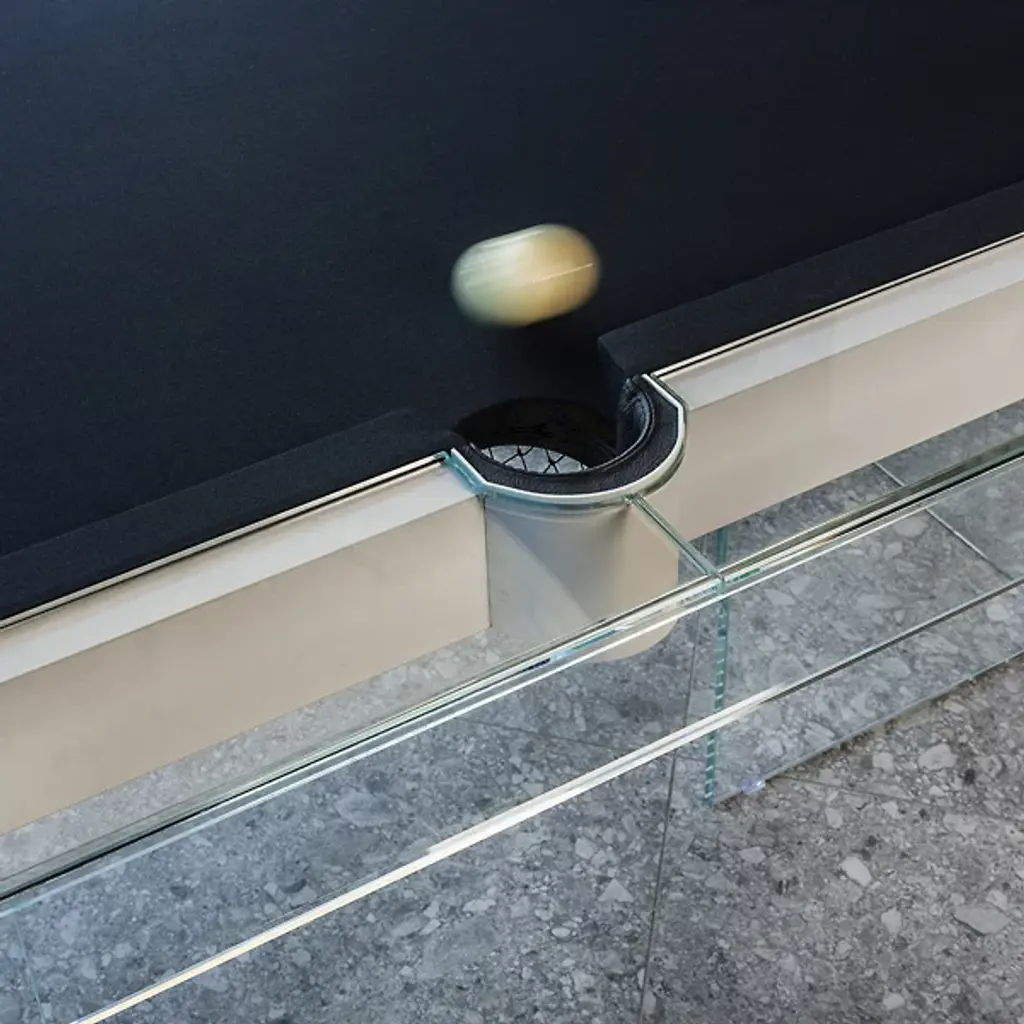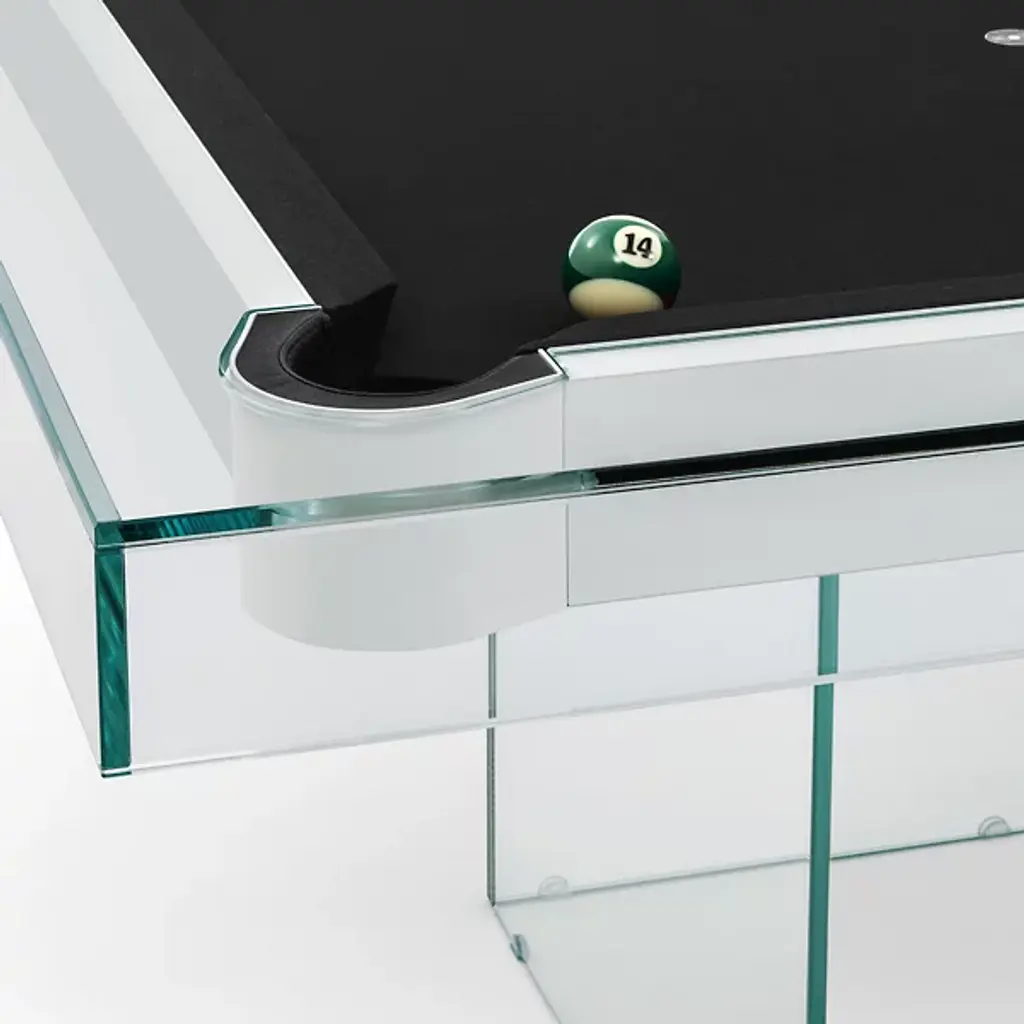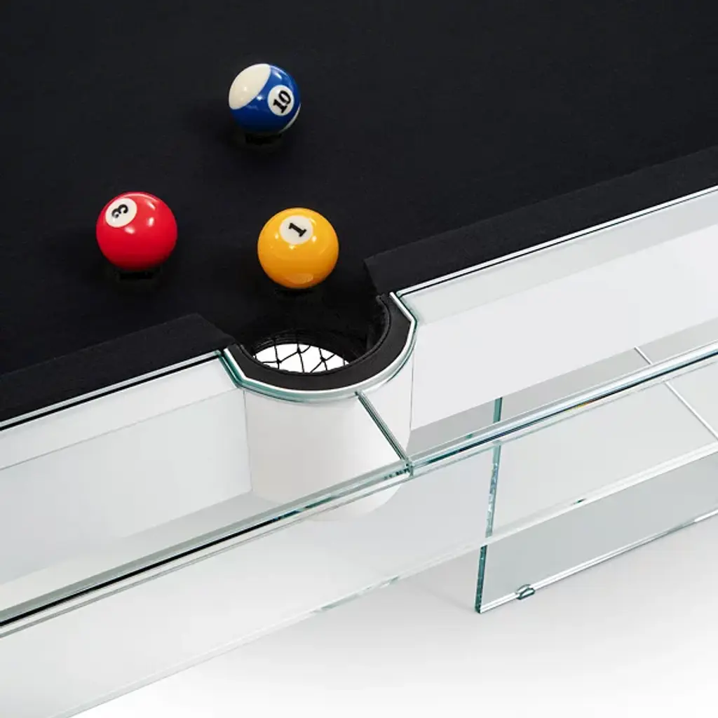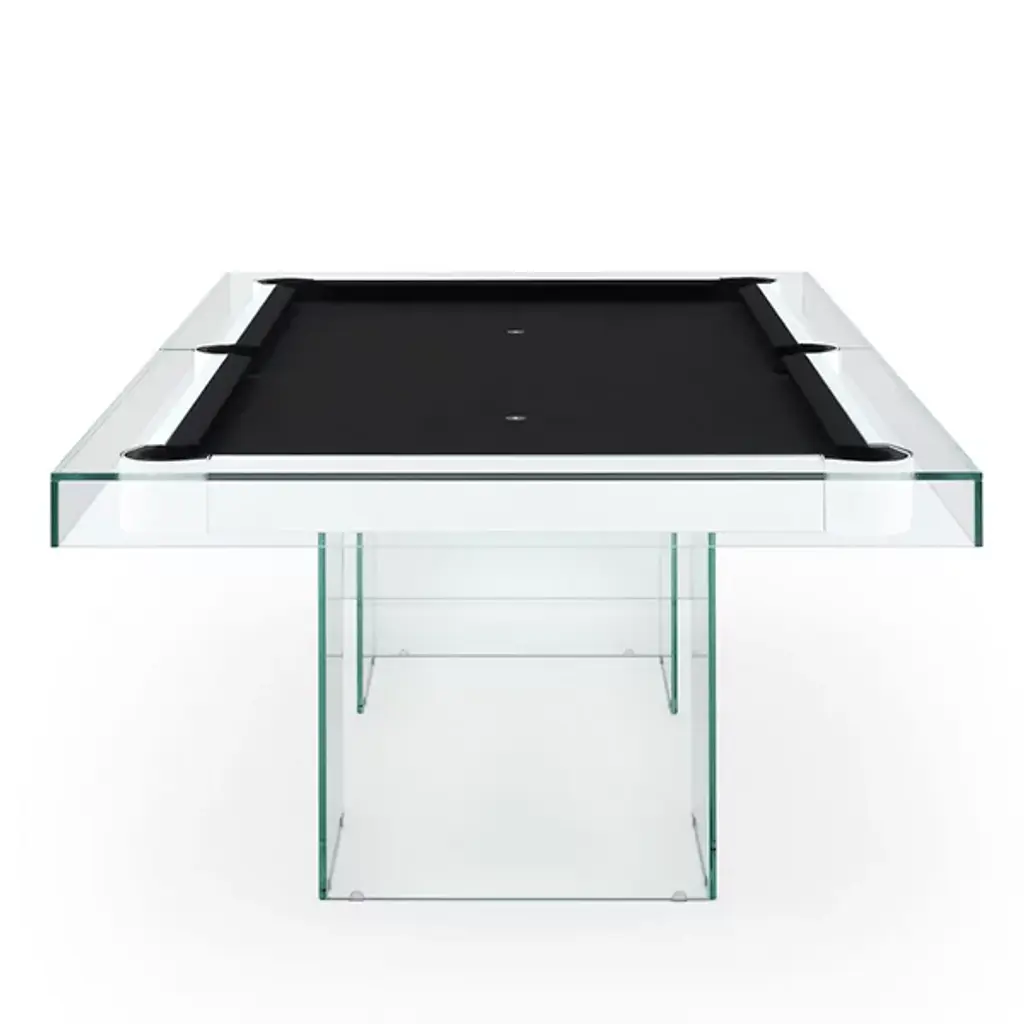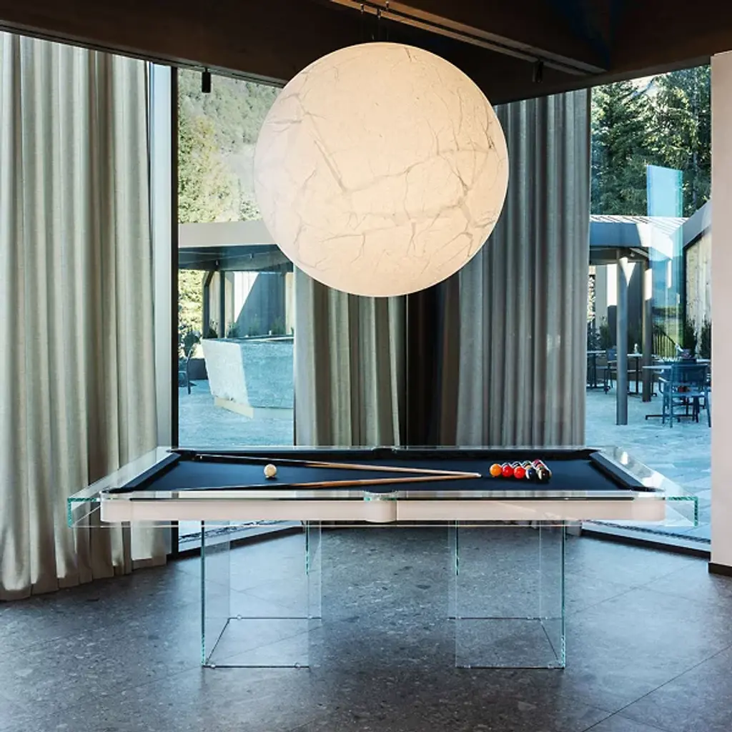 The Shadow Pool Table from Fas Pendezza provides an airy yet luxurious presence to any environment in which it is placed. This gorgeous Italian-made table is designed by Basaglia + Rota Nodari and uses a sharp-cornered base and frame to elevate a traditional pool table above. The glass and wood contrast well with each other, supporting a slate playing area surfaced in soft cloth that keeps the noise of play to a moderated minimum. The crystal glitters and gleams with ambient light, while the table arrives with cues, chalk, balls, and a triangle, everything you’d need to play a game of pool at any time.