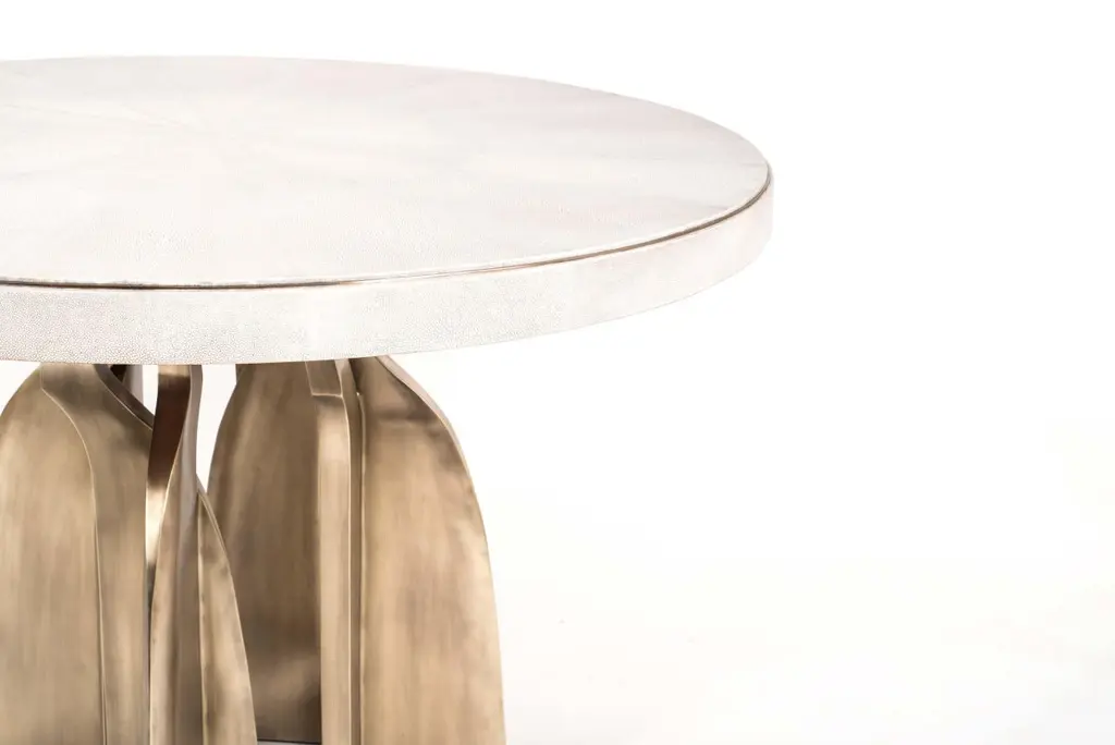 The Paris based label has distinguished themselves since their launch, with their iconic use of shagreen mixed with brass and other exotic materials. All furniture is handcrafted by skilled artisans, ultimately making each piece unique, designed in Paris and produced in the Philippines.The Chital breakfast table is a stunning piece, a statement in any space. The cream shagreen inlaid top has a subtle metal inset around the frame, followed by bronze-patina brass sculptural legs clustered together as the base. This piece is designed by Kifu Augousti, the daughter of Ria and Yiouri Augousti.The finish of the shagreen is authentic as it is hand-dyed and the designer calls the finish look: "antique natural shagreen."The dimensions of this piece are 110 x 110 x 75 cm / 43.30" diameter x 29.5"All Kifu Paris pieces are handmade by artisans, ultimately making each piece unique. Custom color/sizing available on request. Wipe clean with soft dry cloth.Although inspired by her parents, her collection of Home Accessories and Furniture is a distinct identity of its own. Kifu uses handmade techniques of elaborate inlay patterns of shagreen, shells, semi-precious stones, materials she experienced as a child growing up in her parent’s studio, but interpreted in a younger quirkier way reflecting her youth. From her "jewelry inspired knobs" on decorative boxes, gold bar boxes and an extravagant inlay pattern mix of shagreen and shell inspired by galactic constellations, as seen on her enormous round mirror, is refreshing to see. Kifu embodies whimsical elements throughout her collection and is not afraid to be daring and unexpected in her approach to design. All shagreen-covered items should be kept out of direct sunlight, color variants may occur on the stingray and other exotic finishes, but this showcases the Parisian label's commitment to creating authentic luxurious products using natural components.