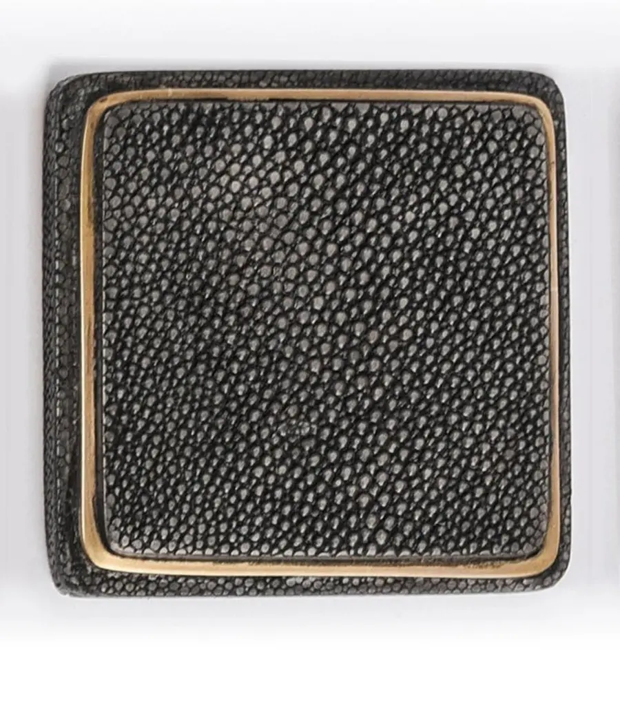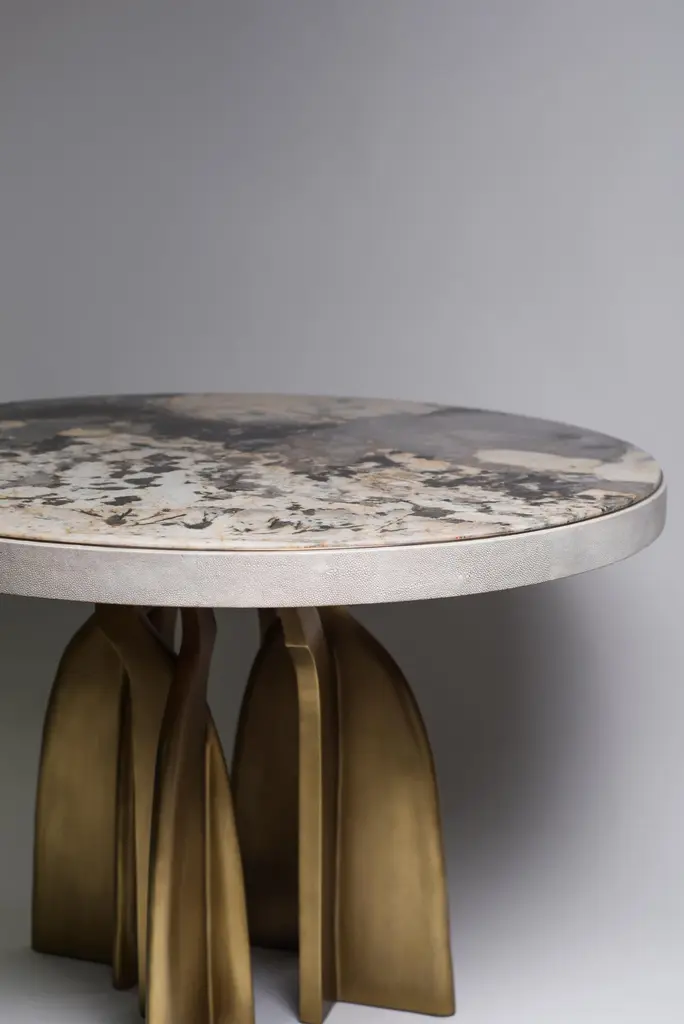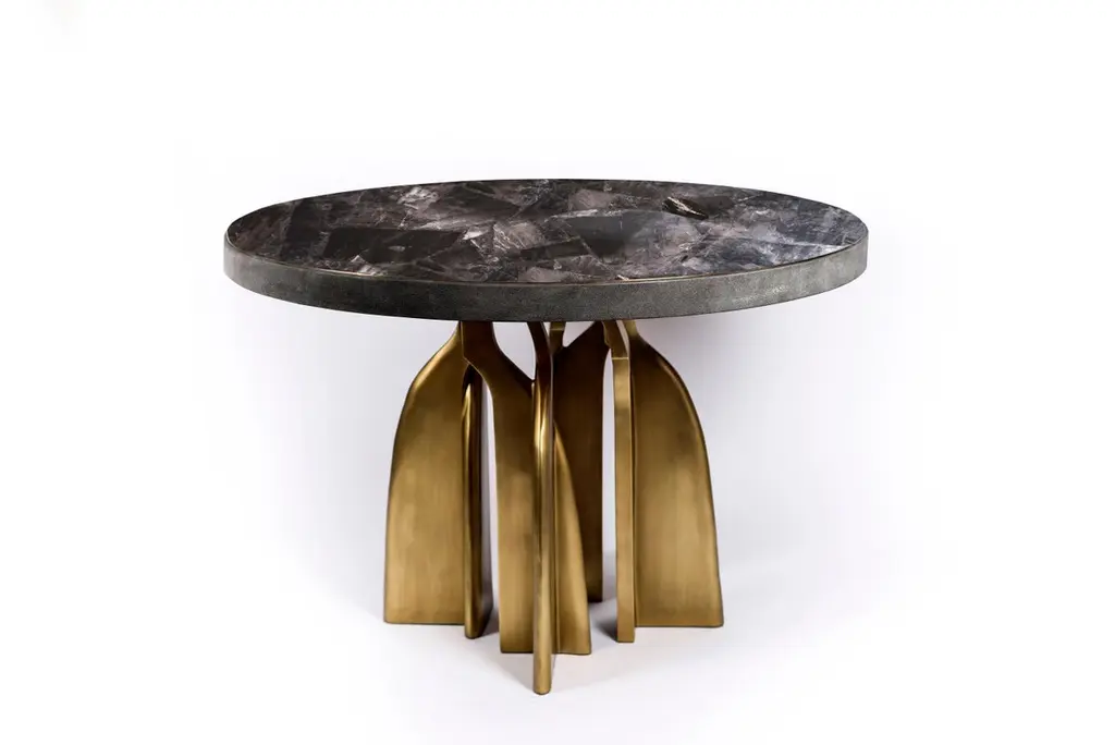 The Paris based label has distinguished themselves since their launch, with their iconic use of shagreen mixed with brass and other exotic materials. All furniture is handcrafted by skilled artisans, ultimately making each piece unique, designed in Paris and produced in the Philippines.The Chital breakfast table is a stunning piece, a statement in any space. The coal black shagreen inlaid top has a subtle metal inset around the frame, followed by bronze-patina brass sculptural legs clustered together as the base. Close up of shagreen finish on second image. This piece is designed by Kifu Augousti, the daughter of Ria and Yiouri Augousti. Available in other finishes, see images at end of slide. The finish of the shagreen is authentic as it is hand-dyed and the designer calls the finish look: "coal black shagreen."The dimensions of this piece are 110 x 110 x 75 cm / 43.30" diameter x 29.5"All Kifu Paris pieces are handmade by artisans, ultimately making each piece unique. Custom color/sizing available on request. Wipe clean with soft dry cloth.Although inspired by her parents, her collection of Home Accessories and Furniture is a distinct identity of its own. Kifu uses handmade techniques of elaborate inlay patterns of shagreen, shells, semi-precious stones, materials she experienced as a child growing up in her parent’s studio, but interpreted in a younger quirkier way reflecting her youth. From her "jewelry inspired knobs" on decorative boxes, gold bar boxes and an extravagant inlay pattern mix of shagreen and shell inspired by galactic constellations, as seen on her enormous round mirror, is refreshing to see. Kifu embodies whimsical elements throughout her collection and is not afraid to be daring and unexpected in her approach to design. All shagreen-covered items should be kept out of direct sunlight, color variants may occur on the stingray and other exotic finishes, but this showcases the Parisian label's commitment to creating authentic luxurious products using natural components.
