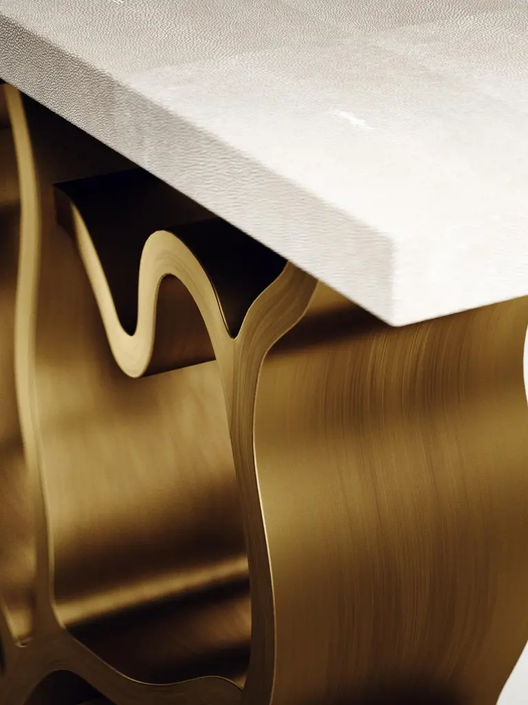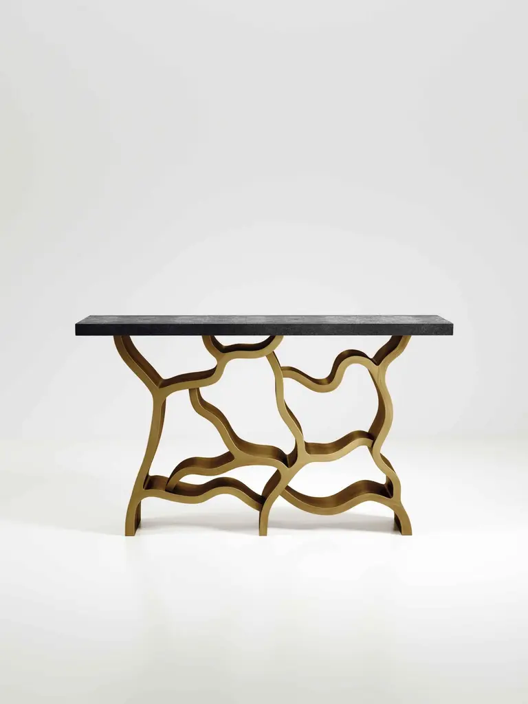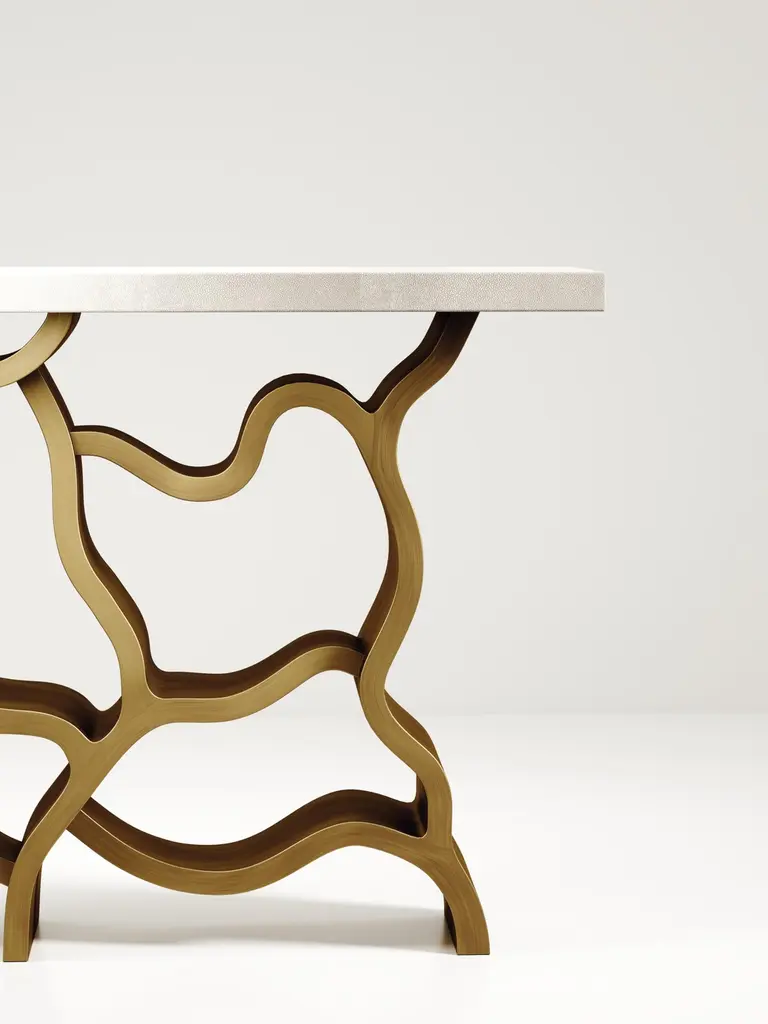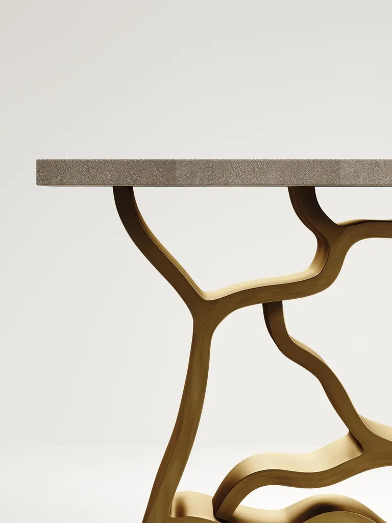The Paris based label has distinguished themselves since their launch, with their iconic use of shagreen mixed with brass and other exotic materials. All furniture is handcrafted by skilled artisans, ultimately making each piece unique, designed in Paris and produced in the Philippines.The Leaf Console Table by Kifu Paris is a dramatic and organic piece. The cream shagreen inlaid rectangle top sits on a striking bronze-patina brass base that emulates intertwining branches. This piece is designed by Kifu Augousti the daughter of Ria and Yiouri Augousti. Available in other finishes The finish of the shagreen is authentic as it is hand-dyed and the designer calls the finish look: "antique natural shagreen"The dimensions of this piece are 150 x 35 x 90 cmAll Kifu Paris pieces are handmade by artisans, ultimately making each piece unique.Custom color/sizing available on request.Wipe clean with soft dry cloth.Although inspired by her parents, her collection of Home Accessories and Furniture is a distinct identity of its own. Kifu uses handmade techniques of elaborate inlay patterns of shagreen, shells, semi-precious stones, materials she experienced as a child growing up in her parent’s studio, but interpreted in a younger quirkier way reflecting her youth. From her "jewelry inspired knobs" on decorative boxes, gold bar boxes and an extravagant inlay pattern mix of shagreen and shell inspired by galactic constellations, as seen on her enormous round mirror, is refreshing to see. Kifu embodies whimsical elements throughout her collection and is not afraid to be daring and unexpected in her approach to design.All shagreen-covered items should be kept out of direct sunlight, color variants may occur on the stingray and other exotic finishes, but this showcases the Parisian label's commitment to creating authentic luxurious products using natural components.