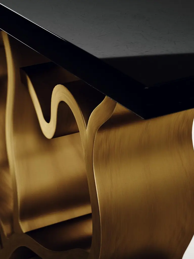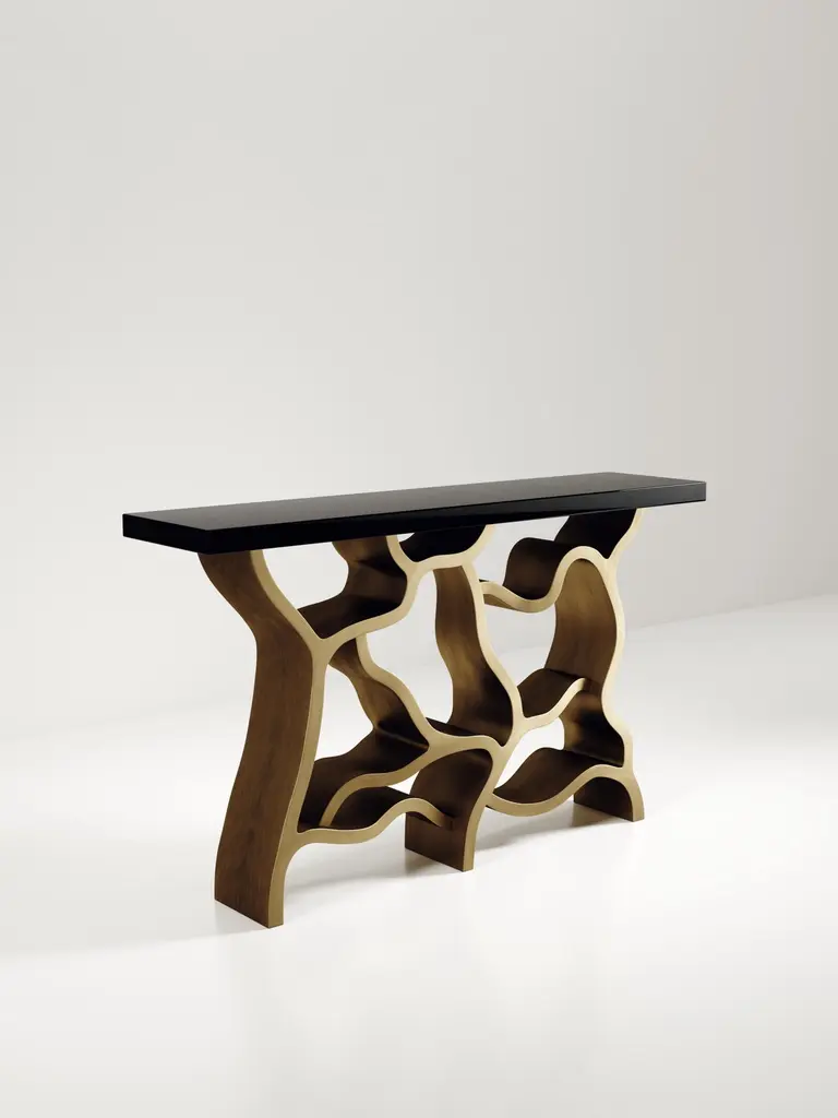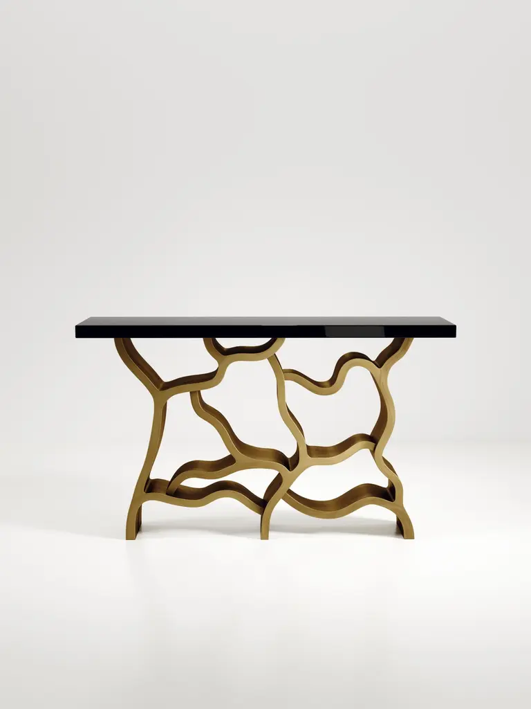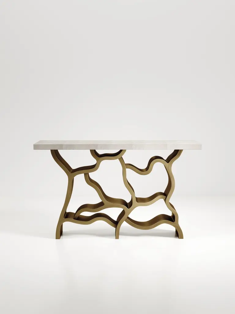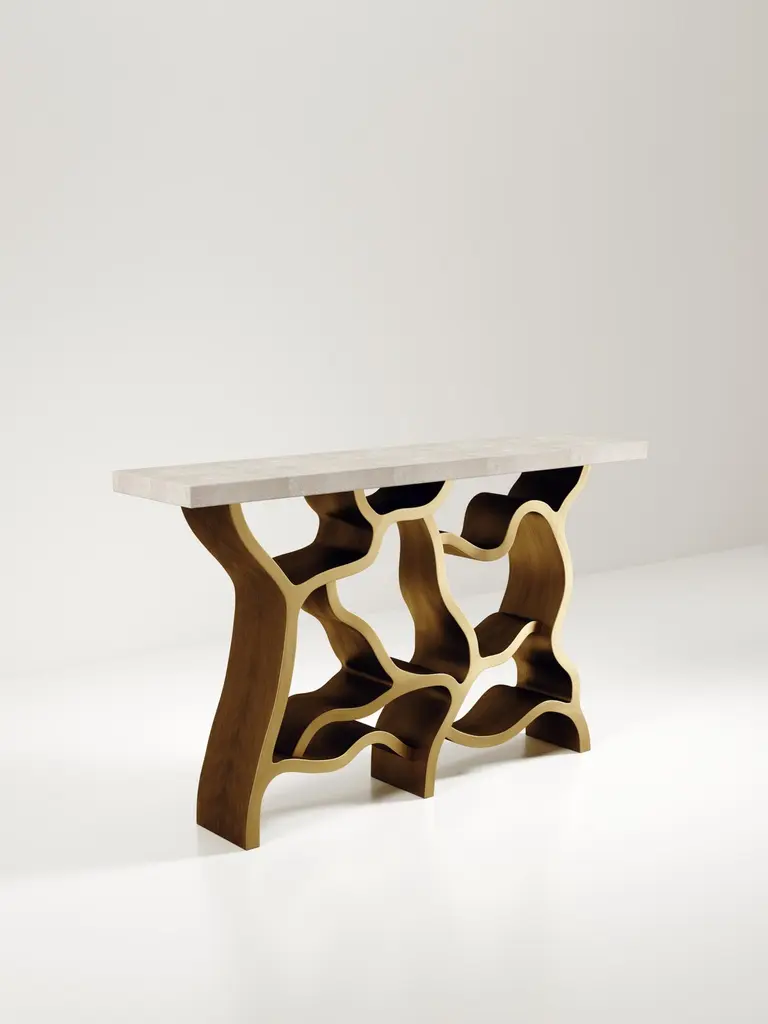 The Paris based label has distinguished themselves since their launch, with their iconic use of shagreen mixed with brass and other exotic materials. All furniture is handcrafted by skilled artisans, ultimately making each piece unique, designed in Paris and produced in the Philippines.The Leaf Console Table by Kifu Paris is a dramatic and organic piece. The cream shagreen inlaid rectangle top sits on a striking bronze-patina brass base that emulates intertwining branches. This piece is designed by Kifu Augousti the daughter of Ria and Yiouri Augousti. Available in other finishes The finish of the shagreen is authentic as it is hand-dyed and the designer calls the finish look: "antique natural shagreen"The dimensions of this piece are 150 x 35 x 90 cmAll Kifu Paris pieces are handmade by artisans, ultimately making each piece unique.Custom color/sizing available on request.Wipe clean with soft dry cloth.Although inspired by her parents, her collection of Home Accessories and Furniture is a distinct identity of its own. Kifu uses handmade techniques of elaborate inlay patterns of shagreen, shells, semi-precious stones, materials she experienced as a child growing up in her parent’s studio, but interpreted in a younger quirkier way reflecting her youth. From her "jewelry inspired knobs" on decorative boxes, gold bar boxes and an extravagant inlay pattern mix of shagreen and shell inspired by galactic constellations, as seen on her enormous round mirror, is refreshing to see. Kifu embodies whimsical elements throughout her collection and is not afraid to be daring and unexpected in her approach to design.All shagreen-covered items should be kept out of direct sunlight, color variants may occur on the stingray and other exotic finishes, but this showcases the Parisian label's commitment to creating authentic luxurious products using natural components.