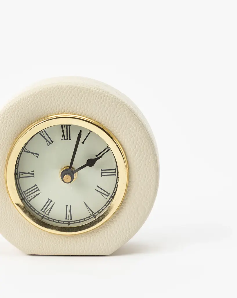 The Shagreen Table Clock has intricate detail and elegantly mixed materials, making its simple shape sophisticated and charming. Made by skilled craftsman, the traditional clock face is framed with cream shagreen leather.