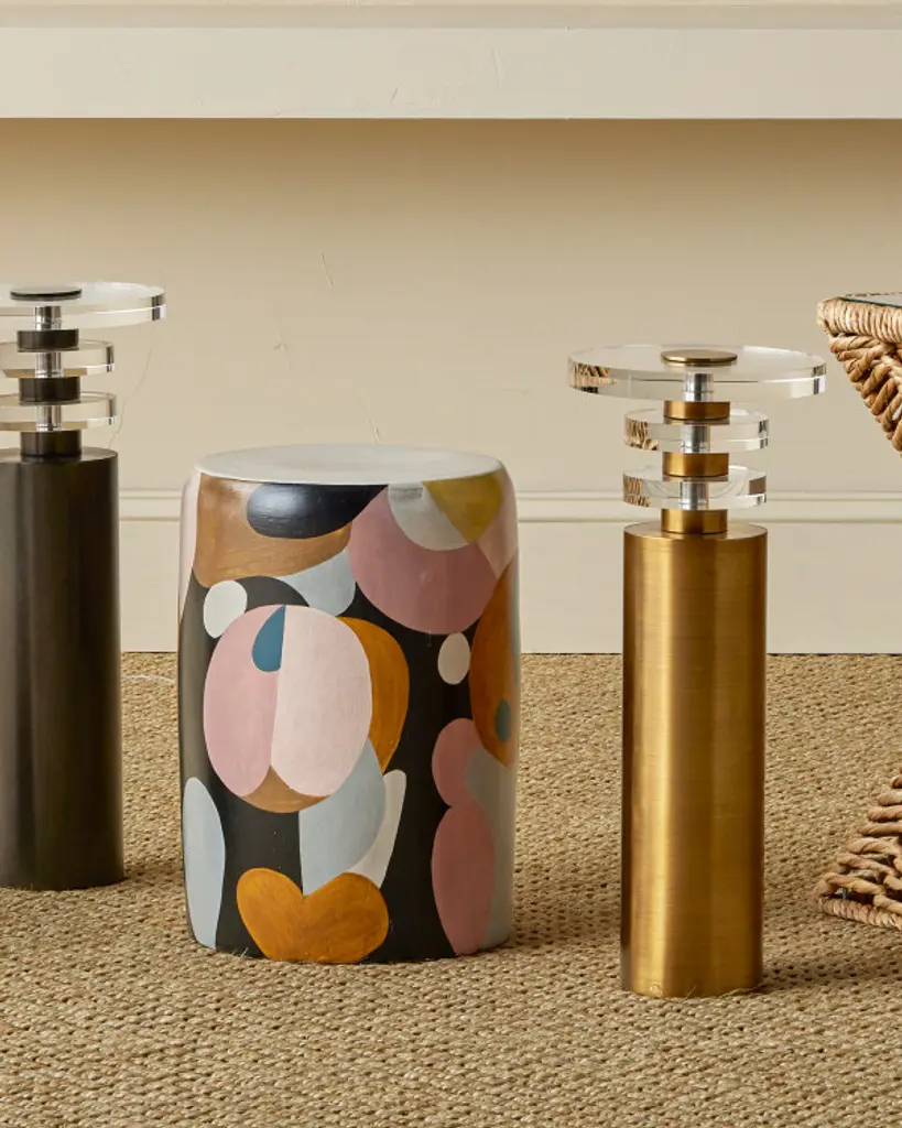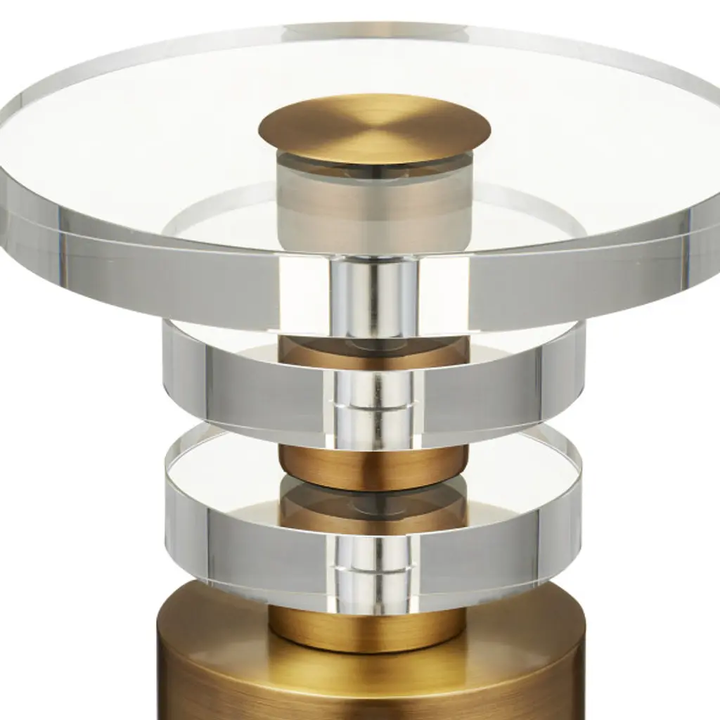 The Shani Drinks Table is made of metal and discs of clear optic crystal. The profile of this drinks table makes it an excellent choice for mid-century modern interiors, and it will be particularly perfect for rooms that could use a pop of color. The cap that fastens the top of this columnar drinks table to its pedestal elegantly rises above the surface, adding a unique and distinctive touch to its clean design.