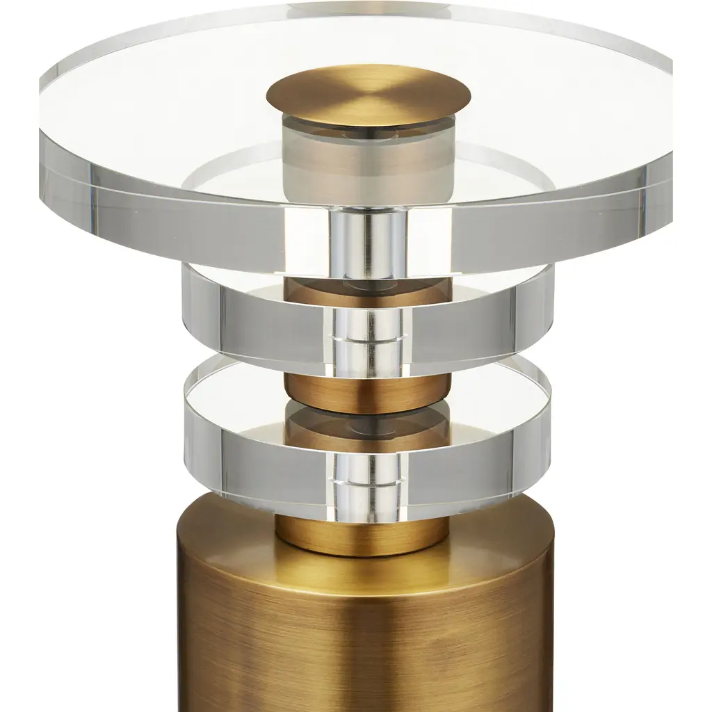 The Shani Brass Drinks Table is made of metal in an antique brass finish and discs of clear optic crystal. The profile of this gold drinks table makes it an excellent choice for mid-century modern interiors, and it will be particularly perfect for rooms that could use pops of bright gold. The cap that fastens the top of this columnar drinks table to its pedestal elegantly rises above the surface, adding a unique and distinctive touch to its clean design.