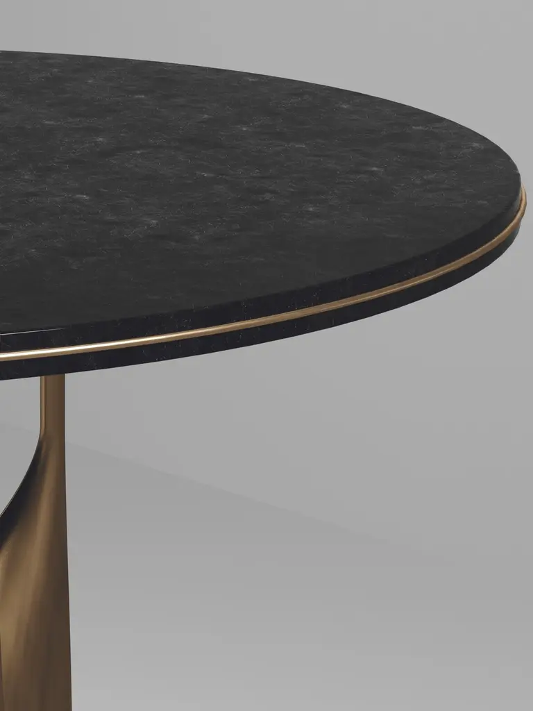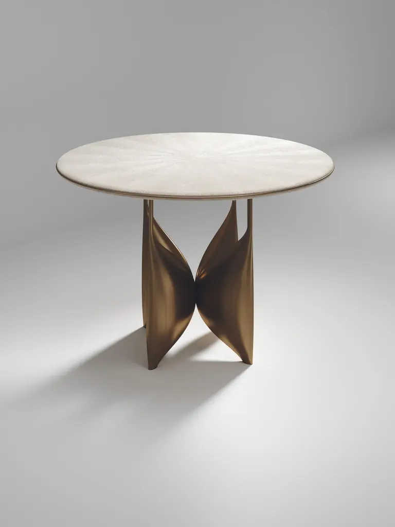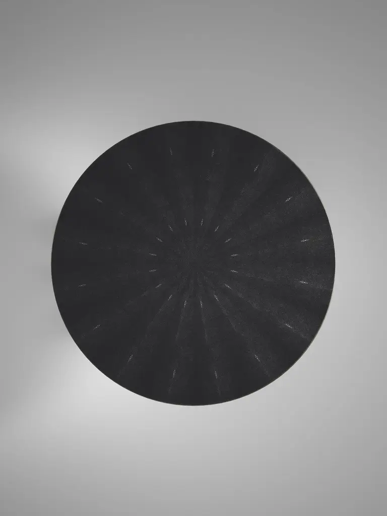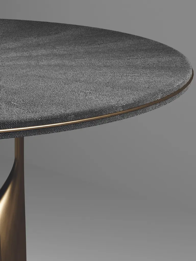 The Paris based label has distinguished themselves since their launch, with their iconic use of shagreen mixed with brass and other exotic materials. All furniture is handcrafted by skilled artisans, ultimately making each piece unique, designed in Paris and produced in the Philippines.The Plumeria breakast table by Kifu Paris is a dramatic and elegant piece. The black pen shell inlaid top sits on a sculptural bronze-patina brass base that is conceptually inspired by bird feathers floating on top of a lake. The border of the top is accentuated by a subtle and elegant bronze-patina brass indentation detail. This piece is designed by Kifu Augousti the daughter of Ria and Yiouri Augousti. Available in other finishes. Part of the Plumeria Capsule, see images of the collection at end of the slide.The dimensions of this piece are 110 diameter x 75 cmAll Kifu Paris pieces are handmade by artisans, ultimately making each piece unique.Custom color/sizing available on request.Wipe clean with soft dry cloth.Although inspired by her parents, her collection of Home Accessories and Furniture is a distinct identity of its own. Kifu uses handmade techniques of elaborate inlay patterns of shagreen, shells, semi-precious stones, materials she experienced as a child growing up in her parent’s studio, but interpreted in a younger quirkier way reflecting her youth. From her "jewelry inspired knobs" on decorative boxes, gold bar boxes and an extravagant inlay pattern mix of shagreen and shell inspired by galactic constellations, as seen on her enormous round mirror, is refreshing to see. Kifu embodies whimsical elements throughout her collection and is not afraid to be daring and unexpected in her approach to design.All shagreen-covered items should be kept out of direct sunlight, color variants may occur on the stingray and other exotic finishes, but this showcases the Parisian label's commitment to creating authentic luxurious products using natural components.