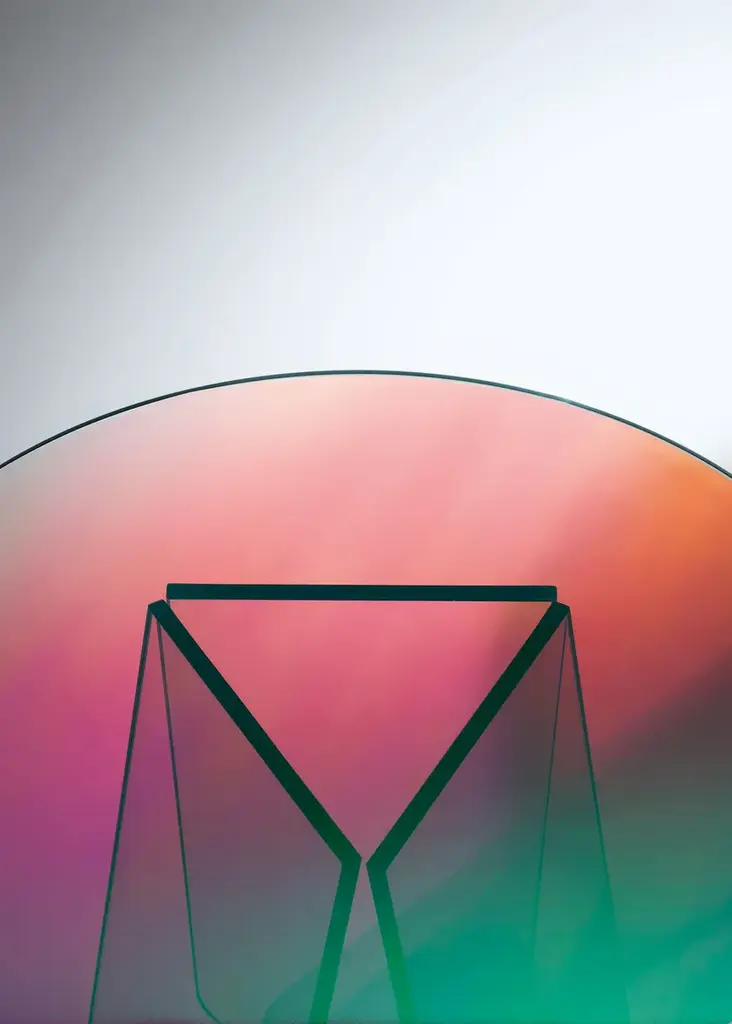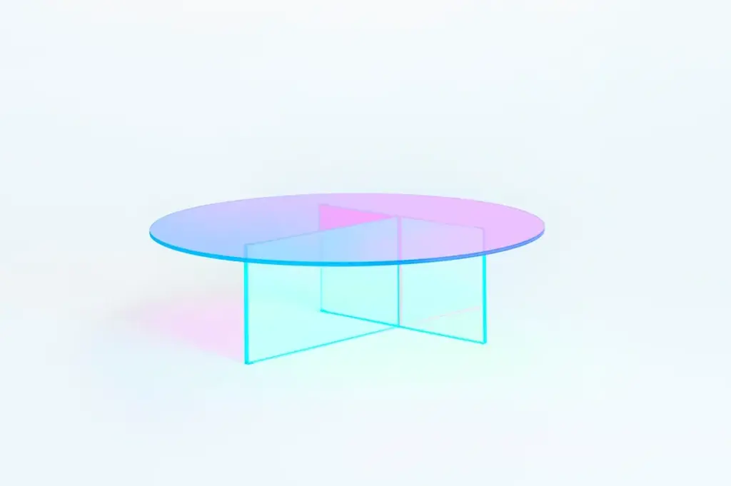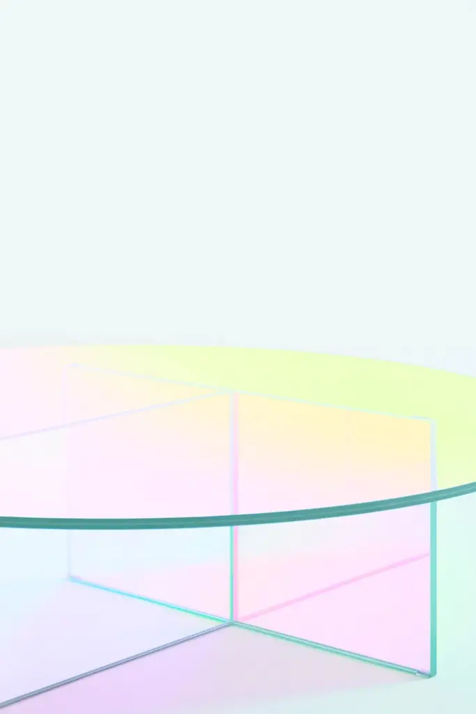 High tables, low tables and consoles in laminated and glued glass, characterized by a special iridescent multichromatic finish; the nuance varies according to the angle of the light source and the vantage point. Reflected objects with a magical and ethereal appearance emerge. The high tables bases can be dismantled and are fixed to the top by means of metal plates, concealed by a circular decorated covering.Attention: the presence of small scratches, irregularities and non homogeneous coloring, are an intrinsic feature of the special material use.
