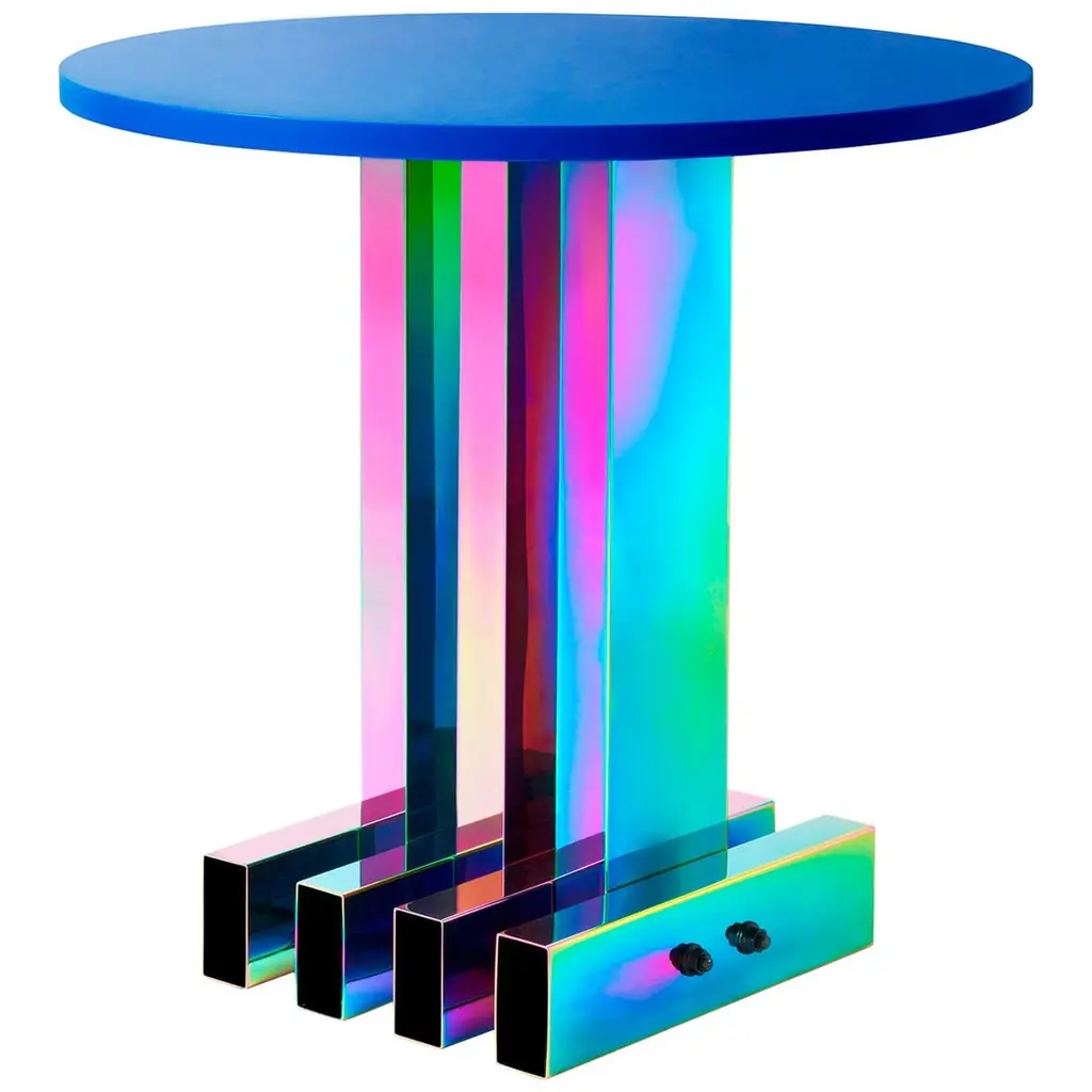 Patricia Urquiola conceived this stylish table to exalt the versatility of glass. The iridescent finish boasts ever-changing hues that shift depending on the light source, angle, and position of the viewer. The slanted panels forming the tripod base sustain the circular top, creating a harmonious look with a touch of glamour. Slight irregularities from the pictured item are to be expected due to the material used.