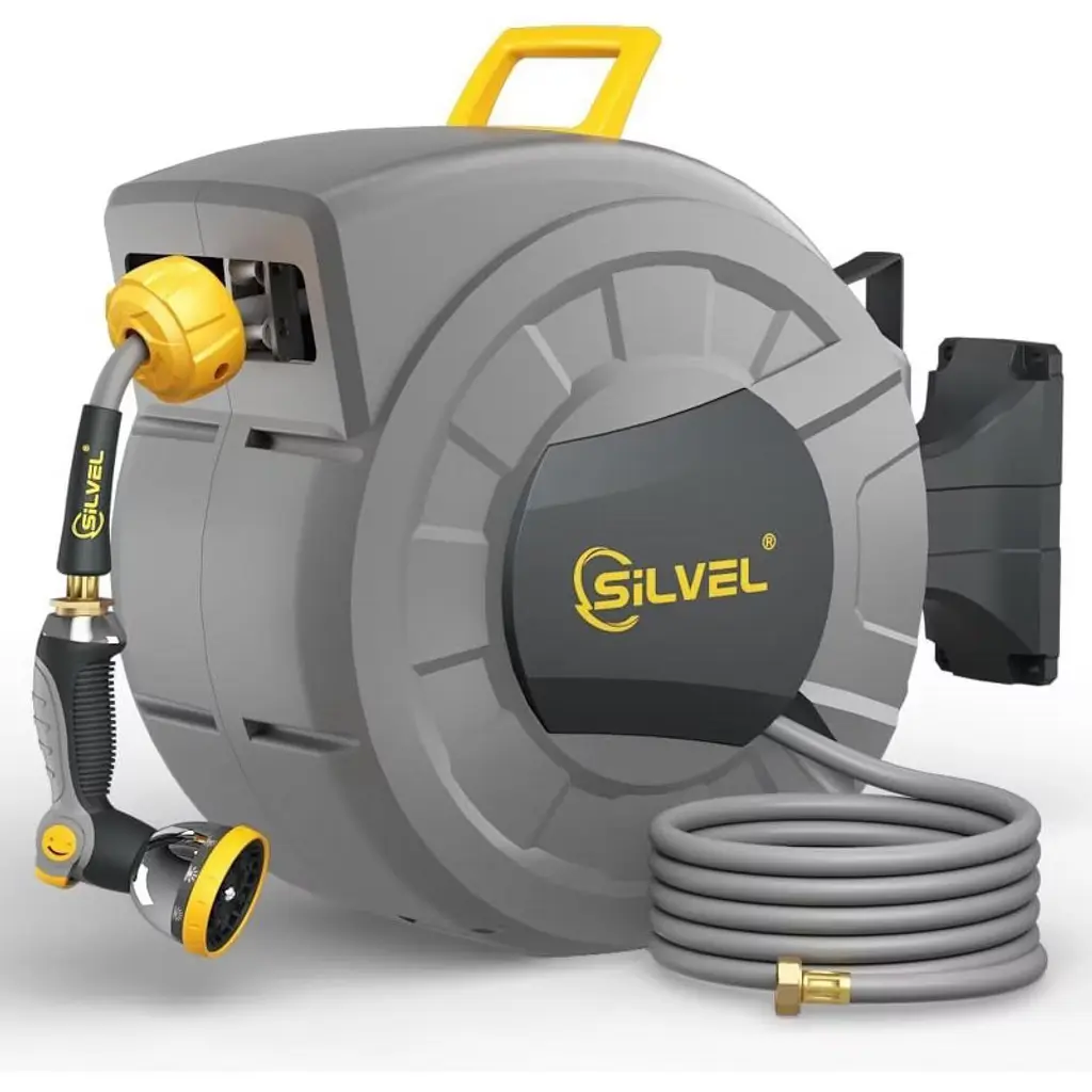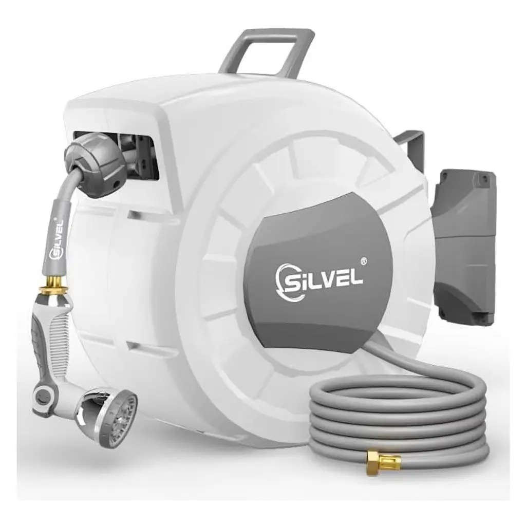Silvel Retractable Garden Hose Reel, 1/2 In X 100 Ft Wall Mounted Garden Hose Reel, With 10 Pattern Nozzle, Any Length Lock, Slow Return System