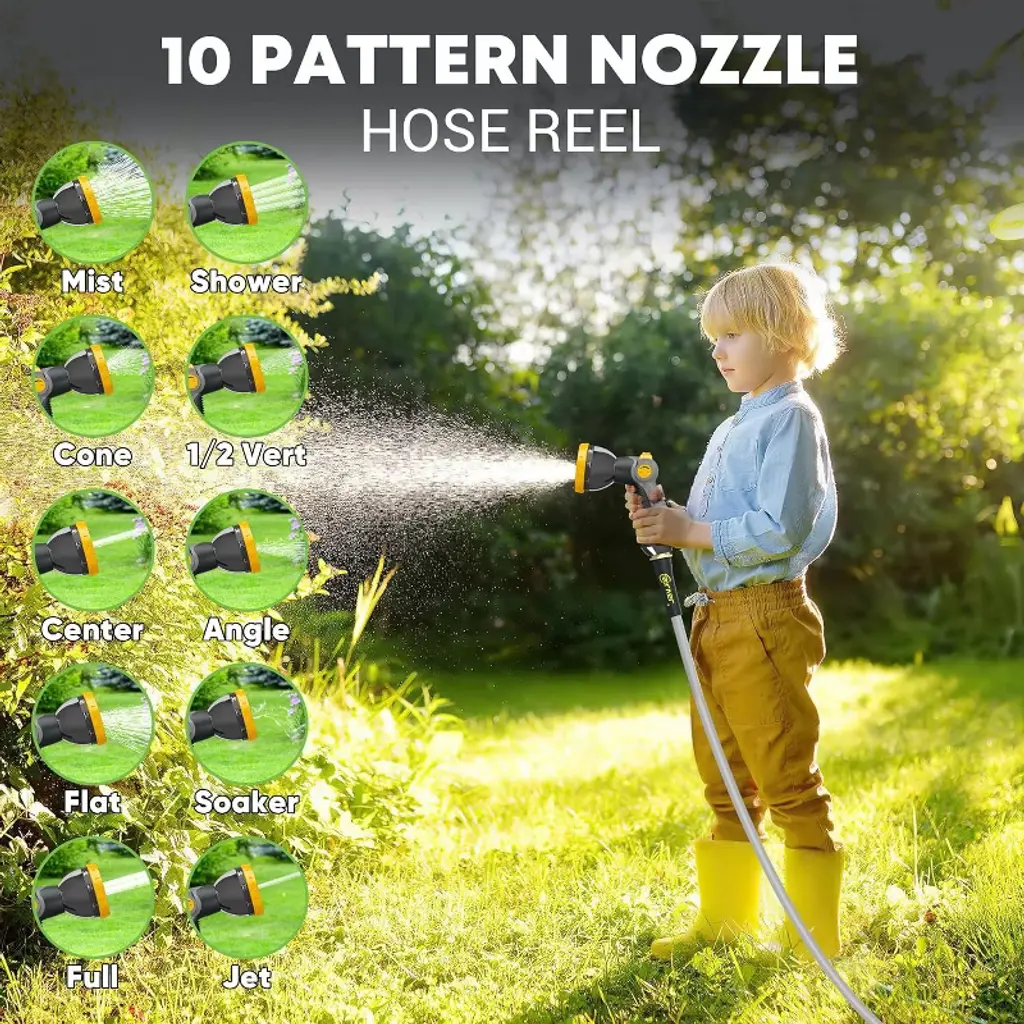 【Tangle-Free & Smooth Auto-Retraction】Enjoy uninterrupted, kink-resistant watering with SILVEL’s retractable hose reel. The automatic locking mechanism holds the hose securely at any length—no more tangles or interruptions. When done, the gentle slow-retract system smoothly winds the hose back automatically, making storage neat and effortless. 【180° Swivel for Total Coverage】Featuring a heavy-duty swivel bracket with a full 180° rotation, this hose reel helps you water hard-to-reach areas with ease. Perfect for lawns, flower beds, patios, and hanging plants—never compromise on coverage again. 【10 Spray Patterns for Every Task】Includes a versatile 10-mode spray nozzle, offering the right spray for every need—from a soft mist for delicate plants to a powerful jet for cleaning decks and driveways. Handle all watering and washing tasks with one convenient nozzle. 【UV-Resistant & Weatherproof Housing】Designed with a rugged, UV-protected housing, this reel resists sun, rain, and wind without fading or cracking. Its ashy yellow finish stays vibrant and performance remains reliable—season after season. 【All-Weather Toughness & Leak-Proof Design】Engineered with a frost-resistant PP shell and a triple-layer PVC hose, this reel performs flawlessly in extreme heat and cold. Tested at 200 PSI working pressure and 600 PSI burst pressure, it delivers leak-free operation and long-lasting durability. 【Complete Package for Quick Setup】 Everything you need to get started is included: 1 SILVEL retractable reel with 110FT hose, 1*hose nozzle, 1*10-function spray nozzle, 1*wall mount, 4*bolts, and 1*easy-to-follow user’s manual. Assemble and install in minutes—no extra tools or parts required.