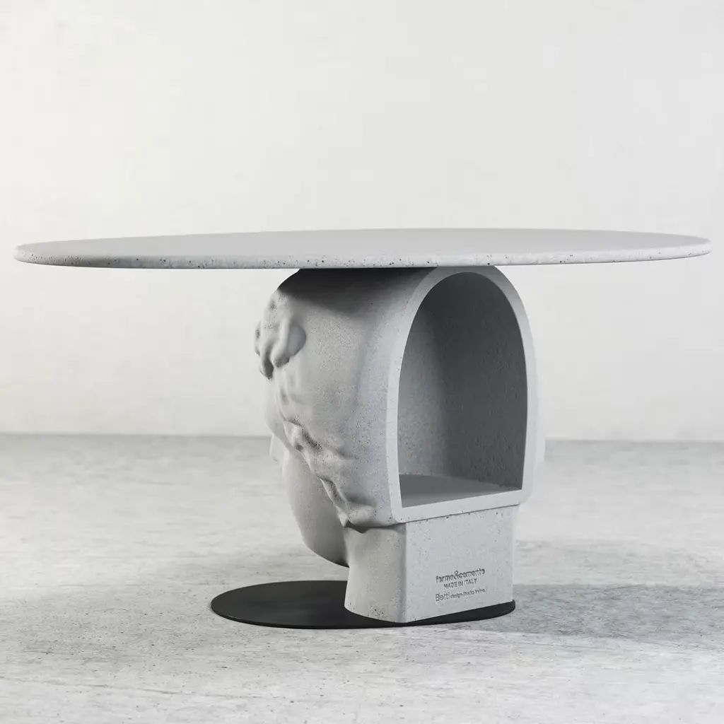 This table features a base in the shape of a mysterious, anthropomorphic female head. Made from concrete, its classical style in delicate silver creates a gentle, soft look. It is completed by a color-matched, thin, round top. It can be mixed and matched with other items in this line by Marialaura Rossiello Studio Irvine.