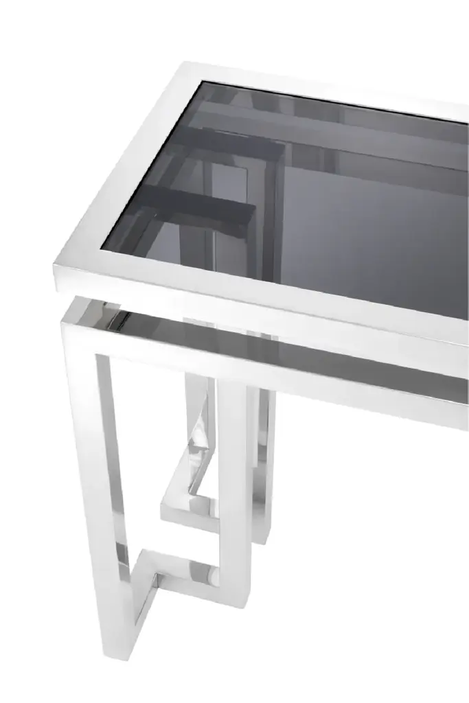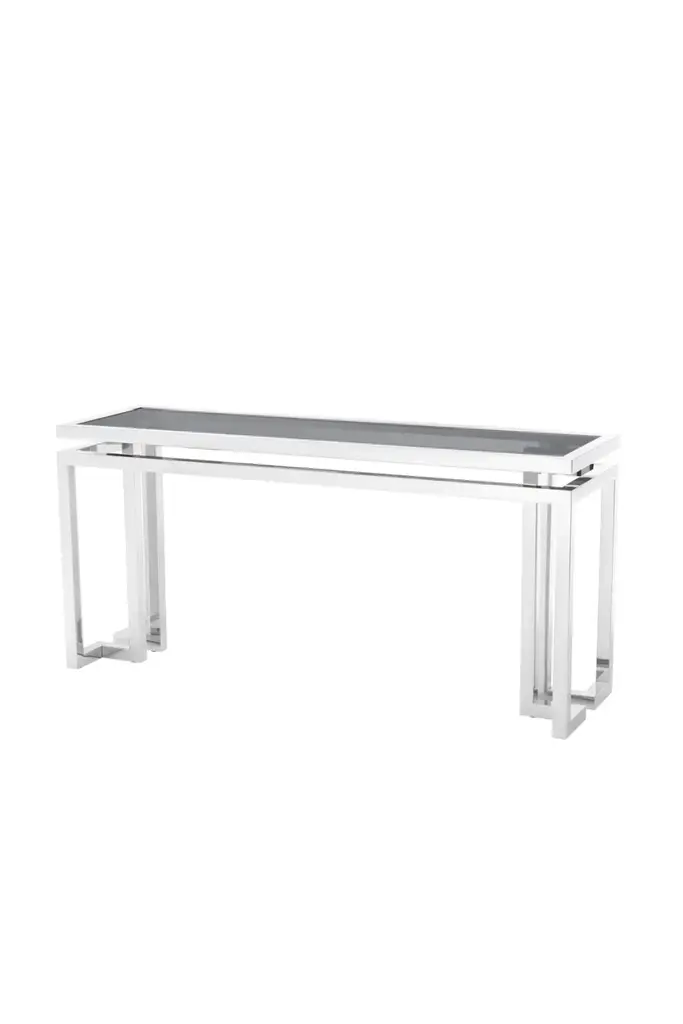 Relive the unmatched grandeur of the Art Deco era with the first-rate Palmer Console Table. Crafted from stainless steel, it features a polished finish and a tempered smoke glass tabletop. Combine with luxury lighting and accessories of the Eichholtz collection for a glamorous interior.Download Assembly Sheet