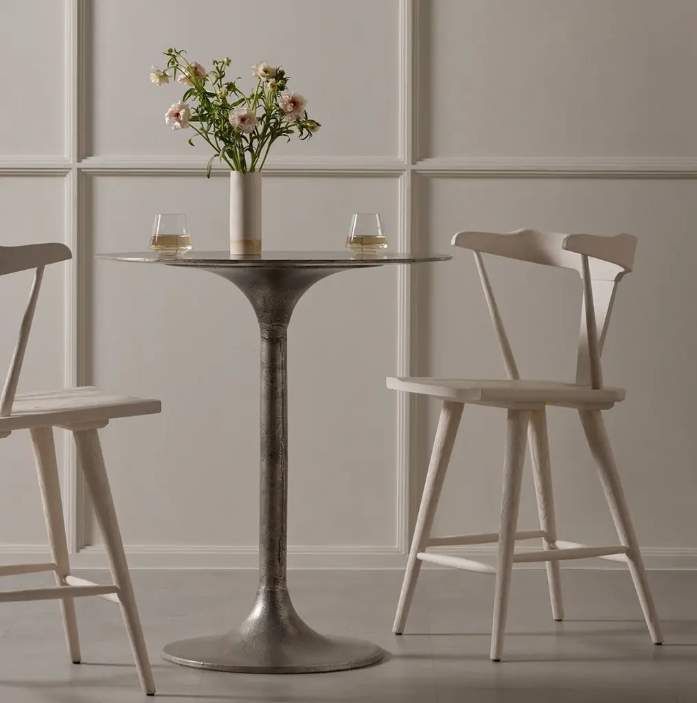Classic tulip shaping in textural cast-aluminum makes for a modern counter table. Finished in a raw antique rust or nickel to bring out alluring highs and lows, indoors or out. Cover or store inside during inclement weather and when not in use. In Stock Early February 2026 In Stock Early January 2026 Aluminum construction This image is for illustrative purposes only. The colors shown are accurate within the constraints of lighting, photography, and the color accuracy of your screen.
