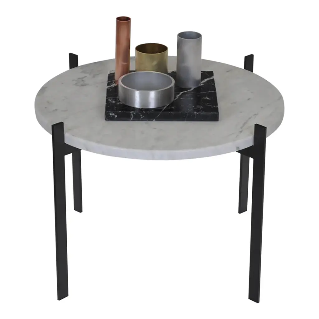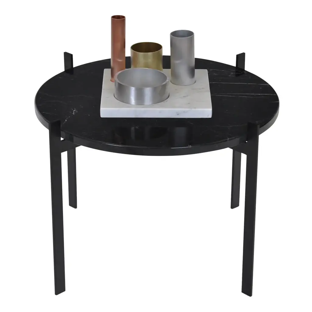 Frame made in powder coated steel or brass (steel with brass surface). Marble tops are to be screwed on to the metal frame. Glass tops can be clicked onto the frame. Leather tables will be delivered assembled. Table tops in Carrara Marble, Black Marquina, Green Indio, or Brown Emperador will exhibit natural variations in terms of colour, drawings and patterns characteristic for each type of marble. As for Carrara Marble, small cracks can sometimes be found on the polished surface. This phenomenon known as “taroli" is a natural characteristic of the stone, which cannot be eliminated completely. Leather is handmade by skilled craftsmen using high-quality 100 % vegetable tanned aniline leather with a general thickness of 3 mm or more. Natural imperfections on leather surface must be accepted. With time, light and use, the leather will gain depth and lustre as it ages. Due to the highly artisan process used and variation in the natural raw material, leather can wary quite significantly in colour between production batches.