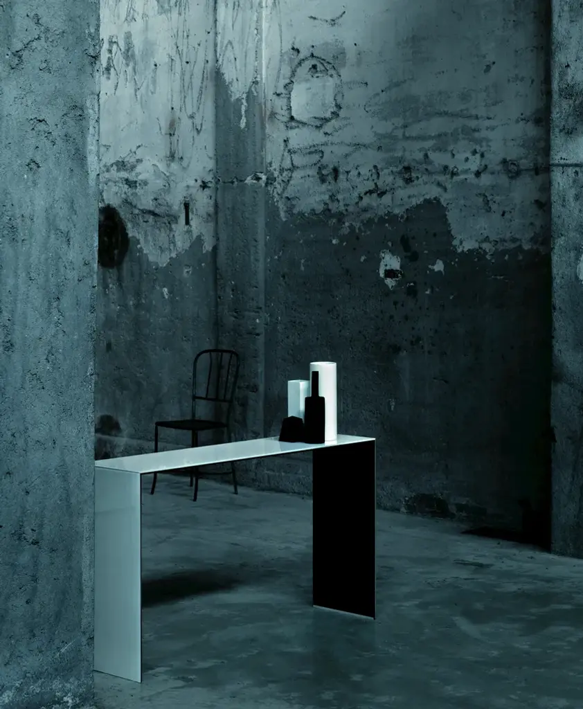 SiO2 Bridge is a set of bridge-shaped low tables, consolle and desk in coupled laminated glass.Available in glossy lacquered and opaque lacquered glass, with the possibility to combine freely the colour of the lower side with the colour of the upper side.Finishes:- Glossy lacquered glass- Opaque lacquered glass