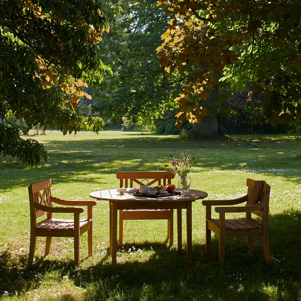 The round table seats 4 people. Launched in 1982, Drachmann is Skagerak's longest-living outdoor series – and it's still going strong. Inspired by the Danish poet and painter Holger Drachmann, the design strikes a timeless balance between Nordic nostalgia and modern simplicity.