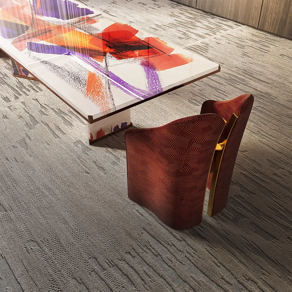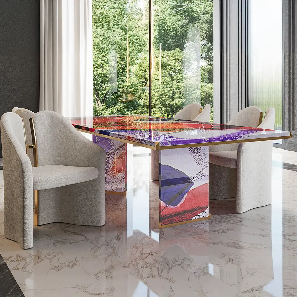This rectangular table features hand-painted triangular bases by Alessandra Bisi, showcasing a unique and artistic design. The top is finished with a clear resin coating, enhancing its smooth and polished look. The metal corner accents, painted for added detail, provide a modern contrast to the organic shapes. Perfect for contemporary spaces, this table combines creativity, craftsmanship, and elegance, making it a standout piece in any room. This product is a one-of-a-kind piece.