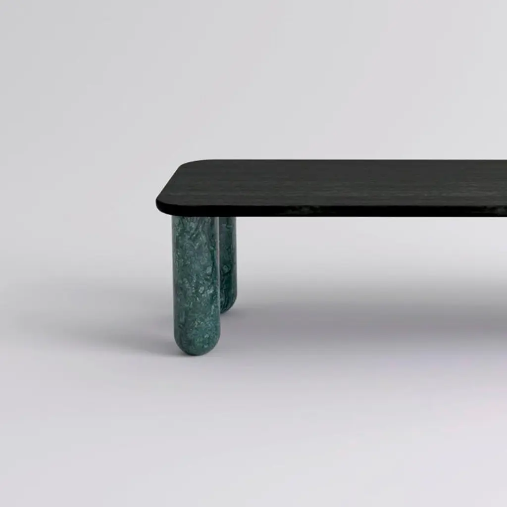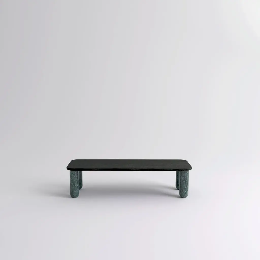 Small Black Wood and Green Marble "Sunday" coffee table, Jean-Baptiste SouletieDimensions: 50 W x 150 D x 35 H cmMaterials: Indio green marble legs, black stained wood top.Available in 4 sizes: D150, W50 / D200, W50 / D150, W100 / D200, W100.Available in 5 top materials: walnut / black stained wood / Pele de Tigre marble / Black Marquina marble / Indian green marble.Available in 3 leg materials: Pele de Tigre marble / Black Marquina marble / Indian green marble.Sunday is a family of coffee tables and low consoles with a simple and clean design vocabulary. The combination of heavy marble legs with the thin solid wood or marble top creates an interesting contrast while the rounded edges and generous proportions provide a comforting feeling.Jean-Baptiste Souletie is the Co-founder of the furniture editor La Chance with Louise Breguet. He studied in India, worked for a merchant bank in London (where he designed their new offices), before working for an investment fund (where he redevised the graphic chart), and in the strategic department of a luxury goods company in Paris. He returned to his first loves, architecture and furniture, when he founded La Chance in 2012.
