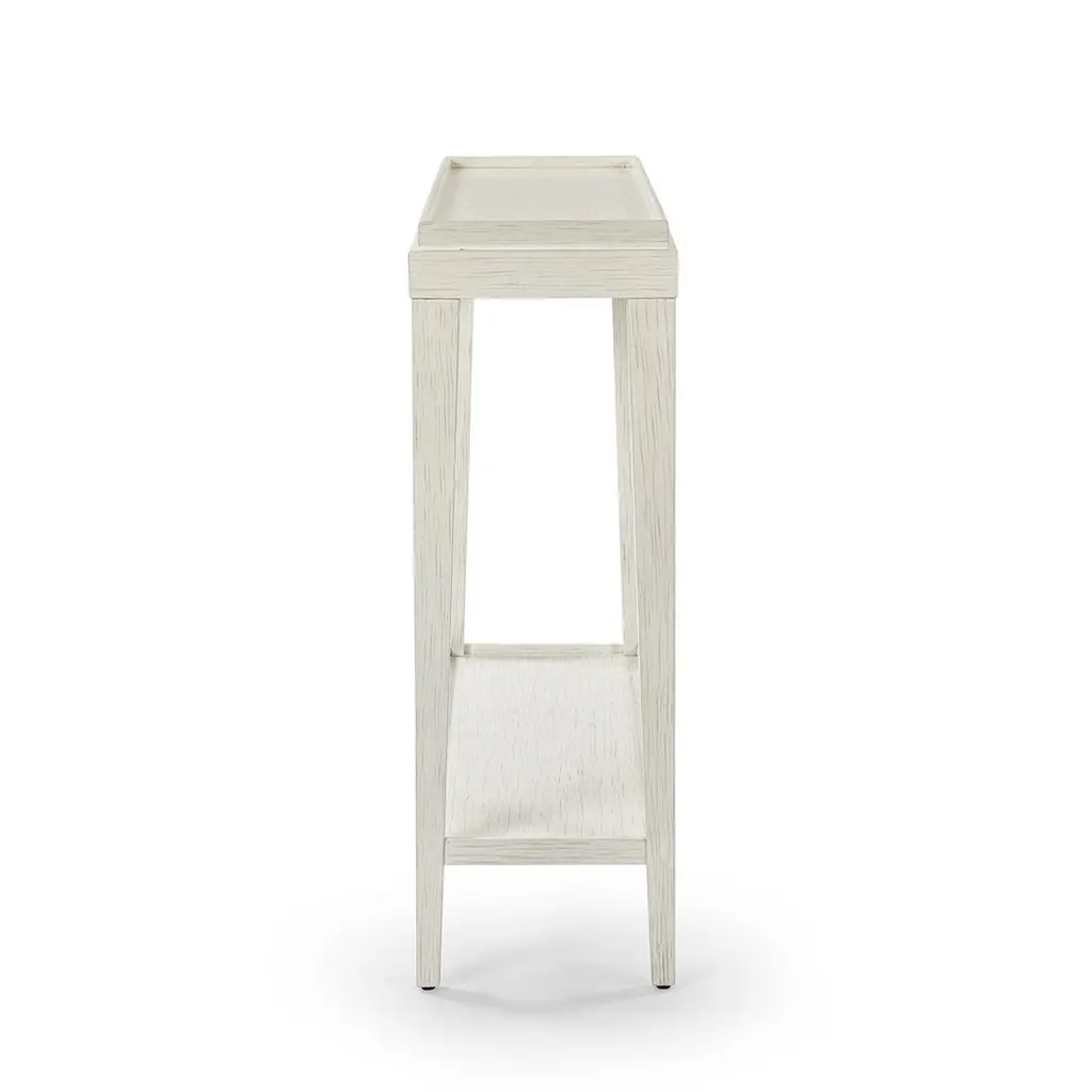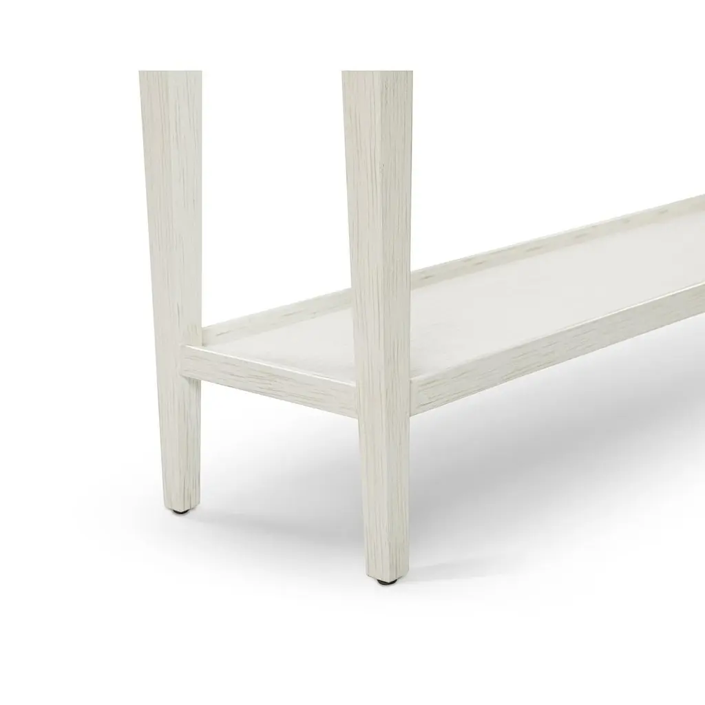 Crafted with a wooden galleried dish top and finished in a hand-rubbed with subtle distressing, this console table exudes a rustic yet refined aesthetic.This beautifully crafted piece features a ‘drift’ white painted finish with subtle grey distressing, exuding rustic charm with a refined touch.The square tapered legs provide a sophisticated silhouette, while the lower shelf stretcher offers additional space for storage or decor. Compact yet versatile, it’s perfect for entryways, hallways, or living spaces, blending seamlessly with both traditional and modern interiors.Dimension: 42" W x 11" D x 32" H