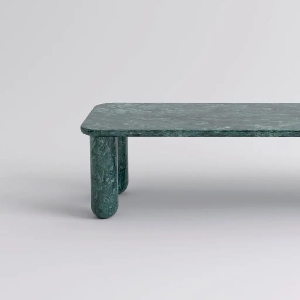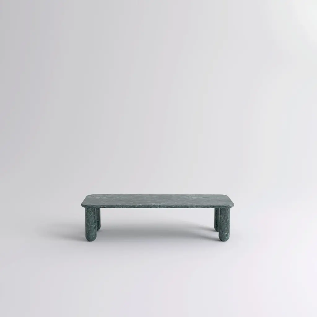 Small green marble "Sunday" coffee table, Jean-Baptiste SouletieDimensions: 50 W x 150 D x 35 H cmMaterials: Indio green marble.Available in 4 sizes: D150, W50 / D200, W50 / D150, W100 / D200, W100.Available in 5 top materials: walnut / black stained wood / Pele de Tigre marble / Black Marquina marble / Indian green marble.Available in 3 leg materials: Pele de Tigre marble / Black Marquina marble / Indian green marble.Sunday is a family of coffee tables and low consoles with a simple and clean design vocabulary. The combination of heavy marble legs with the thin solid wood or marble top creates an interesting contrast while the rounded edges and generous proportions provide a comforting feeling.Jean-Baptiste Souletie is the Co-founder of the furniture editor La Chance with Louise Breguet. He studied in India, worked for a merchant bank in London (where he designed their new offices), before working for an investment fund (where he redevised the graphic chart), and in the strategic department of a luxury goods company in Paris. He returned to his first loves, architecture and furniture, when he founded La Chance in 2012.