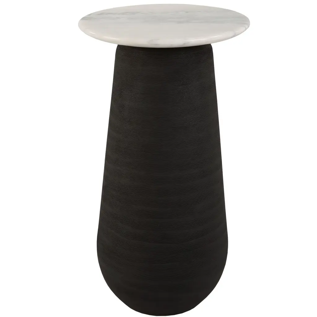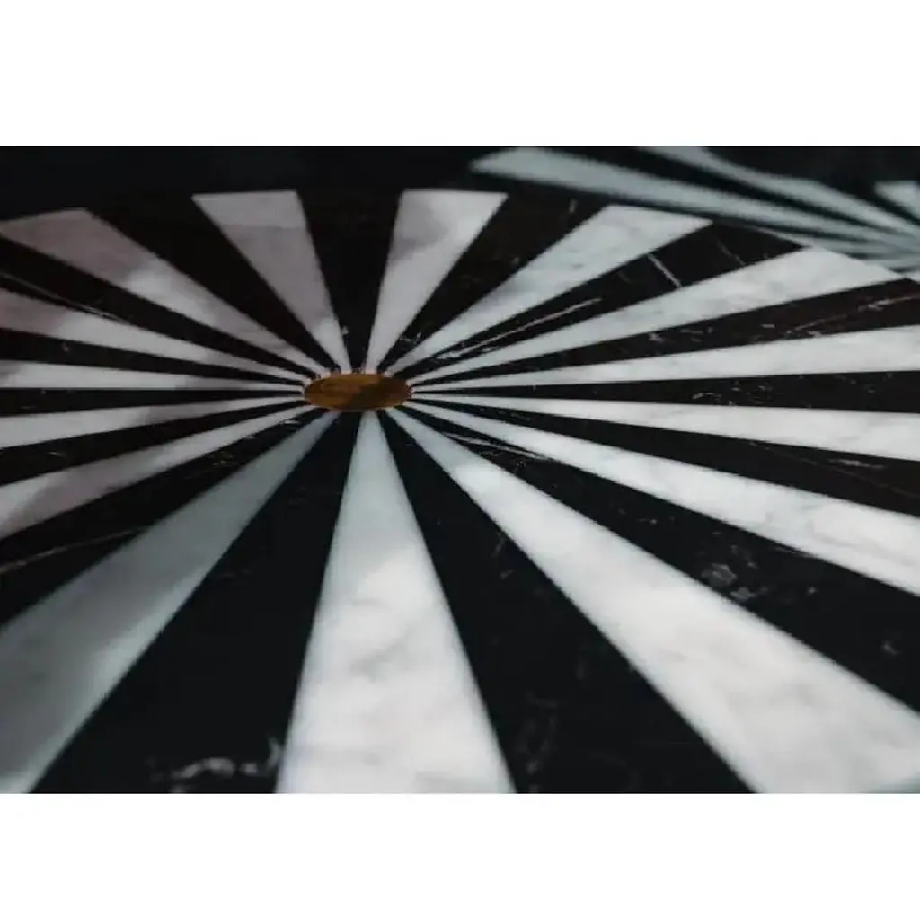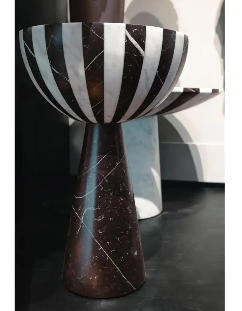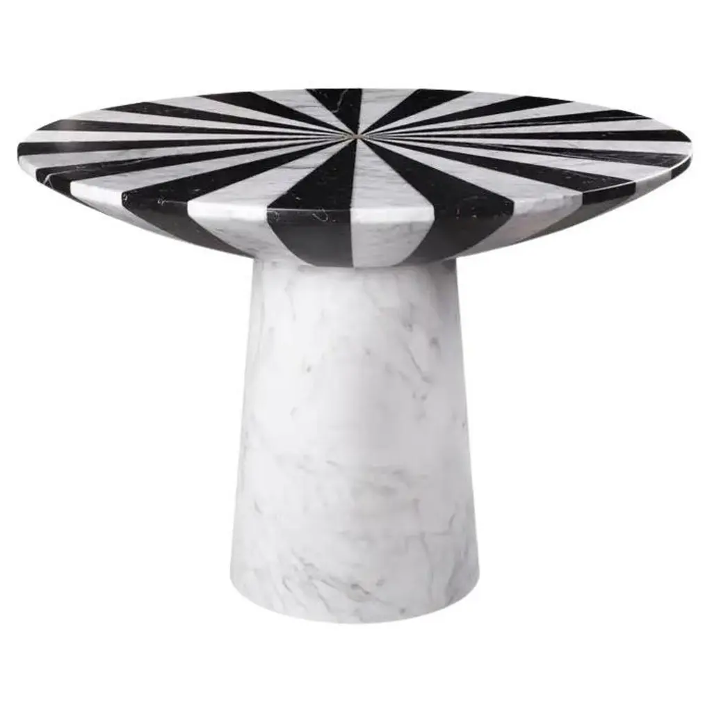Small Handcrafted Black & White Refined Marble Nova Table S by Jacopo SimonettiDimensions: Ø 45 (Top) x H 67 cm (or Ø 17.7 (Top) x H 26.4 in)Materials: Bianco Michelangelo and Nero Marquinia marble.Available in other combinations.Also available in Large version: Ø 80 (Top) x H 47 cm (or Ø 31.5 (Top) x H 18.5 in)Customization upon request. Hand-finished.Nova tables, available in the Small and Large size, will enchant the eye with their bold and beautiful stripes in Bianco Michelangelo and Nero Marquinia marble (also available in other combinations). Their simplicity and versatility are always welcome in an interior.Look at the top of Nova table. It is a solid representation of an expansion explosion from the tiny center of the sphere, colored expanding cloves (here black and white, but not limited to).How can a marble sphere give the representation of this complex wave-empty space? The inside of the top of Nova table is almost empty from the wave-skin to the nucleus! You cannot see, but you can hear it knocking with your hand the half sphere skin. A drum sound that changes with position and volume form and dimension.Each kind of table has its sound, each table has its own form and its ignition point and expansion low along the main 3dimensional axis. Actual Novas are similar but never identical!Stay close to a Nova table, imagine the brute force of nature and drink relaxed your preferred drink! No risk this time, in spite of Einstein formula E=mc2.The hypnotic black and white stripes of the new Nova collection, designed by Jacopo Simonetti, offer a versatile way to add personality to your interior, a classic that never gets old, and that will bring you to a fascinated universe.Nova collection puts on stage a new technique with which to create complex forms that finely and lightly mix different colored marbles cloves of significant depth.This allows the creation of fine objects with intermixed color cloves and the effect given by a solid work, at a third of the apparent weight.Designer imagination acquires a new dimension inside which to move "lightly".It is not by chance that Jacopo, invented and used first this technique.Born at the feet of the marble white Apuan Alps, young designer and master of marble working technique, with a degree from "Accademia delle Belle Arti” in Carrara, he is the third generation specimen of a family dealing with marble processing in all its way, not limited to: manual, machining, sawing, engraving, sculpturing. May be DNA donation.Nova, is like a solid representation of an expansion-explosion, as we see in some of NASA pictures taken from deep space of stars arrived at a end of one of their life cycles, NOVA isometric explosions, one of the more terrific and magnificent event of pure energy display in our Universe.Jacopo Simonetti, enchanted by the natural forces and beautifulness, was willing to use marble to represent the strength of this almost incredible display of force, a wave of particles energized, moving almost at light speed, leaving back a swept space and a very tiny still alive stellar nucleus.All the objects of Nova family (tables, bowls, candle holder and vase) bring with them the primeval brute and magnificent force of stellar collapse and energy creation.Marble products are made of valuable materials and need to be handled with care. Any difference between similar objects and from their picture on the catalogue are due to the nature of the marble, and costitute an additional value of each piece, making it truly unique and special. The contact with acid or corrosive substances may adversely affect the surface. Hand washing is recommended. Special stain treatment, where necessary food compatible.Since he was born at the foot of Apuan Alps he was surrounded by white marbles, dusted craftsmen and used to hear the music of machines working that pure material. He gained craftsman experience in the workshops of his Pietrasanta, renowned center for marble working and sculpture. He furthered his studies at the Carrara Academy of Fine Arts, where he learned also to pair this exquisite material with modern design.Jacopo Simonetti is a young talented designer that, in spite of its age, masters the matching of ideas, marbles and technology. His work stands out for the creation of products that combine classical simplicity and beauty with the dynamic and functional nature of modern design.