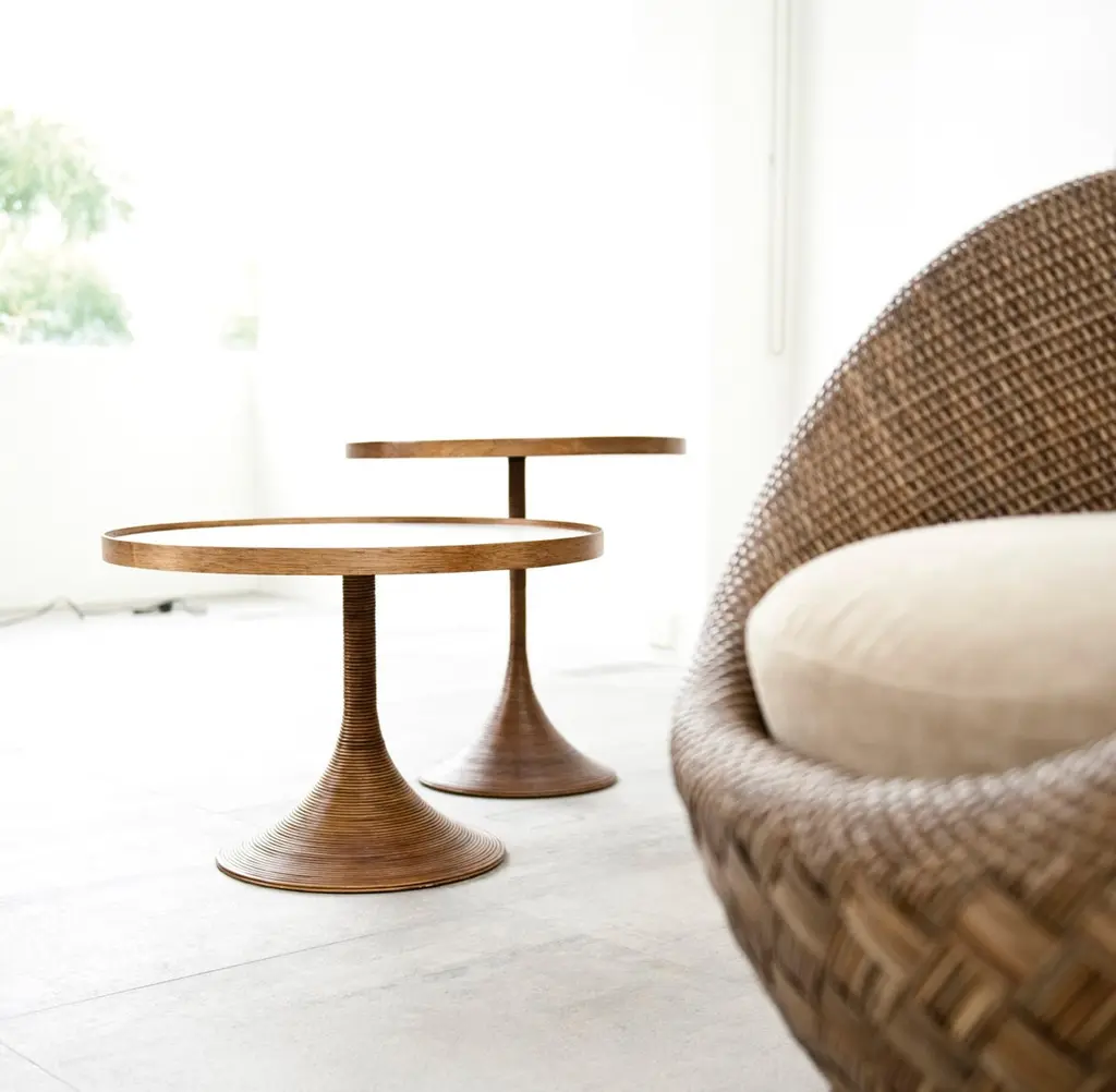Small La Luna table by Kenneth CobonpueMaterials: Rattan, High-pressure laminate, Maple. Also available in other colors.Dimensions: Diameter 50 cm x Height 50 cmLa Luna’s quiet sophistication is defined by a soft, round shape that feels like a snug embrace. This collection is made of rattan and maple, and features two different weaves that seamlessly merge, making it a classic masterpiece in the art of weaving.Designer's BiographyKenneth Cobonpue is a multi-awarded furniture designer and manufacturer from Cebu, Philippines. His passage to design began in 1987, studying Industrial Design at the Pratt Institute in New York. While completing his studies, he apprenticed for a leather and wood workshop near Florence, Italy. He went on to study Furniture Marketing and Production at the Export-Akademie Baden-Württemberg in Reutlingen, Germany, under a private and state scholarship program, and subsequently worked in Bielefeld and Munich.Kenneth returned home to Cebu in 1996 to manage Interior Crafts of the Islands, Inc., a furniture design and manufacturing company founded by his mother Betty Cobonpue in 1972. Discovering that modern design could have a new face using natural fibers and materials, Kenneth created pieces of functional art, offering an alternative to the Western definition of modern design. Today, the Kennethcobonpue brand has become known globally for its unique designs and extensive roster of clientele, including Hollywood celebrities and members of royalty.With his masterful way of integrating nature, traditional craft and innovative technologies, designer and creative director Kenneth Cobonpue has earned international awards and recognition for his creative, organic, and expressive pieces. Working closely with some of the world’s leading designers, from household names to emerging talents, Kenneth has been pushing the envelope for design in the Philippines and sharing his vision to a global audience. Awards to his credit include five Japan Good Design Awards, the grand prize at Singapore International Design Competition, the Design for Asia Award of Hong Kong, the American Society of Interior Design Top Pick selection and the French Coup de Coeur award. Several of his designs were selected for several editions of the International Design Yearbook published in London and New York. Phaidon’s book entitled “& FORK” underscores Kenneth’s position as a leader of a new movement incorporating new technologies with crafts. In 2007, TIME magazine called him “rattan’s first virtuoso”. Kenneth was named the Designer of the Year in the first edition of Maison et Objet Asia held in March 2014 in Singapore.Kenneth reveals new work each year in the design shows from Milan to New York, and he speaks regularly about Southeast Asian design all over the world. He has also appeared in European television and in countless international magazines and newspapers around the world. Various Cobonpue designs have also appeared in full-length feature films and television, such as Oceans 13 and CSI.