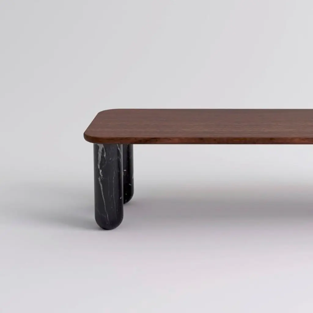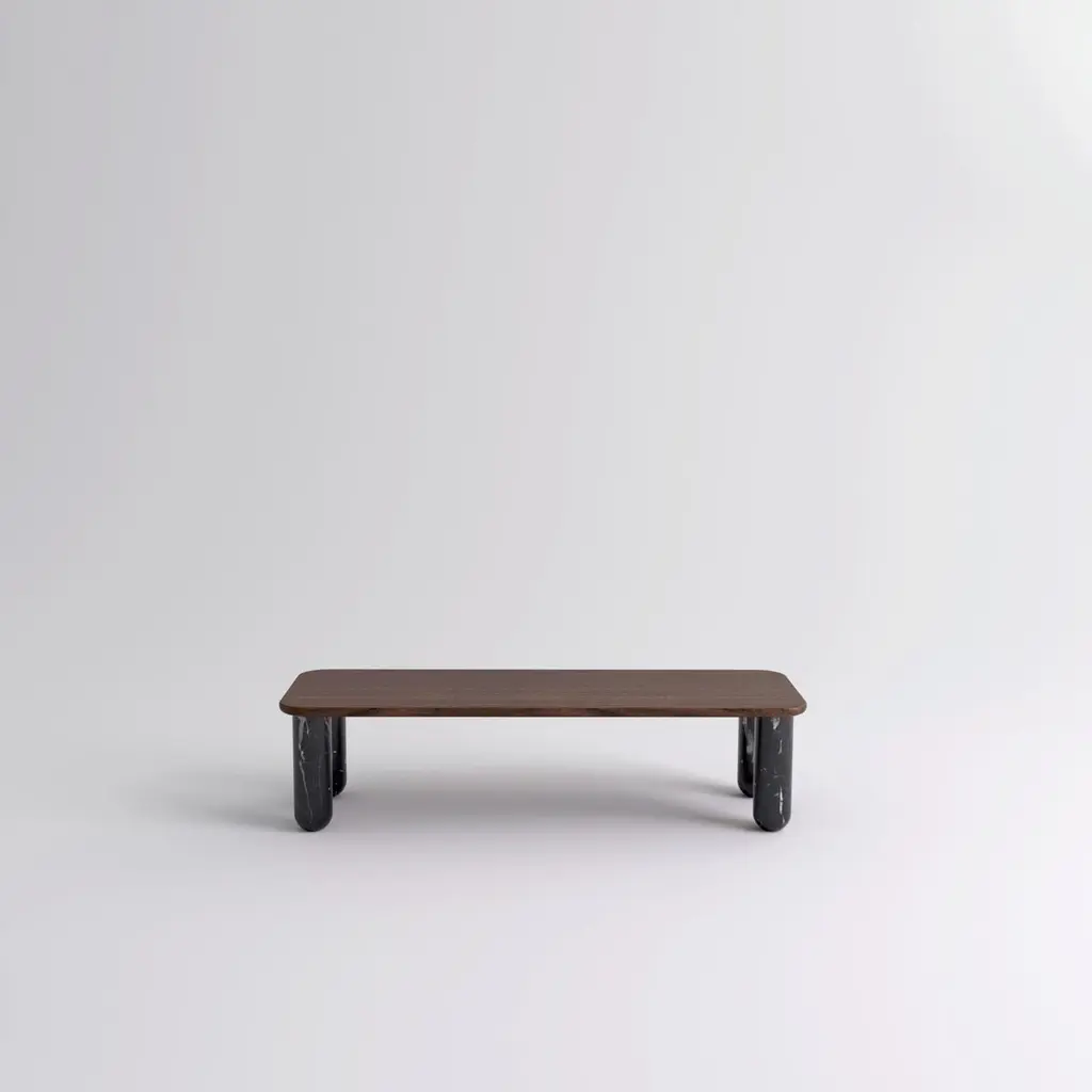 Small walnut and black marble "Sunday" coffee table, Jean-Baptiste Souletie.Dimensions: 50 W x 150 D x 35 H cm.Materials: black Marquina marble legs, walnut wood top.Available in 4 sizes: D 150, W 50 / D 200, W 50 / D 150, W 100 / D 200, W 100.Available in 5 top materials: walnut / black stained wood / Pele de Tigre marble / black Marquina marble / Indian green marble.Available in 3 leg materials: Pele de Tigre marble / black Marquina marble / Indian green marble.Sunday is a family of coffee tables and low consoles with a simple and clean design vocabulary. The combination of heavy marble legs with the thin solid wood or marble top creates an interesting contrast while the rounded edges and generous proportions provide a comforting feeling.Jean-Baptiste Souletie is the co-founder of the furniture editor La Chance with Louise Breguet. He studied in India, worked for a merchant bank in London (where he designed their new offices), before working for an investment fund (where he redevised the graphic chart), and in the strategic department of a luxury goods company in Paris. He returned to his first loves, architecture and furniture, when he founded La Chance in 2012.