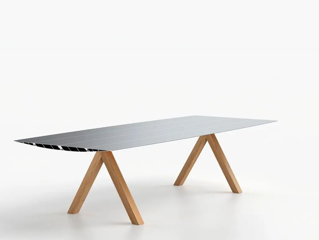Small wood table B by Konstantin GrcicDimensions: D 120 x W 240 x H 74 cm Materials: Tabletop in extrusioned aluminium with open ends cut at 45º. There is the option of the surface being laminated in a natural oak effect with a varnished finish. Legs in natural oak coated in transparent water-based varnish.Available in sizes: 300 cm, 360 cm, 400 cm and, 500 cm. Also available in Stainless Steel or Wood Legs. Finishes available for tabletop: Anodized silver or laminated.Table B can reach up to five metres using a simple profile of extruded aluminium. Its apparent simplicity covers a complex technical development where important engineers have participated. The result is a piece of excelling craftsmanship, carrying the German designers character. Silver Delta Award 2009 winner. Konstantin Grcic opened the Extrusions collection with the Table B, in 2009. Grcic has been inspired by classic BD pieces, such as the Hypóstila shelf unit (in production since 1979), in developing a tabletop of extruded aluminium with a minimal profile and for lengths of up to 500 cm.In 1972, a group of young architects and designers from Barcelona created BD with the aim of producing and marketing furniture and other objects for our projects, with complete creative freedom and with a criterion that has turned out to be quite different from the norm at companies in the sector, regarding both the shape and function.
