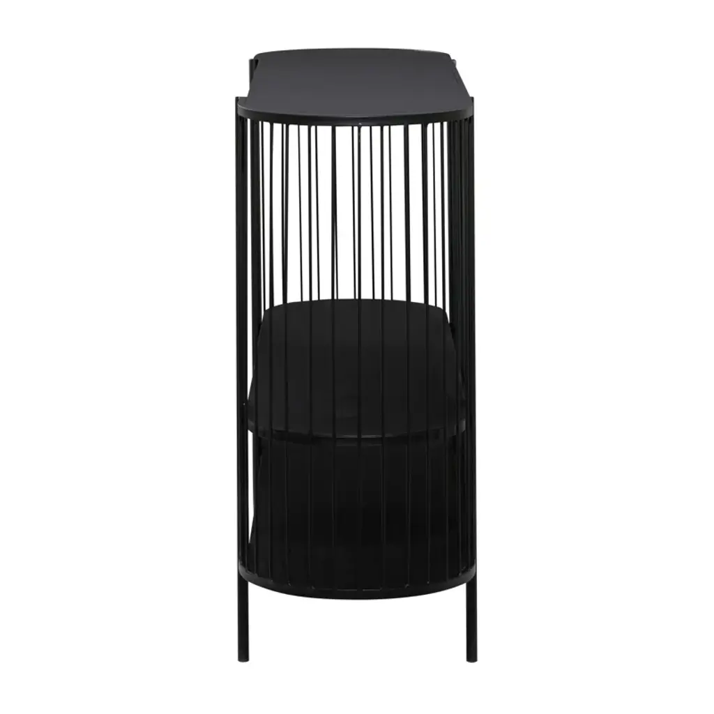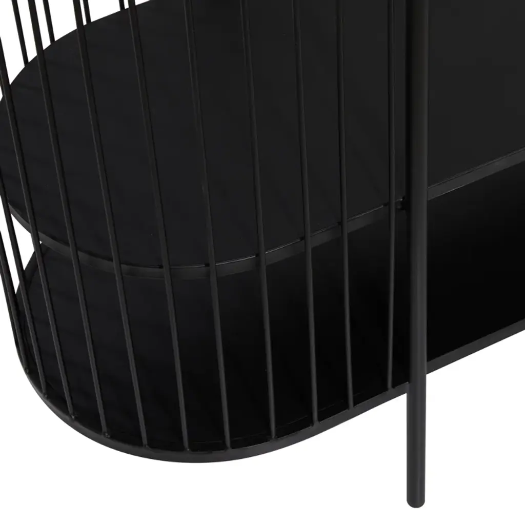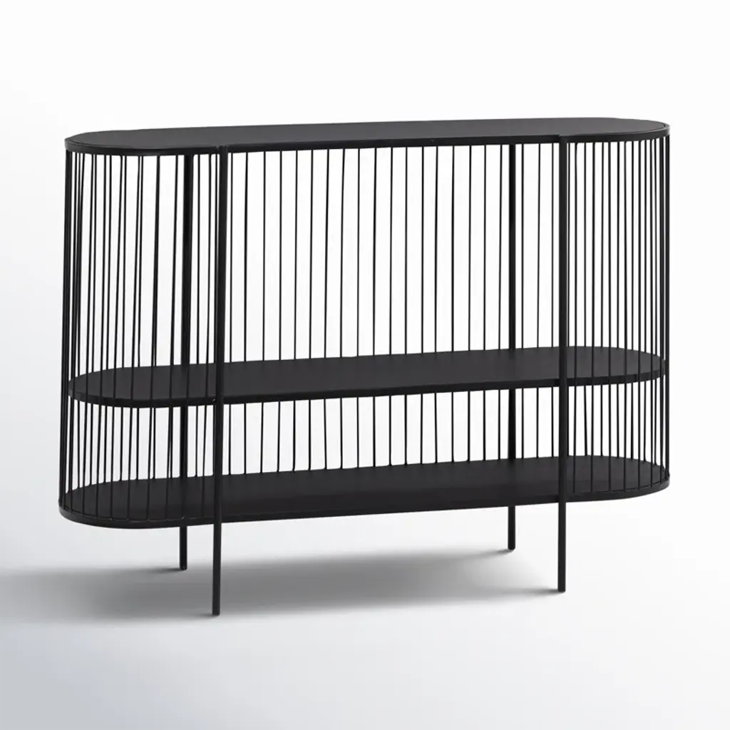 This modern console table makes a bold statement in your living room or entryway. Crafted with wrought iron in a black finish, this oval table's exterior frame features a caged design that embraces the table's back and sides. It's supported by four slim, cylindrical legs that extend to the tabletop. A large opening in the front gives you access to two tiers of shelving. And at 47.5" wide, this console table is sized right for displaying books, framed prints, and decorative accents. No assembly is required.