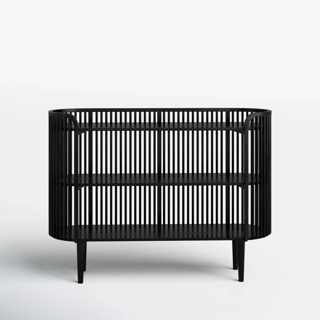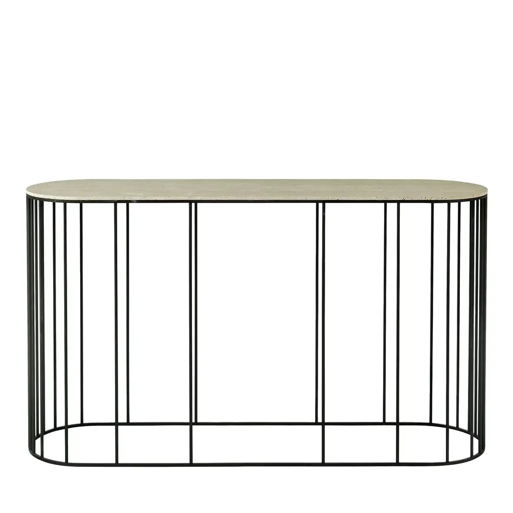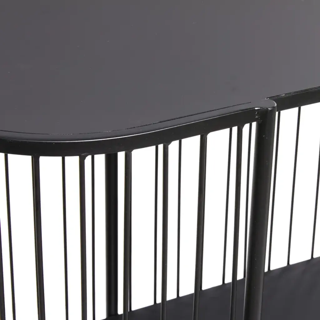 This modern console table makes a bold statement in your living room or entryway. Crafted with wrought iron in a black finish, this oval table's exterior frame features a caged design that embraces the table's back and sides. It's supported by four slim, cylindrical legs that extend to the tabletop. A large opening in the front gives you access to two tiers of shelving. And at 47.5" wide, this console table is sized right for displaying books, framed prints, and decorative accents. No assembly is required.