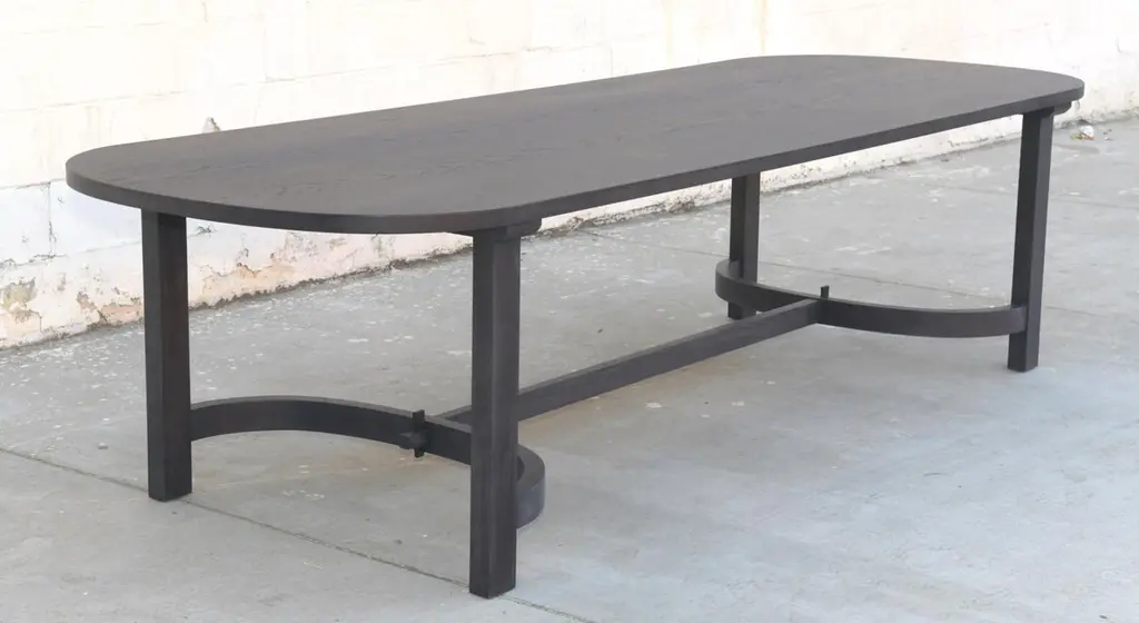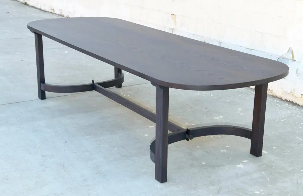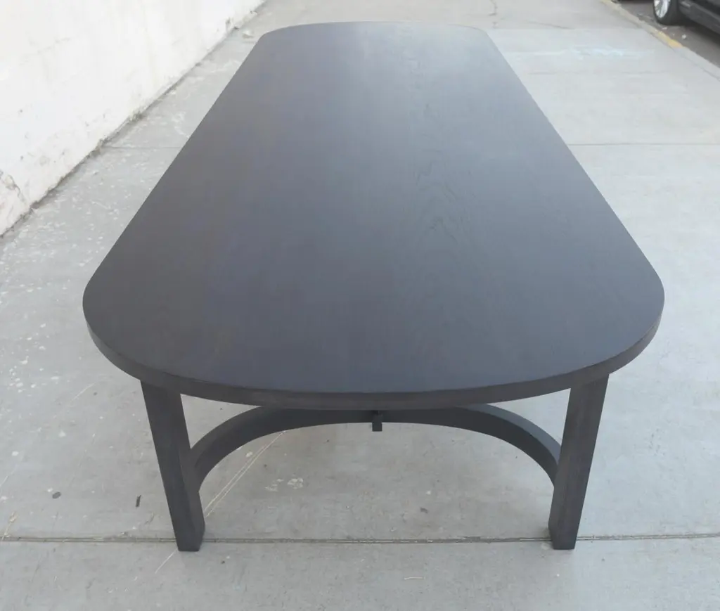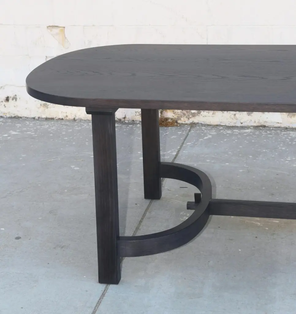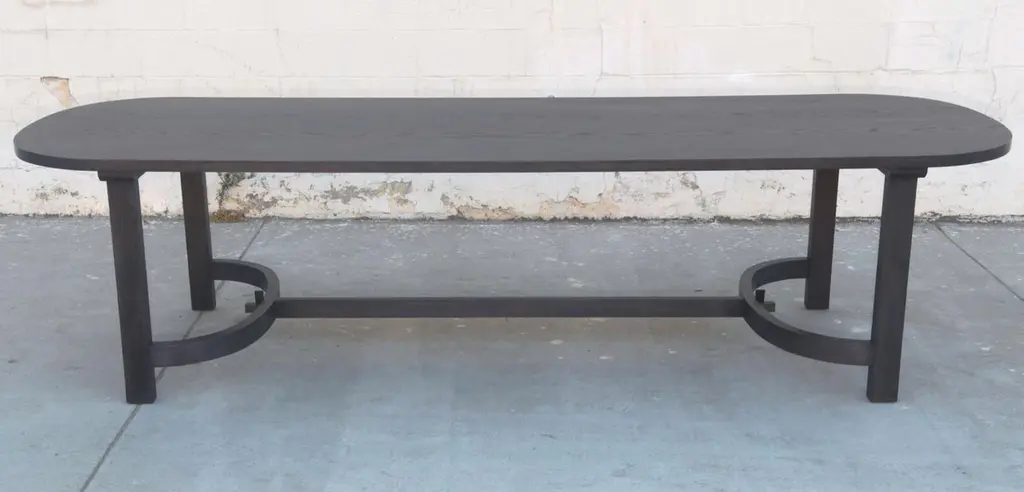This ebonized racetrack table, designed in collaboration with Jake Alexander Arnold, is seen here in 120" x 42" however it can be built in any size. Because each table is bench-made in our own Los Angeles workshop you can influence all aspects of design, including size, wood species and finish. We use only traditional carpentry techniques, no nails or metal fasteners of any kind. Just mortise and tenon construction reinforced with hand-cut wooden dowels.